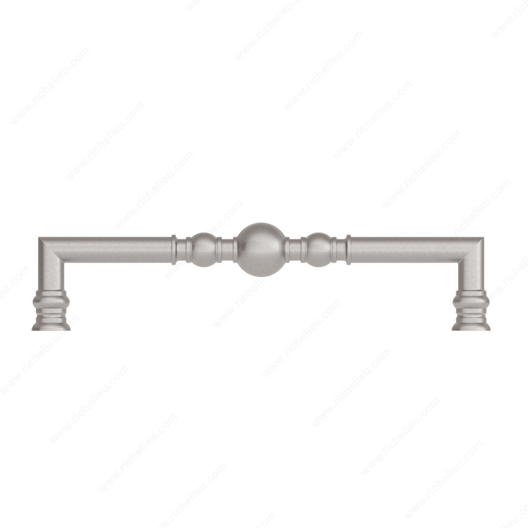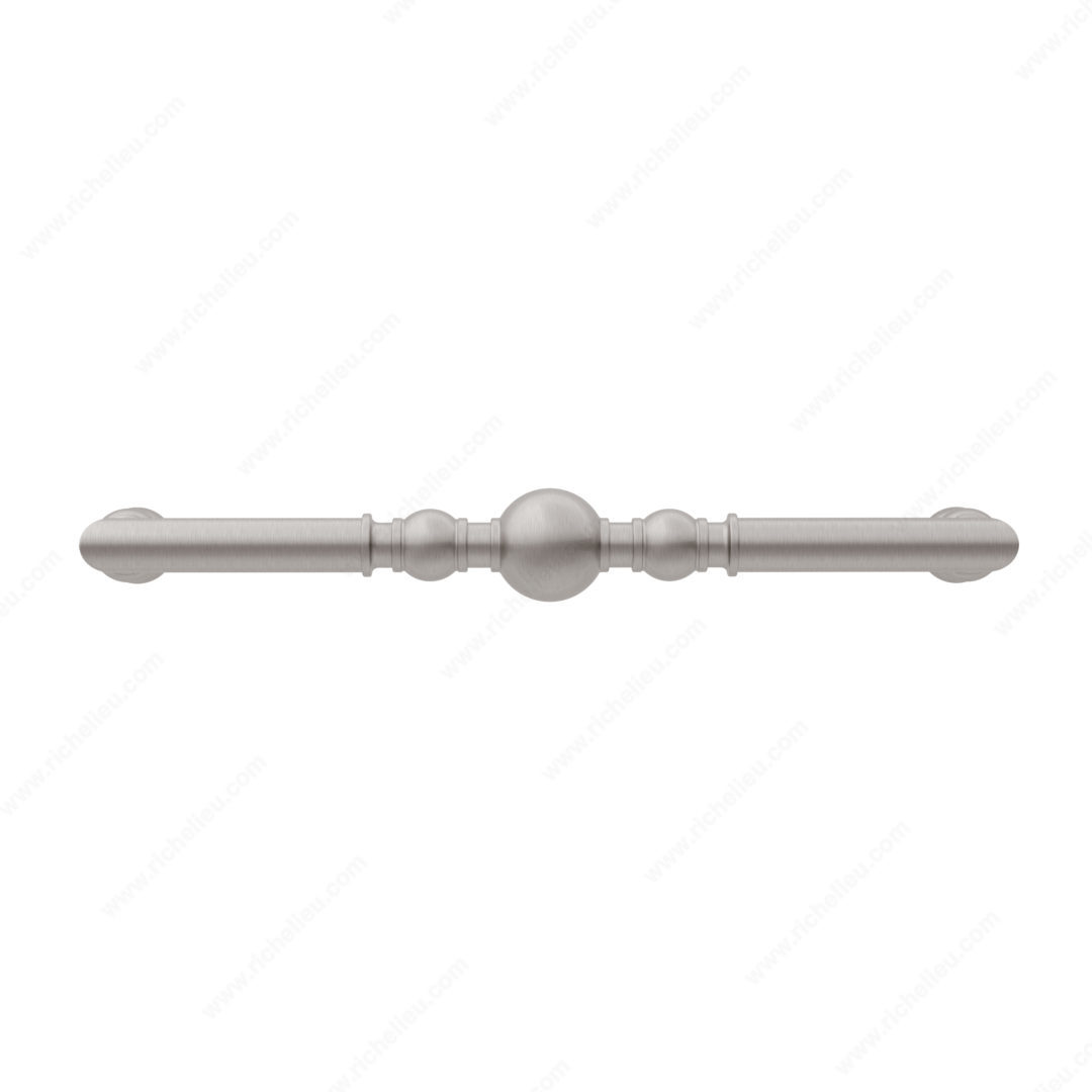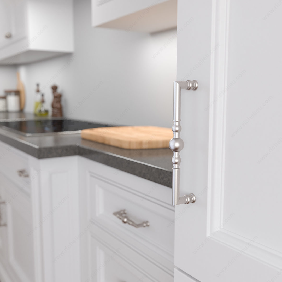 Richelieu BP8789192195 Traditional Metal Pull - 8789 brings an elegant touch to any cabinetry or furniture piece with its beautifully crafted design. The captivating symmetry of beads and rings along the handle infuses sophistication into both modern and classic interiors. With a center-to-center measurement of 7 9/16 inches, this pull is an ideal choice for a variety of applications, making it versatile for numerous projects. Constructed from durable zamak, the pull features a brushed nickel finish that not only enhances its aesthetic appeal but also ensures longevity and resistance to wear. The overall dimensions of the pull measure 8 9/32 inches in length, 31/32 inches in width, and project 1 31/32 inches from the mounting surface, providing a comfortable grip while maintaining a sleek profile. Each pull comes packaged in a convenient bag and includes screws for easy installation, allowing for a hassle-free upgrade to your space. Available in a chic gray and chrome color combination, the BP8789192195 is part of Richelieu's New Collection, ensuring you have access to the latest in design trends. Elevate your cabinetry with this exquisite traditional pull, perfect for any discerning homeowner or building professional seeking style and functionality.
