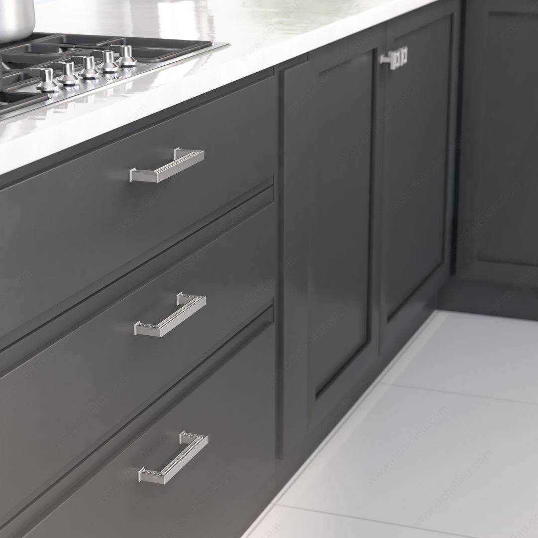 Richelieu BP8795128195 Transitional Metal Pull - 8795 offers a perfect blend of elegance and functionality, making it an exceptional choice for both modern and traditional interiors. The unique design features exquisite beading along the sides, complemented by clean edges that create a striking transitional aesthetic. Crafted from durable Zamak, this pull is finished in brushed nickel, providing both style and longevity. With an overall length of 5 5/8 inches and a center-to-center measurement of 5 1/32 inches, this pull is versatile enough to fit a variety of cabinetry and furniture styles. The projection of 1 15/32 inches ensures a comfortable grip, enhancing usability. The pull's width measures 19/32 inches, making it a substantial yet refined addition to your decor. Included with the pull are 8/32 inch screws, ensuring effortless installation. Designed to ship via UPS, the BP8795128195 is part of Richelieu's new collection, promising to elevate your spaces with a touch of sophistication. Whether you're outfitting a kitchen, bathroom, or any living space, this transitional pull brings both beauty and practicality to your design project.