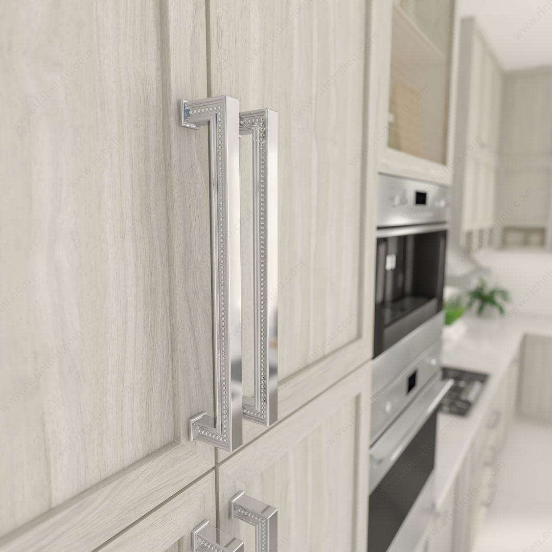Richelieu BP8795320140 Transitional Metal Pull - 8795 showcases an elegant beading design that enhances its transitional style, perfectly blending classic and contemporary aesthetics. Measuring 13 5/8 inches in overall length with a center-to-center spacing of 12 5/8 inches, this pull provides both functionality and visual appeal for any cabinetry or furniture project. Crafted from durable zamak, it ensures longevity while maintaining a refined look. The pull features a chrome finish with a striking gray accent, making it a versatile addition to various design schemes. With a projection of 2 5/32 inches, it offers a comfortable grip, allowing for effortless opening and closing of drawers and doors. The included 8/32 inch screws simplify installation, making it easy to upgrade your space without the need for additional hardware. Part of the New Collection, this pull is not just a functional accessory but also a statement piece that elevates the overall design of your interiors. Whether you're focusing on modern or transitional styling, the Richelieu BP8795320140 serves as a perfect finishing touch, embodying quality and sophistication in every detail. Enhance your living spaces with this eye-catching and practical hardware solution.