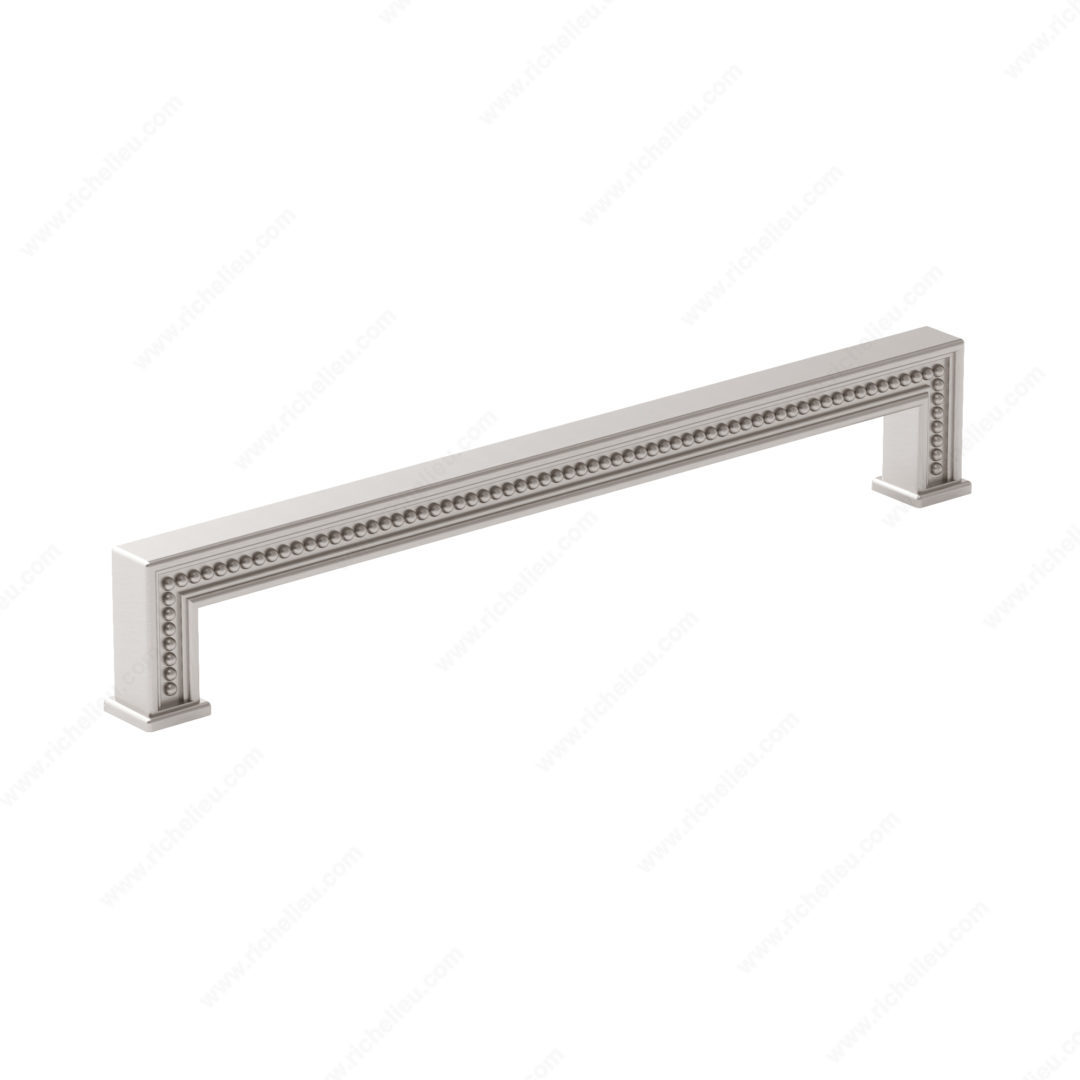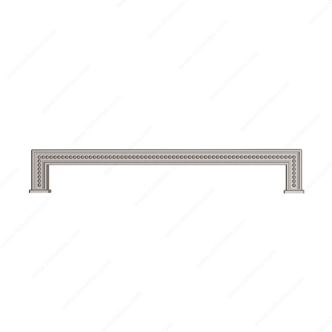 Richelieu BP8795320195 Transitional Metal Pull - 8795 embodies elegance and sophistication with its thoughtfully designed features. The pull showcases a unique transitional style, characterized by its refined beading along the sides and clean edges that create a striking visual impact. Crafted from durable zamak, this pull offers both strength and style, making it an ideal choice for any cabinetry or furniture project. With a center-to-center measurement of 12 5/8 inches, the BP8795320195 is versatile enough to fit seamlessly into various designs. The overall dimensions are 13 5/8 inches in length, 31/32 inches in width, and a projection of 2 5/32 inches, ensuring a comfortable grip while enhancing the overall aesthetic. The brushed nickel finish in a sleek gray and chrome color scheme further elevates its appeal, ensuring it complements a range of interior styles. This pull is part of Richelieu's new collection, confirming its modern relevance in today’s market. Installation is straightforward, with 8/32 inch screws included for your convenience. For builders and discerning homeowners alike, the Richelieu BP8795320195 is a stylish addition that combines functionality with a timeless design.