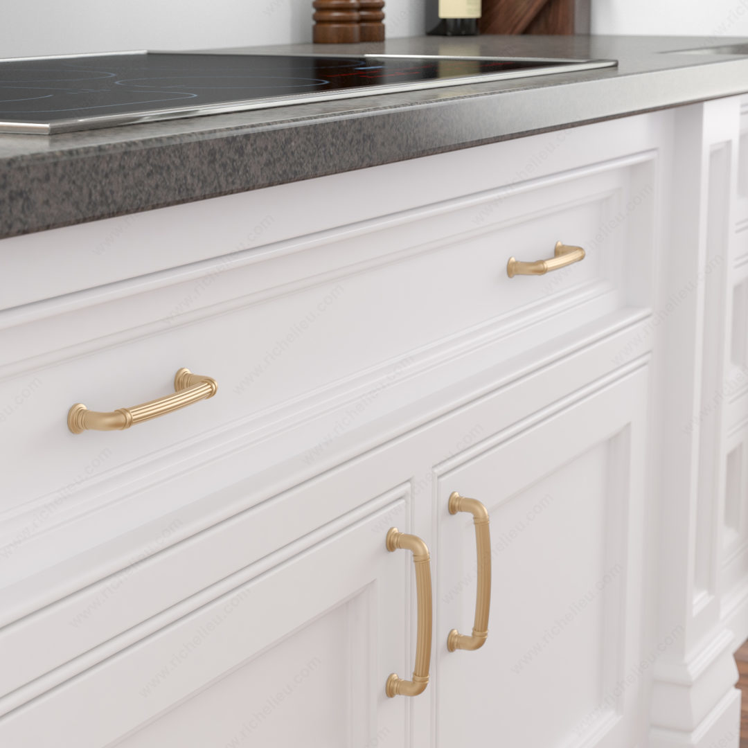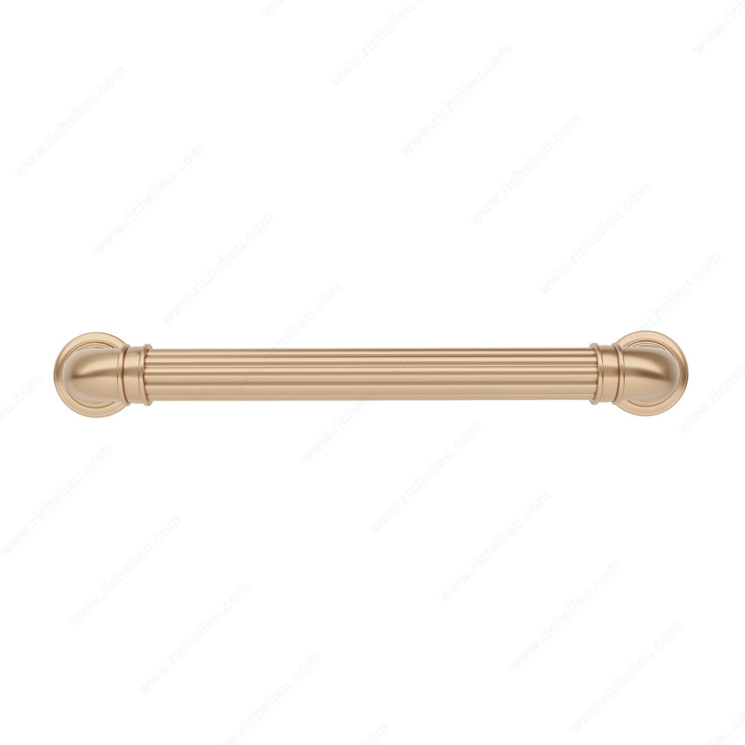 Richelieu BP8818128CHBRZ Traditional Metal Pull - 8818 offers a sophisticated touch to cabinets and drawers with its elegant design. The unique fluted texture of the pull beautifully contrasts with the smooth, embellished bases, creating a striking visual appeal that enhances any traditional décor. Crafted from durable zamak, this pull combines strength with style, ensuring longevity and resilience in high-use environments. With a center-to-center measurement of 5 1/32 inches, it is designed to fit seamlessly into various cabinetry applications. The overall length of 5 13/16 inches and a projection of 1 15/32 inches provides ample grasp for comfortable use. Finished in a warm Champagne Bronze, this pull adds a touch of luxury while complementing a variety of color palettes. The pull's dimensions include a diameter of 15/32 inches and a width of 25/32 inches, making it a perfect fit for both modern and classic interiors. Each pull is packaged in a convenient bag and includes an 8/32 inch screw for easy installation. As part of the new collection, the BP8818128CHBRZ is not just a functional hardware piece; it is an essential element for elevating your cabinetry aesthetic.