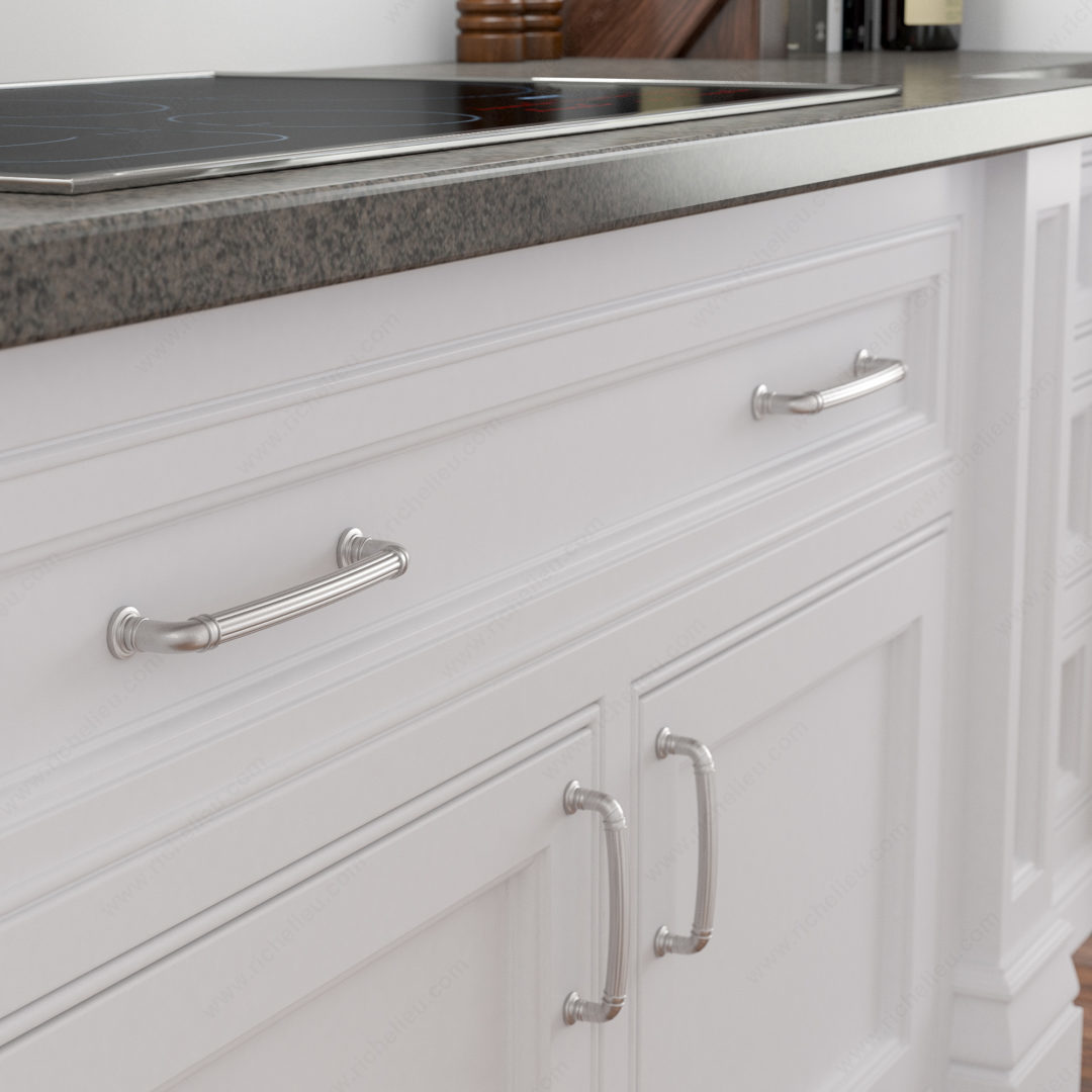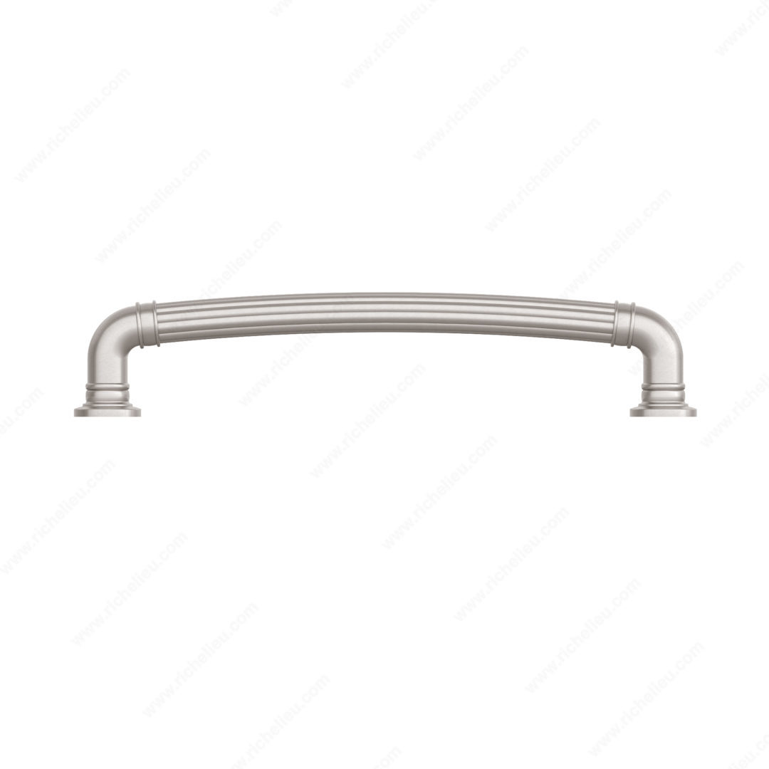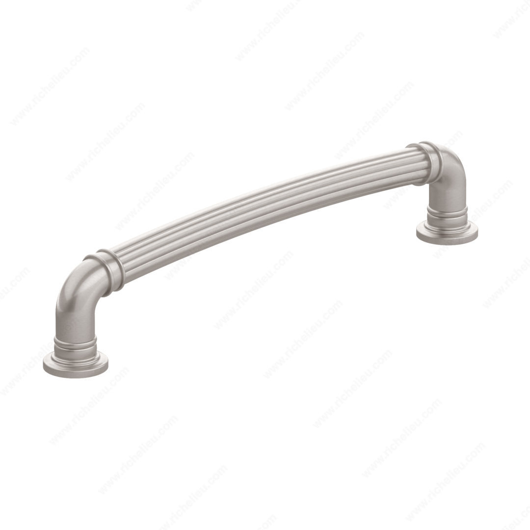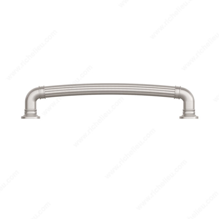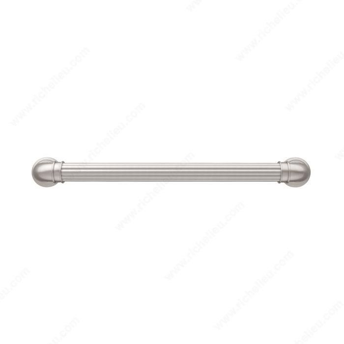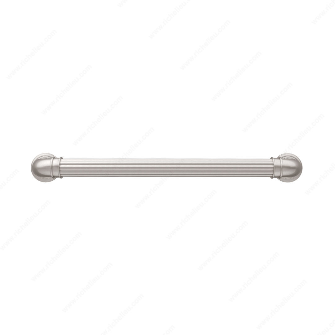 Richelieu BP8818192195 Traditional Metal Pull - 8818 showcases a stunning design that combines elegance and functionality. The fluted texture of this pull contrasts beautifully with its smooth posts, each featuring embellished bases that add a touch of sophistication to any cabinetry or furniture piece. Measuring 8 15/32 inches in length with a center-to-center measurement of 7 9/16 inches, this pull is perfectly sized for a variety of applications. Crafted from durable zamak, the pull boasts a brushed nickel finish that enhances its contemporary yet classic look, available in a refined gray and chrome color scheme. The overall diameter of 9/16 inches and a projection of 1 11/16 inches ensure a comfortable grip, making it both stylish and practical. The BP8818192195 is part of the New Collection and complements the entire 8818 model line, making it easy to incorporate into existing designs. Included with this pull are 8/32 inch screws for easy installation, packaged conveniently in a bag for your convenience. This traditional pull is ideal for professionals and homeowners looking for a reliable hardware solution that exudes timeless charm and durability.