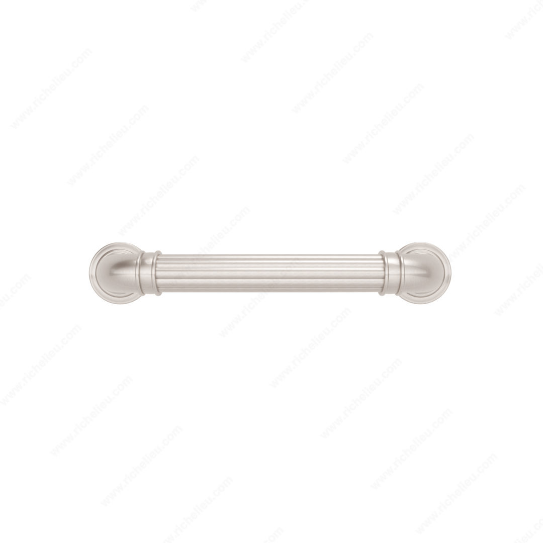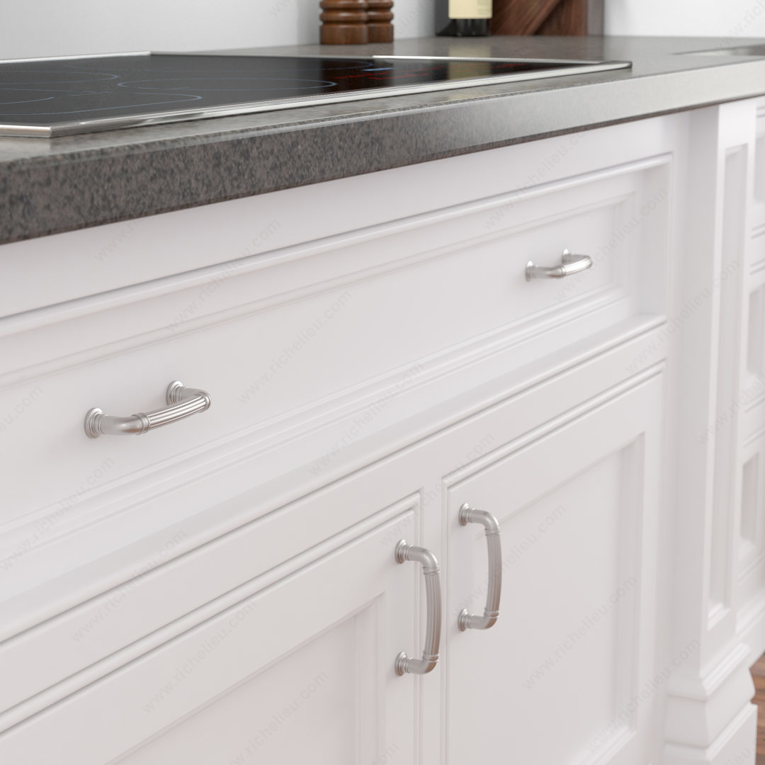 Richelieu BP881896195 Traditional Metal Pull - 8818 showcases a stunning fluted texture that beautifully contrasts with its smooth posts, each adorned with embellished bases. This elegant pull is designed for those seeking a blend of classic style and modern functionality, making it perfect for a variety of cabinetry and furniture applications. With a center-to-center measurement of 3 25/32 inches, this pull is versatile enough to fit seamlessly into many design schemes. It features a brushed nickel finish that adds a sophisticated touch, while the gray and chrome color combination enhances its visual appeal. Constructed from durable zamak, the BP881896195 ensures longevity and resistance to wear. Measuring 4 9/16 inches in length, 25/32 inches in width, and 1 15/32 inches in projection, this traditional pull is both functional and stylish. The package includes 8/32 inch screws for easy installation, allowing you to transform your space with minimal effort. Part of the New Collection, the BP881896195 is designed for those who appreciate fine details in their home decor. Elevate your cabinetry with this exquisite pull that embodies timeless elegance and practicality.