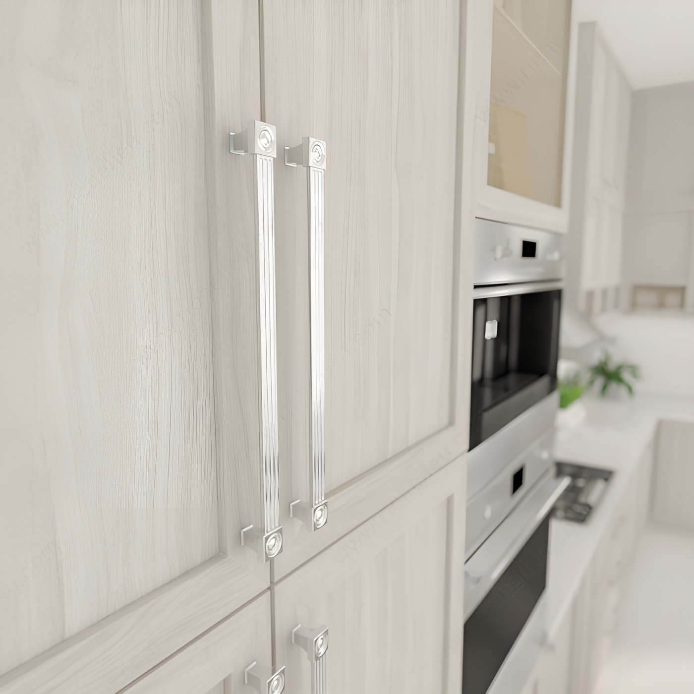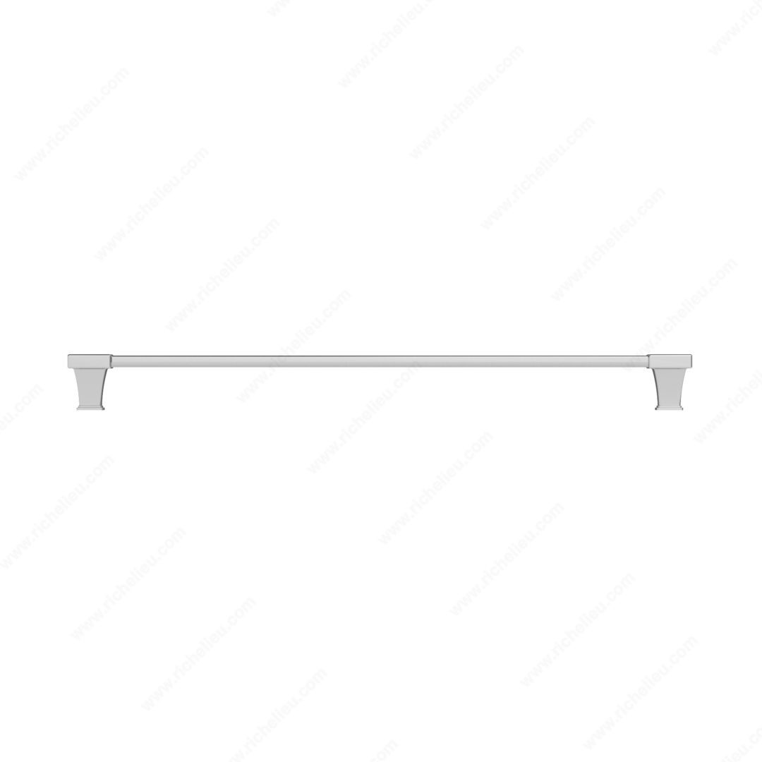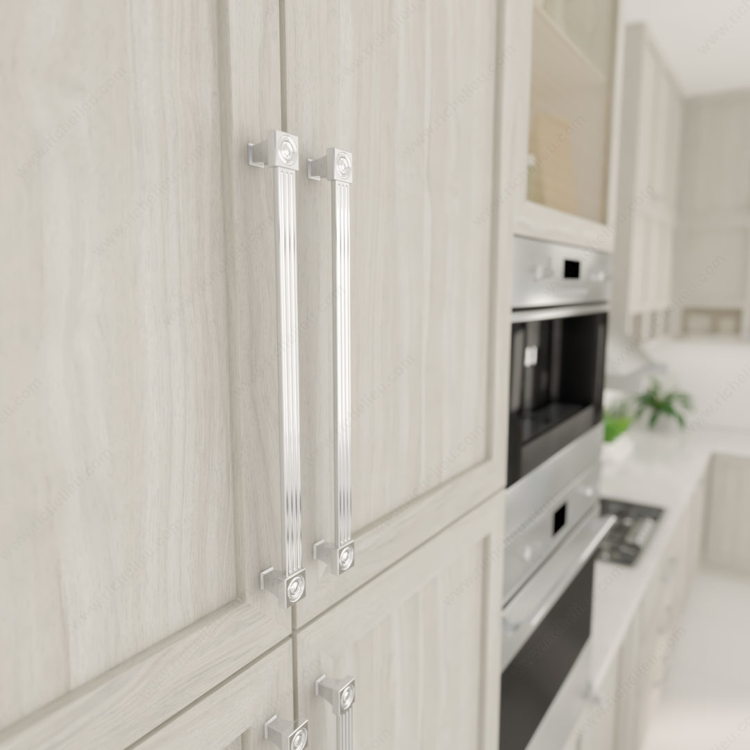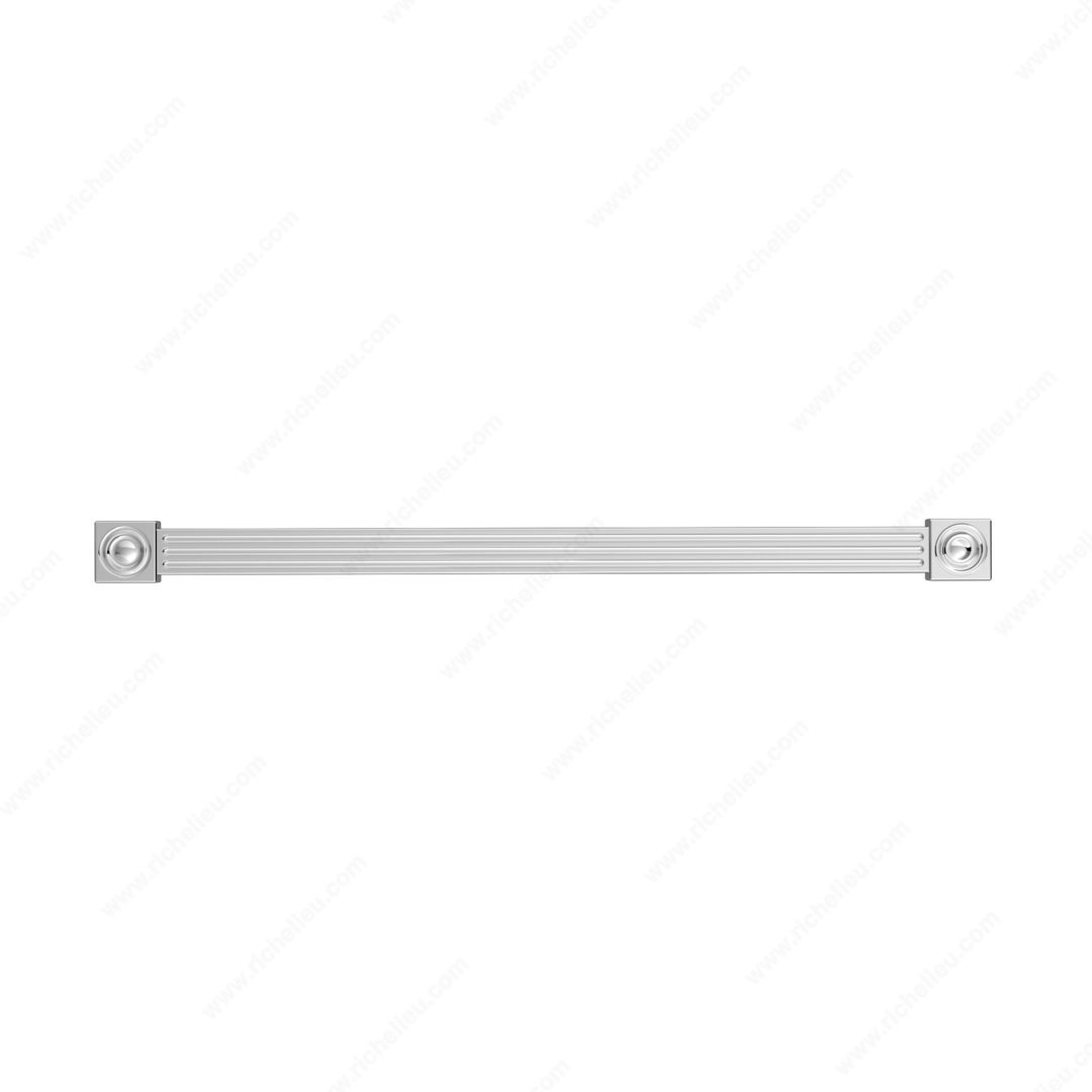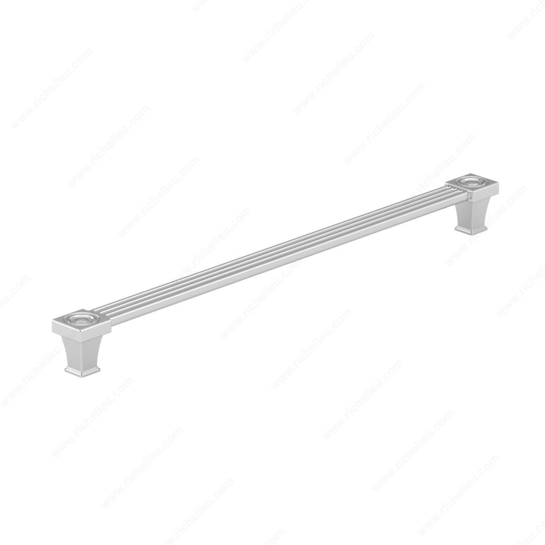 Richelieu BP8822320140 Transitional Metal Pull - 8822 showcases a stunning blend of modernity and classic elegance, inspired by art deco and Greek architectural textures. This transitional pull is an ideal choice for those looking to enhance their cabinetry or furniture with a sophisticated touch. Crafted from durable zamak, it features a sleek chrome finish that complements a wide range of interior styles, adding both functionality and aesthetic appeal to your spaces. With an overall length of 13 1/2 inches and a center-to-center measurement of 12 5/8 inches, this pull is designed for easy installation and accessibility. The projection of 29/32 inches ensures a comfortable grip, making it practical for everyday use. Additionally, the included 8/32 inch screws facilitate quick and hassle-free mounting. The BP8822320140 is part of the New Collection, promising quality and design innovation. Its gray and chrome color scheme allows it to seamlessly integrate with various color palettes and materials. Whether you are updating your kitchen, bathroom, or any other living space, this transitional pull provides a stylish solution that resonates with both building professionals and discerning homeowners. Elevate your interiors with Richelieu's exquisite craftsmanship and timeless design.