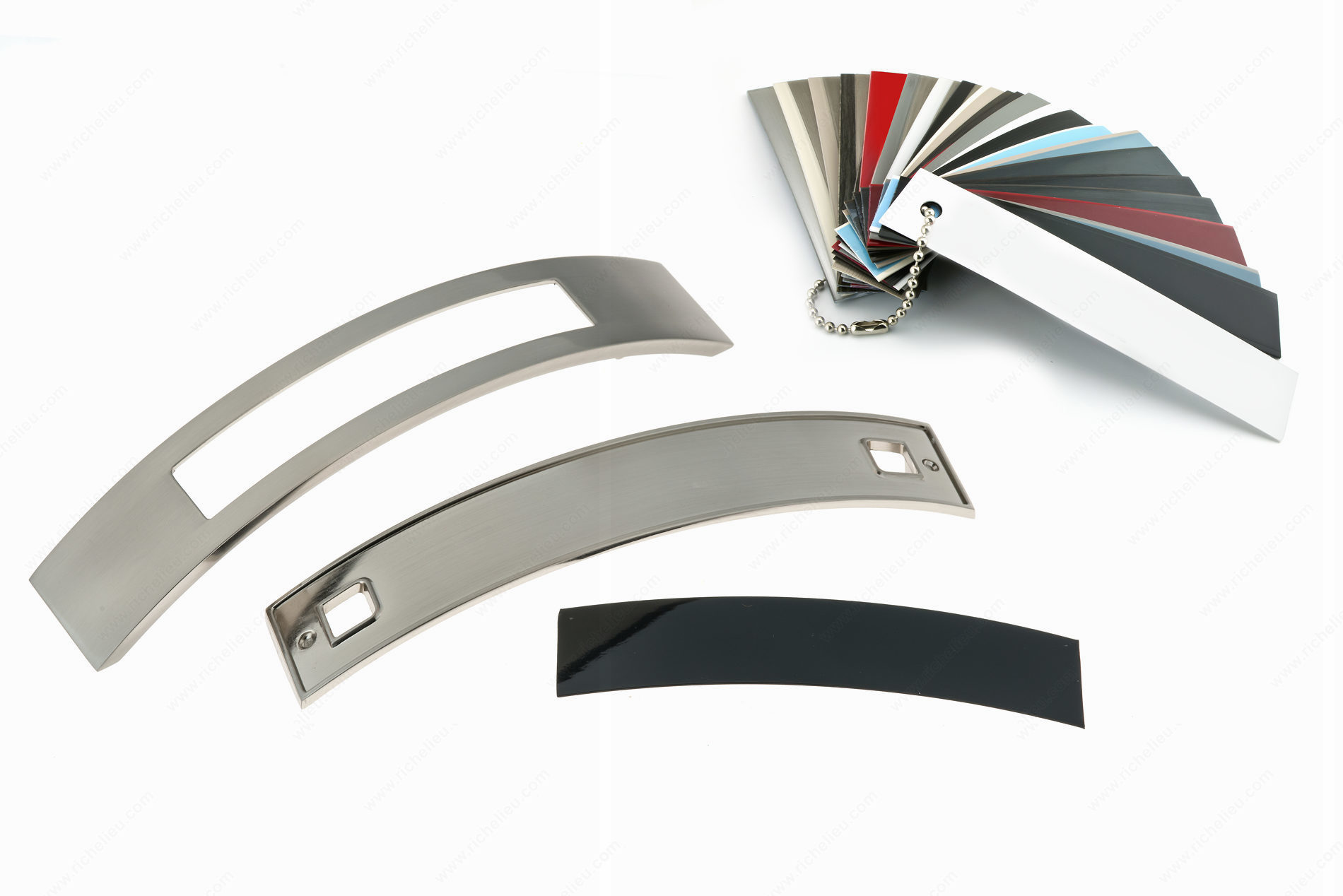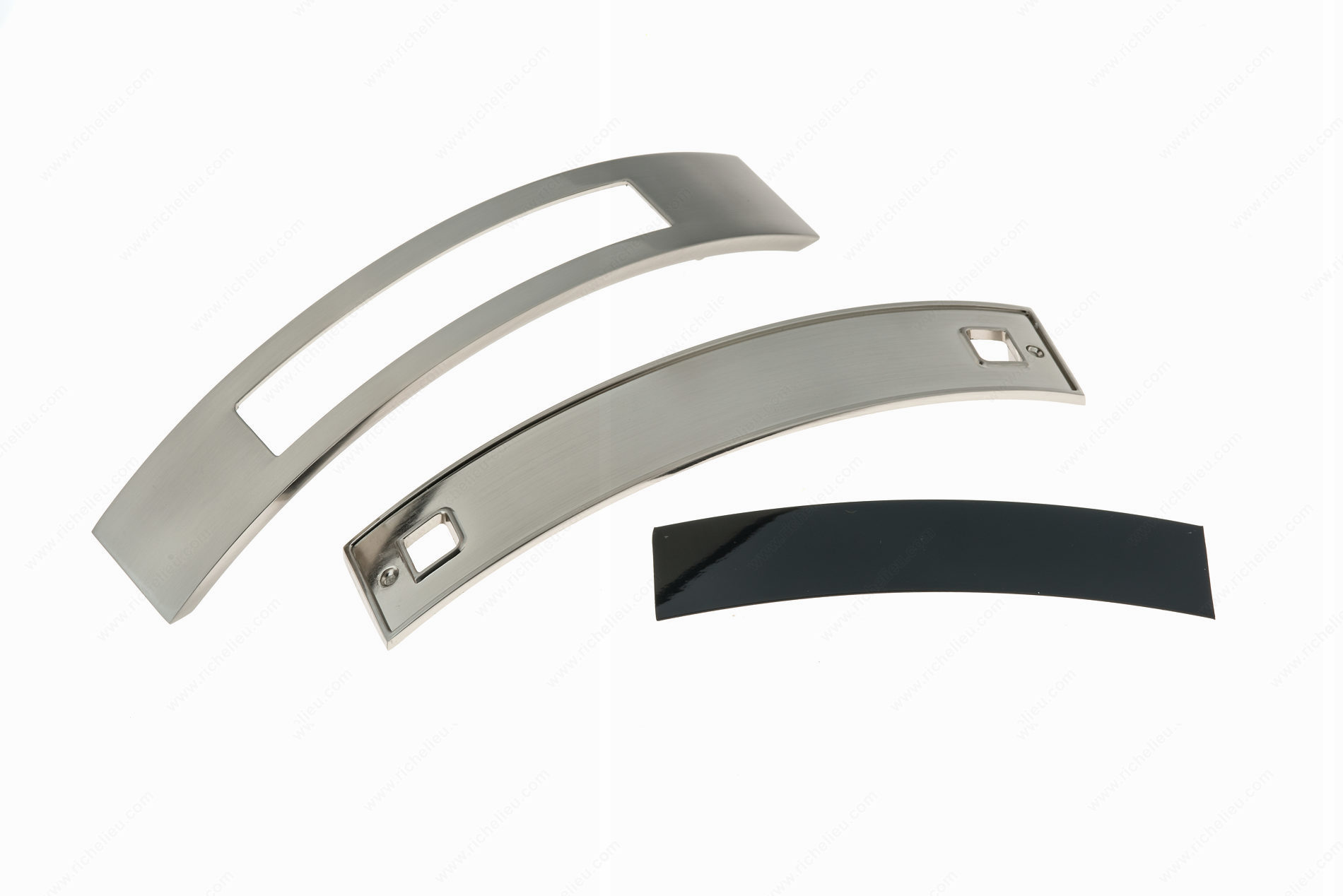 Richelieu BP8877128195 Modern Metal Pull - 8877 offers a sophisticated and versatile solution for enhancing your furniture and cabinetry. This modern handle features an innovative design that allows for the addition of edgebanding in a color of your choice, with a sleek black finish included for immediate use. Crafted from durable metal, this pull boasts a brushed nickel finish that adds a refined touch to any space. With overall dimensions of 6 25/32 inches in length, 1 1/4 inches in width, and a projection of 1 3/8 inches, it fits seamlessly into contemporary designs. The center-to-center measurement of 5 1/32 inches ensures compatibility with a variety of cabinetry styles. Part of Richelieu’s New Collection, this modern pull is not only stylish but also functional, making it an ideal choice for both professional builders and discerning homeowners. The product includes 8/32 inch screws for easy installation, allowing you to enhance your spaces with minimal effort. Available for convenient shipping via UPS, the Richelieu BP8877128195 is a perfect addition to your design toolkit, combining aesthetic appeal with practical functionality. Elevate your projects with this striking metal pull that embodies modern elegance.