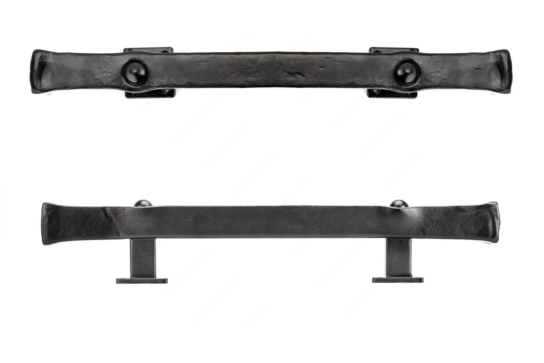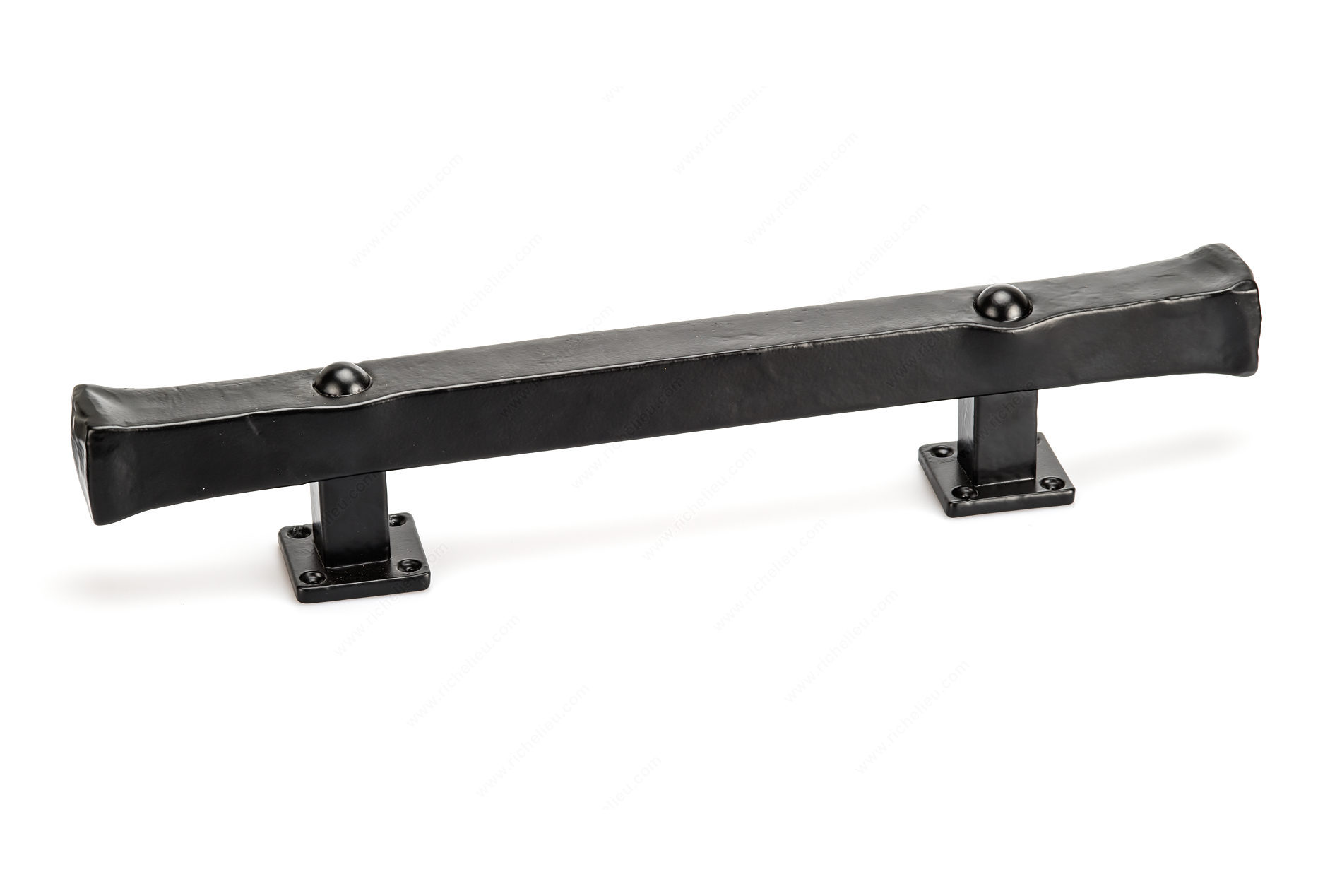 Richelieu BP9463280900 Traditional Forged Iron Pull - 9463 is a striking addition that captures the essence of industrial-era design. Crafted from durable forged iron, this massive rustic pull not only enhances the aesthetic of your doors but also embodies a robust and timeless appeal. With an overall length of 17 3/8 inches and a projection of 3 5/32 inches, it provides a substantial grip that is both functional and stylish. The matte black finish offers a sophisticated touch while ensuring durability and resistance to wear. With a center-to-center measurement of 11 inches, it is ideal for barn doors and other surface application models, making it versatile for various interior designs. The pull's traditional style is perfect for homeowners and professionals seeking to create a classic look in modern spaces. Included with the pull are wood screws for easy installation, ensuring a hassle-free setup. Measuring 1 31/32 inches in width, this piece stands out with its bold dimensions and unique design. Elevate your home’s decor with the Richelieu BP9463280900 Traditional Forged Iron Pull, where functionality meets timeless style.