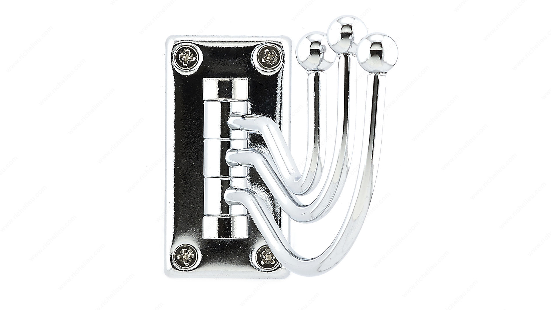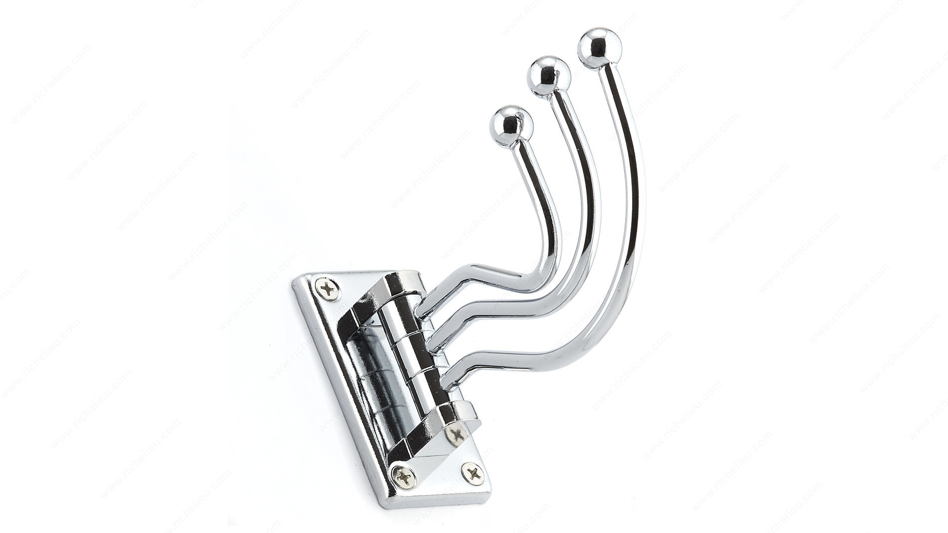 Richelieu BP97843140 Utility Swivel Hook - 978 is the perfect blend of style and functionality for any space in your home. This triple swivel hook boasts a sleek chrome finish with a contemporary gray accent, making it an ideal accessory for bedrooms, bathrooms, entryways, mudrooms, closets, and more. The innovative design features three arms that conveniently fold back when not in use, maximizing space and minimizing clutter. Crafted from durable metal, this utility hook can support a load capacity of up to 22 lbs, ensuring it can handle your everyday storage needs with ease. Measuring 3 1/32 inches in height, 4 13/32 inches in projection, and 1 11/16 inches in width, it is compact enough to fit in various locations without overwhelming the decor. The Richelieu BP97843140 comes with included screws and nails for straightforward installation on walls or doors, making it a practical choice for any DIY project. Whether you're looking to streamline your organization or add a touch of sophistication to your home, this swivel hook delivers both elegance and utility. Enhance your space today with this versatile and stylish accessory.