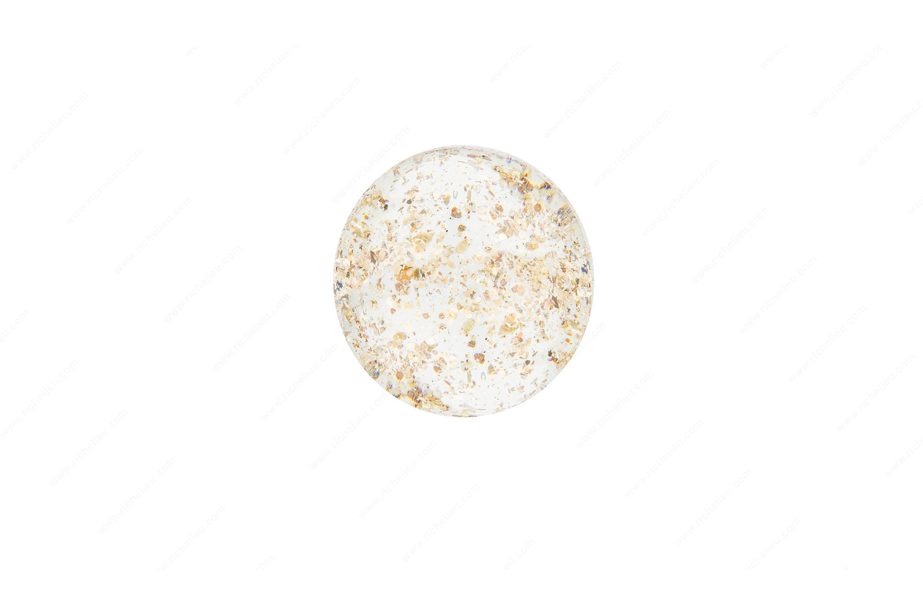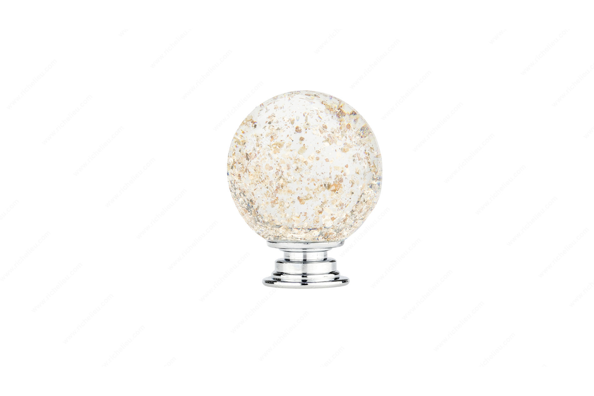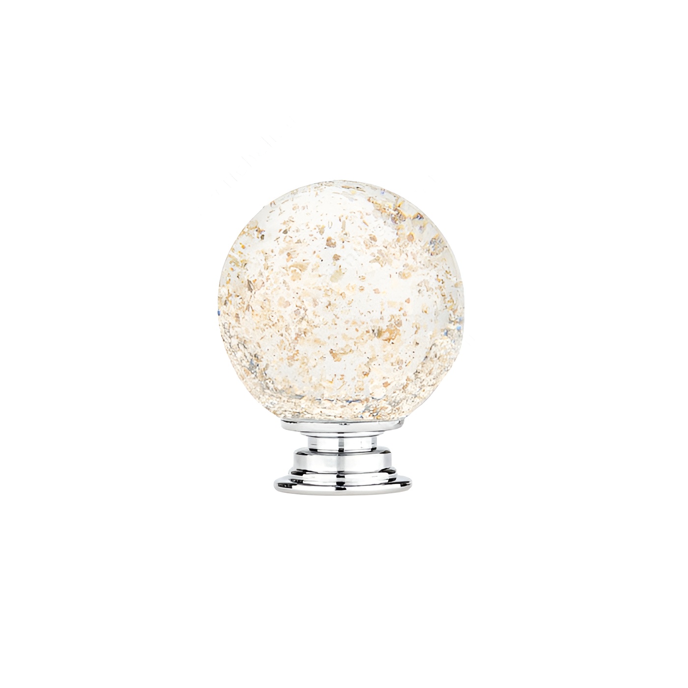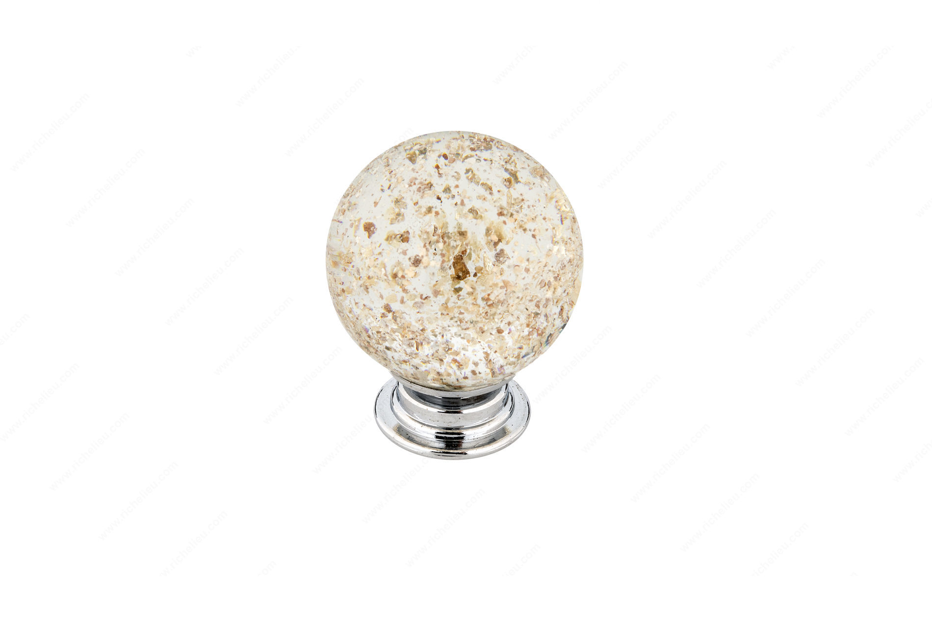 Richelieu BP992635M1 Eclectic Glass Knob - 9926 adds a touch of sophistication to any drawer front or cabinetry with its unique handmade design. Crafted with meticulous attention to detail, this glass knob features a stunning clear finish adorned with gold flecks, making each piece truly one-of-a-kind. The contrasting chrome base not only enhances its visual appeal but also ensures durability and strength. With an overall diameter of 1 3/8 inches and a projection of 1 27/32 inches, this knob is perfectly sized for comfortable grip and functionality. It supports a recommended maximum weight of 2 kg (approximately 4.4 lbs), ensuring that your drawers and cabinets operate smoothly while maintaining their stylish appearance. The knob's base diameter measures 13/16 inch, allowing for easy installation with the included 8/32 inch screw. Ideal for eclectic design themes, its versatile aesthetic makes it suitable for various applications, from modern to traditional interiors. Each knob may exhibit slight variations in pattern, size, and shape due to the handmade process, adding to its charm. Elevate your space with the Richelieu BP992635M1 Eclectic Glass Knob - 9926, where function meets artistry.