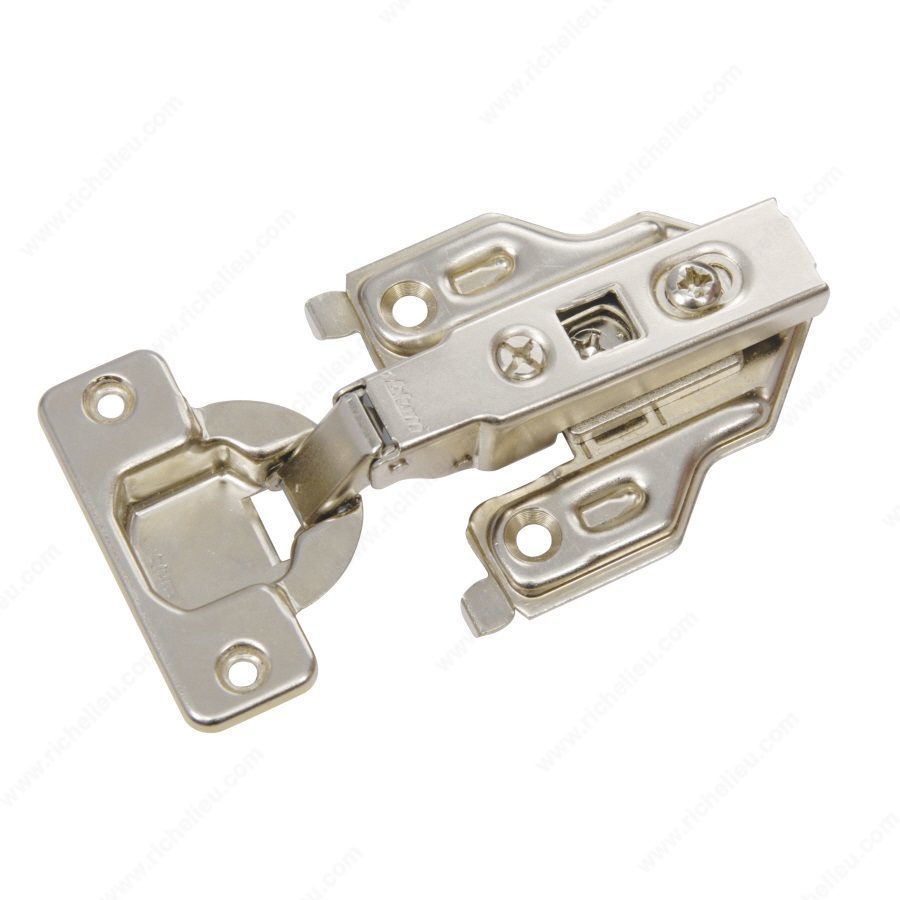 Richelieu BP71T55560180 CLIP top Hinge - 120 is designed to enhance the functionality and aesthetics of your cabinetry with its robust features. This hinge is ideal for face frame cabinets, accommodating a minimum cabinet and door thickness of 5/8 inches. Its full overlay design allows doors to completely cover the cabinet frame, providing a seamless appearance. With a maximum hinge opening angle of +120 degrees, you can enjoy easy access to your cabinets, making it perfect for both residential and commercial applications. The spring closing mechanism ensures that doors close gently and securely, enhancing user experience while preventing slamming. Installation is straightforward, thanks to the screw-on fixing type, and the hinge requires a milling depth of 1/2 inch, along with a milling diameter of 1 3/8 inches, ensuring a precise fit. Each package contains two hinges, making it convenient for multiple installations or replacement needs. Richelieu's commitment to quality is evident in this product, making it a reliable choice for builders and homeowners looking for durable and stylish hardware solutions. Whether you are upgrading existing cabinetry or embarking on a new project, the BP71T55560180 CLIP top hinge is an essential addition to your toolkit.
