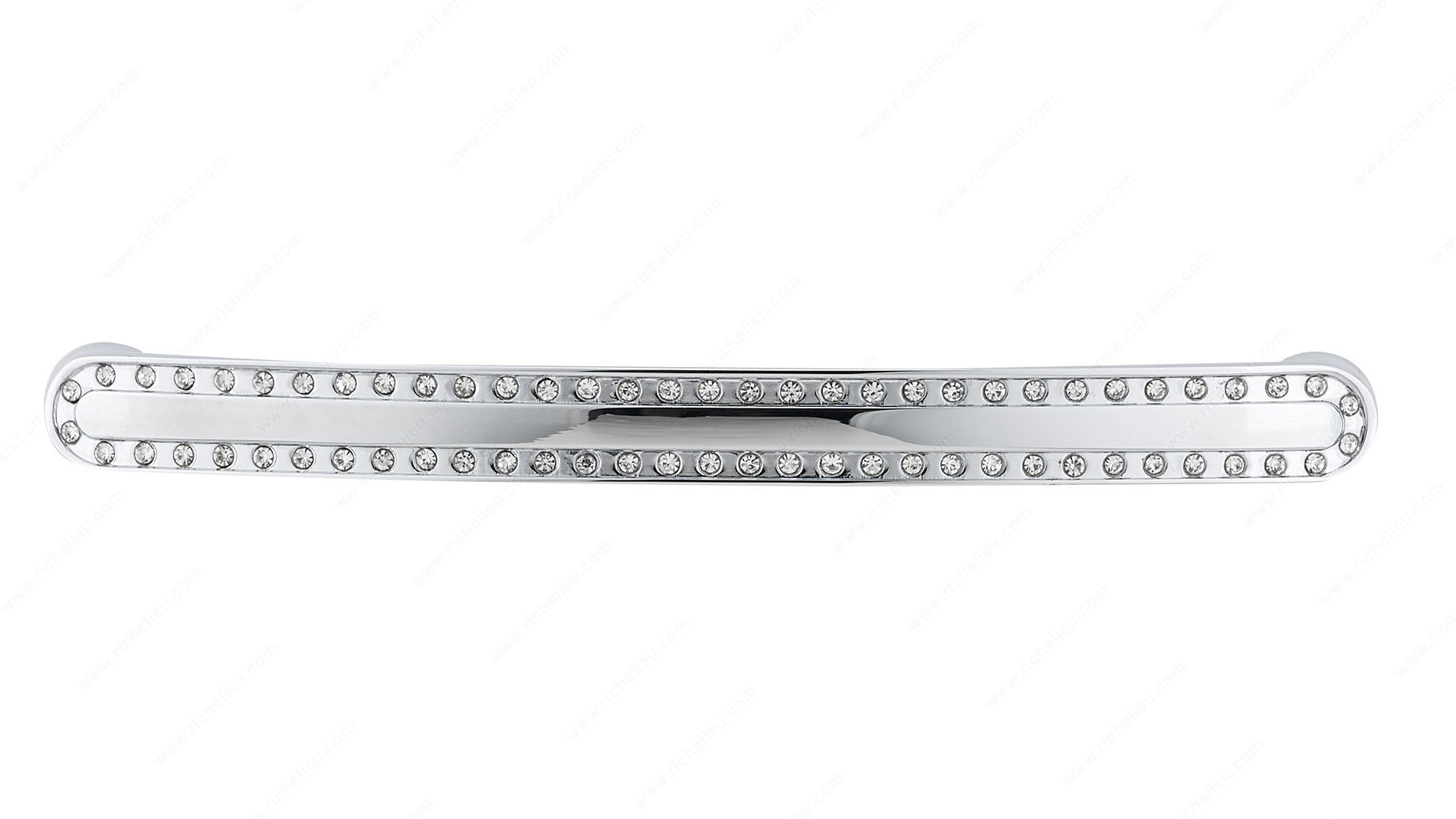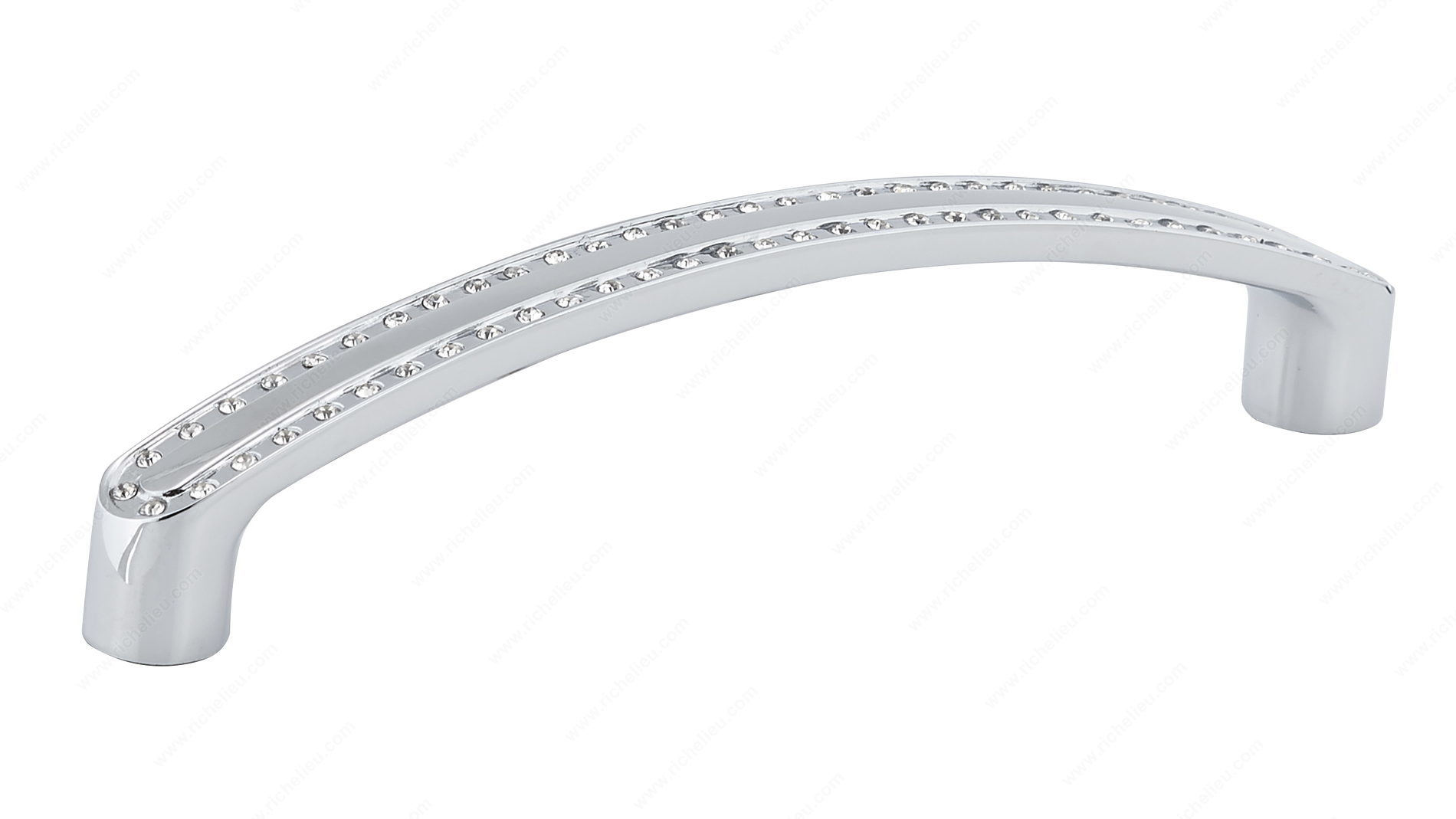 Richelieu BP272712814001 Modern Crystal and Metal Pull - 2727 offers an exquisite blend of sophistication and modern design for your cabinetry. Crafted with a chic chrome finish and adorned with crystal embellishments, this pull transforms ordinary cabinets and drawers into stunning focal points in any interior space. Measuring 5 9/16 inches in overall length, this pull features a center-to-center spacing of 5 1/32 inches, making it ideal for various cabinet styles. The elegant curved shape enhances its aesthetic appeal, while the combination of metal, crystal, and glass materials ensures durability without compromising style. With a projection of 1 1/8 inches and a width of just 1/2 inch, this pull is practical and comfortable to use. Richelieu's dedication to quality is evident in this modern pull, which is part of their New Collection. It comes complete with 8/32 inch screws for easy installation, making it a hassle-free addition to your home. Available in a sophisticated color palette of gray and chrome with clear crystal accents, this pull is perfect for both building professionals and discerning homeowners seeking to elevate their interior design.