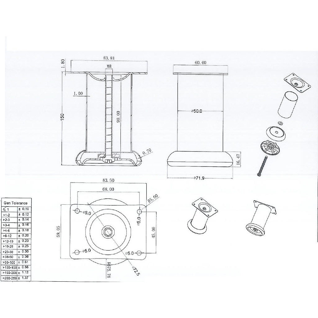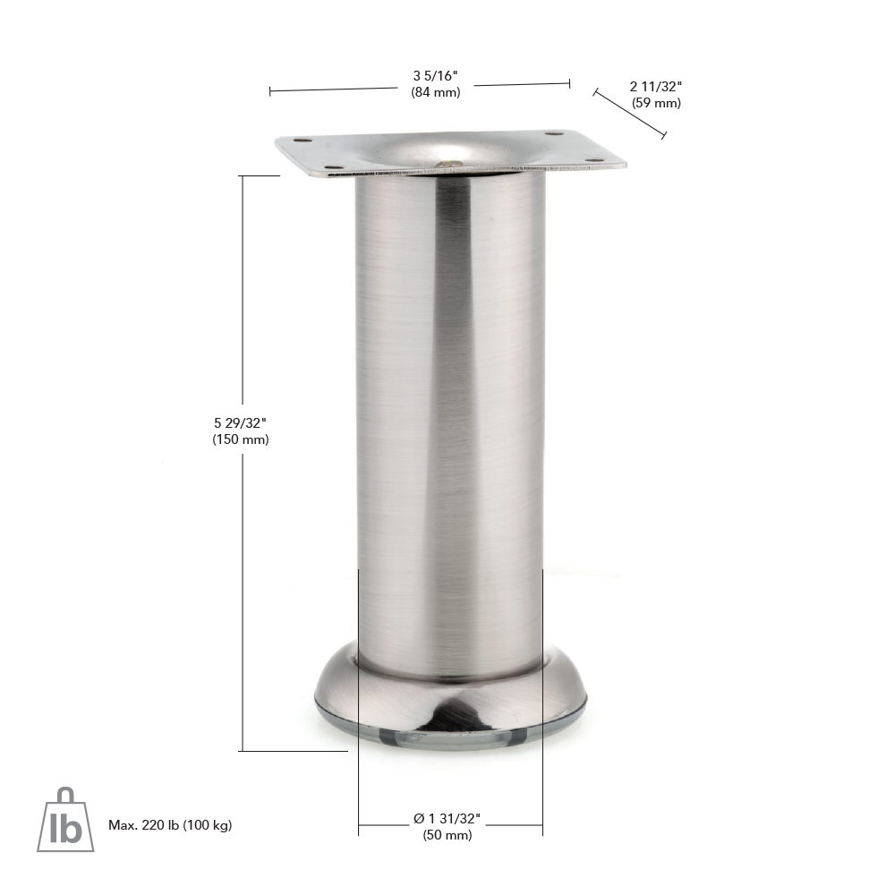 Richelieu 25650150195 Contemporary Furniture Leg is the perfect solution for enhancing the stability and aesthetics of your cabinets, closets, and garage units. Crafted from high-quality metal, this furniture leg blends functionality with a modern design, making it an ideal choice for contemporary spaces. The brushed nickel finish adds a sleek touch, ensuring that it complements a variety of decor styles. With a height of 5 29/32 inches and a base diameter of 2 27/32 inches, this leg is designed to support a robust load capacity of up to 220 pounds per leg. The integrated pad not only protects your floors from scratches but also provides stability, allowing your furniture to stand firm on various surfaces. Installation is made easy with the plate dimensions of 59 mm x 83.5 mm, ensuring a secure fit that will stand the test of time. Whether you're a building professional looking for reliable hardware or a knowledgeable homeowner seeking functional upgrades for your furnishings, this contemporary furniture leg is a versatile addition to your toolkit. Richelieu continues to be a trusted name in quality hardware solutions, and this furniture leg exemplifies their commitment to excellence.