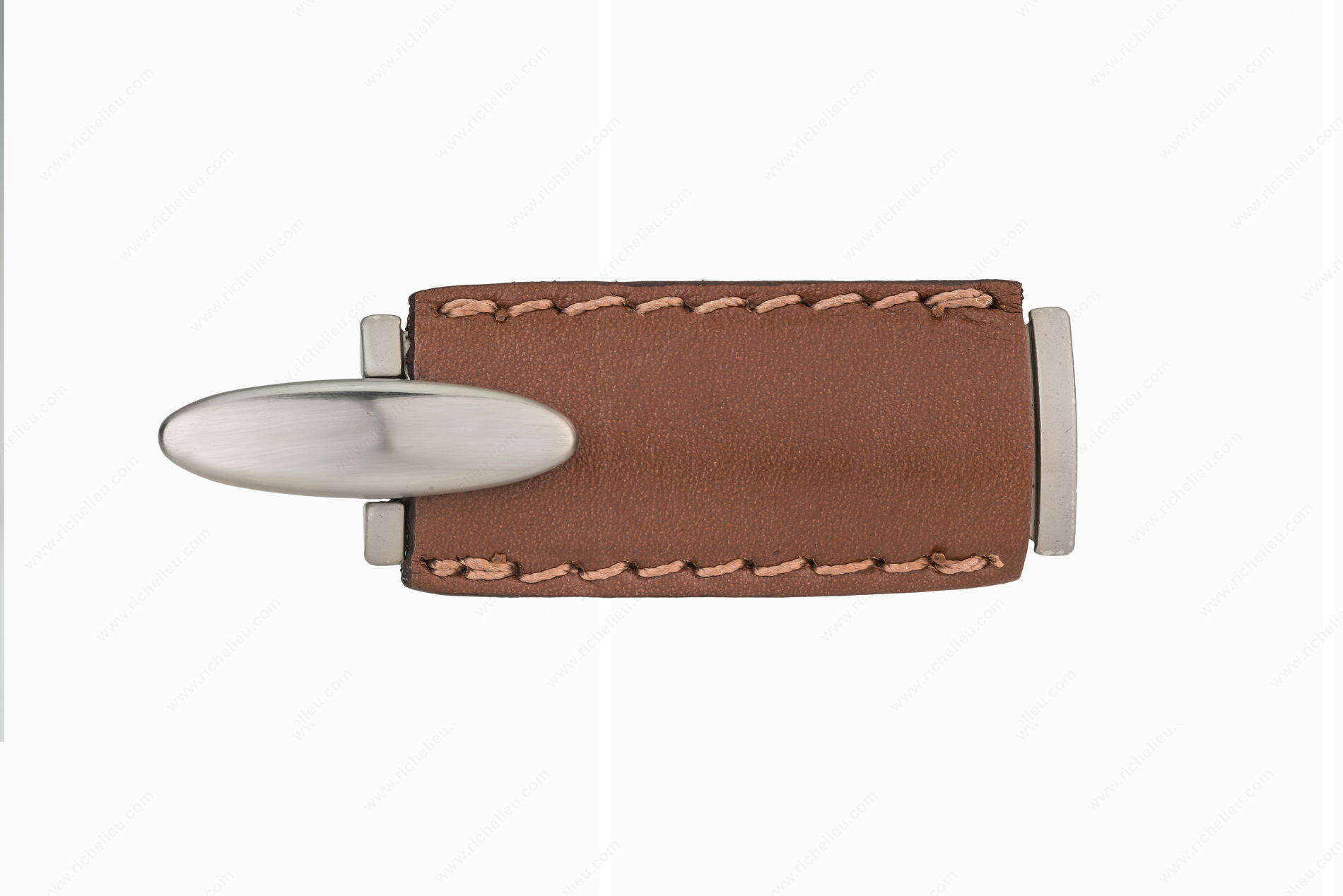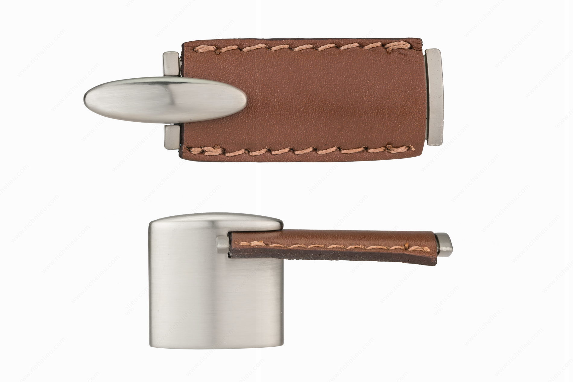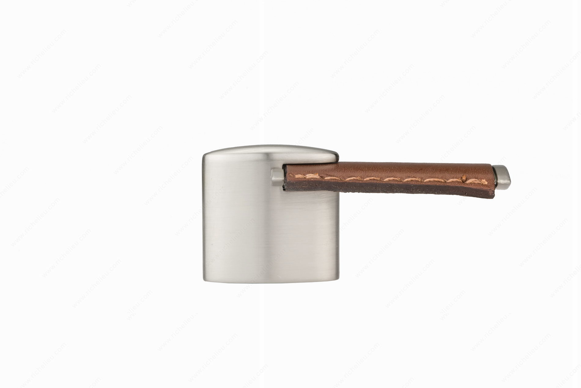Richelieu 7451151619545 Modern Leather and Metal Knob - 7451 combines sleek design with exceptional functionality, making it a standout addition to any modern decor. This L-shaped pull features an elegant oval base enveloped in a chic leather sleeve, available in sophisticated colors such as Gray and Chrome or Black. With an overall length of 3 1/16 inches, a projection of 1 3/8 inches, and a width of 1 1/32 inches, it is perfectly sized to enhance cabinets and drawers alike. Crafted from high-quality leather and durable Zamak, this knob not only offers a stylish aesthetic but also ensures longevity and reliability. The brushed nickel finish complements the brown leather beautifully, elevating your design scheme. Designed for ease of installation, it comes with M4 screws included, allowing for a hassle-free setup. The Richelieu 7451 is part of the complete 745 collection, offering a cohesive look for your interiors. This modern knob is an ideal choice for building professionals and homeowners looking to add a touch of sophistication to their spaces while providing functional ease. Transform your cabinetry with this exquisite piece that effortlessly merges style and practicality.