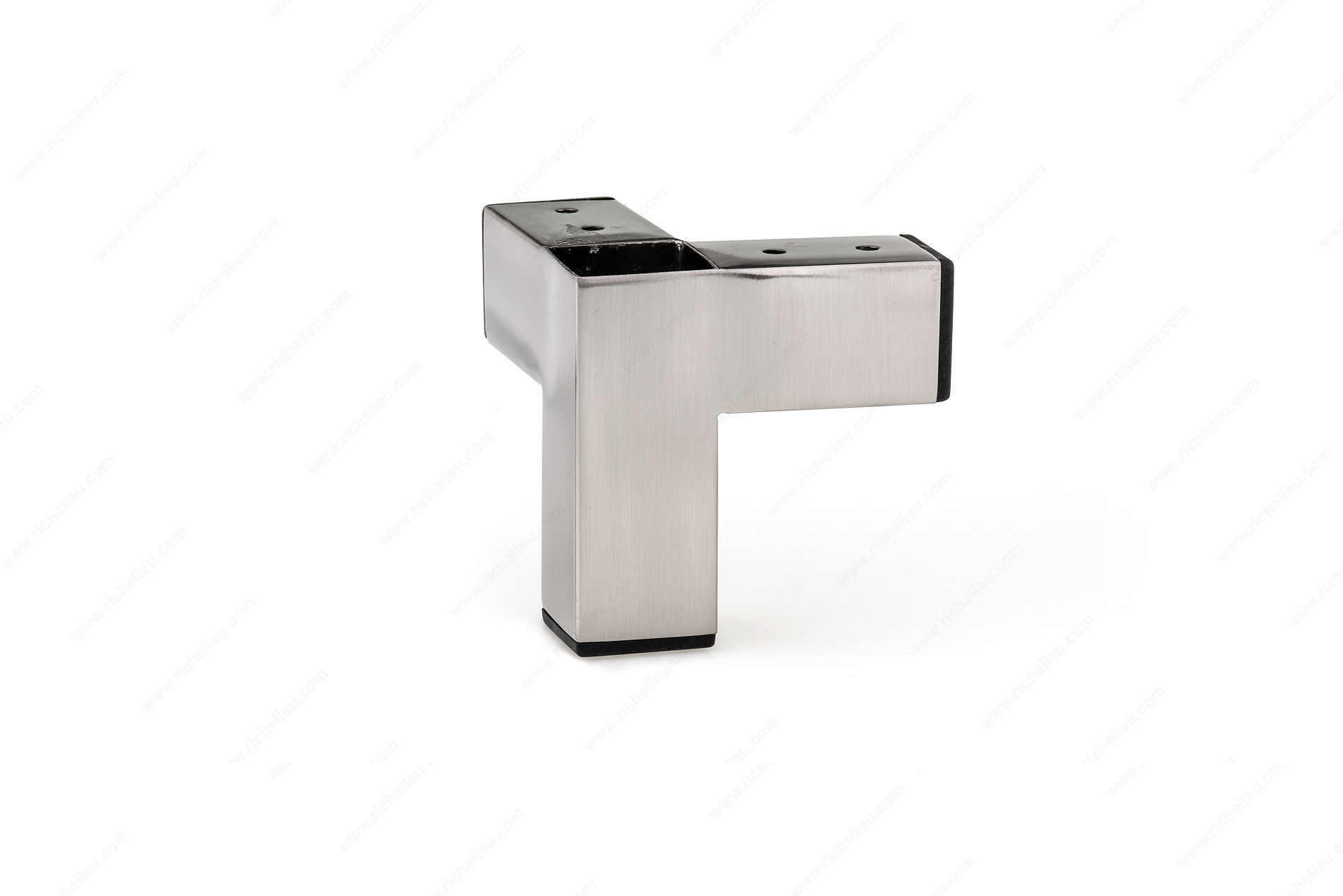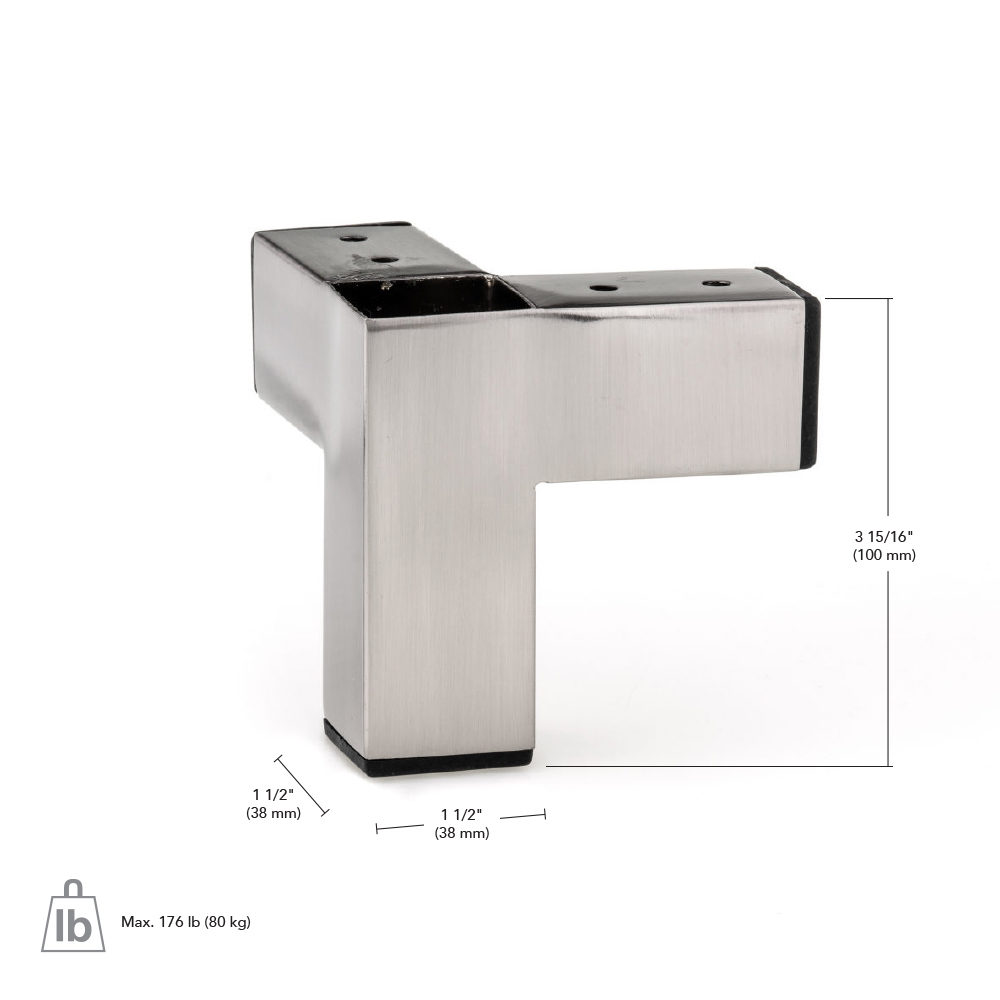 Richelieu 91310038195 Contemporary Leg - 913 offers a sleek solution for elevating your furniture with style and stability. Crafted from durable iron, this square metal leg is designed to support cabinets, closets, and garage units, making it a versatile addition to any space. Finished in brushed nickel, the leg not only provides a modern aesthetic but also ensures long-lasting durability. Measuring 3 15/16 inches in height, width, and length, this leg maintains a compact profile while offering exceptional load-bearing capacity, supporting up to 176 pounds per leg. With a diameter of 1 1/2 inches, it strikes the perfect balance between strength and design. The integrated pad helps protect your floors from scratches, making it ideal for high-traffic areas. The plate dimension of 100 mm x 100 mm ensures easy installation, allowing you to seamlessly integrate these legs into your existing cabinetry or furniture. Additionally, this product ships via UPS, providing convenience for your projects. Whether you are a building professional or a knowledgeable homeowner, the Richelieu 91310038195 Contemporary Leg is an essential component for achieving both functionality and aesthetic appeal in your design endeavors.