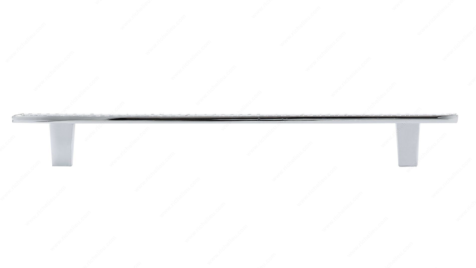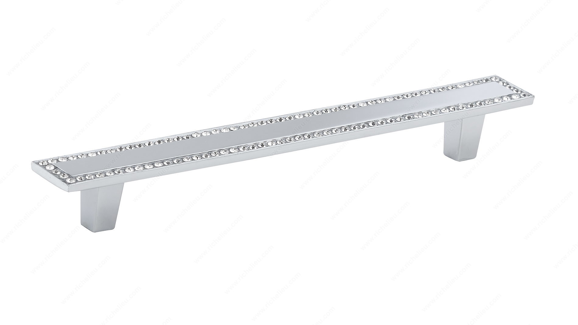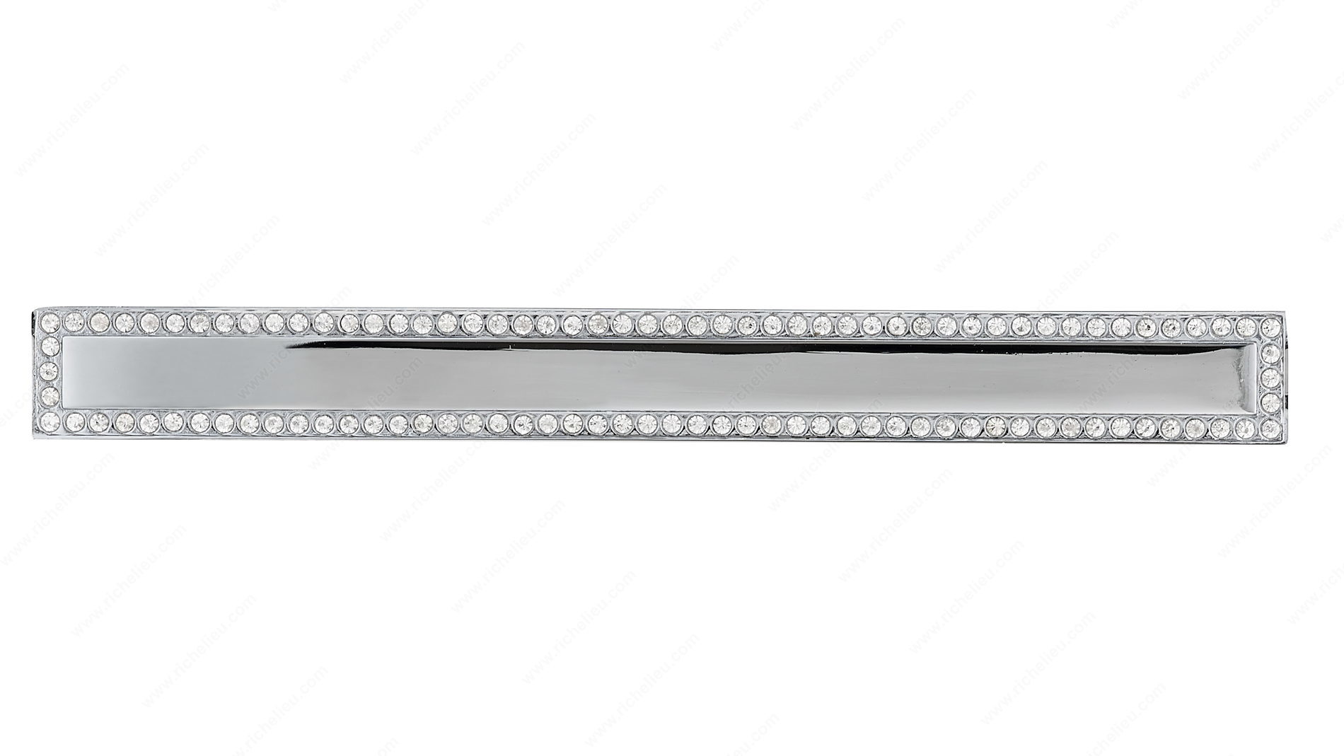 Richelieu BP373712814001 Modern Metal and Crystal Pull - 3737 features a stunning blend of contemporary design and classic elegance. This pull boasts sleek lines accentuated by a sparkling crystal border, making it an ideal choice for enhancing bedroom décor or any space that calls for a touch of sophistication. With an overall length of 6 15/32 inches and a center-to-center measurement of 5 1/32 inches, this pull is perfectly sized for a variety of cabinetry and furniture applications. The combination of metal, crystal, and glass materials not only ensures durability but also adds a luxurious shine that catches the eye. The crystal and chrome finish provides a modern aesthetic that seamlessly integrates into various design themes. Installation is straightforward, with an included 8/32 inch screw for easy mounting. The pull projects 3/4 inch from the surface, offering a comfortable grip while maintaining a streamlined look. This piece is part of Richelieu's New Collection, emphasizing modernity and style. Whether you're renovating a space or simply upgrading hardware, the Richelieu BP373712814001 pull offers both functionality and flair, making it a perfect accessory for discerning homeowners and building professionals alike.