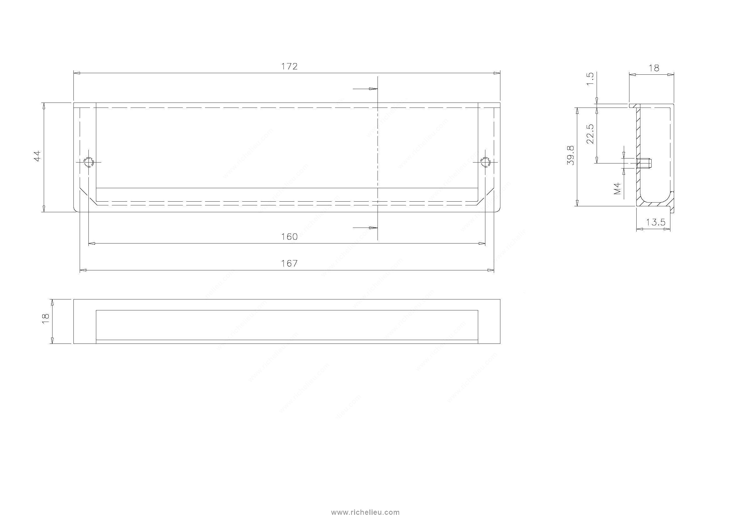 Richelieu 616748160174 Modern Recessed Metal Pull offers a sleek and contemporary solution for your cabinetry needs. Crafted from durable aluminum, this pull features a stylish matte chrome finish that adds a touch of sophistication to any space. With an overall length of 6 17/32 inches and a width of 1 9/16 inches, it is designed for both functionality and aesthetic appeal. The pull boasts a center-to-center measurement of 6 5/16 inches, making it easy to integrate into various cabinet designs. Its projection of 9/16 inches allows for a comfortable grip while maintaining a low-profile silhouette. The milling depth of 25/32 inches ensures a seamless installation, enhancing the sleek appearance of your cabinets. Included with the pull is an M4 screw, measuring 10mm in length, providing everything you need for a straightforward installation. Available in a striking gray and chrome color combination, this modern recessed pull is not only practical but also an elegant addition to your cabinetry. Whether you're renovating a kitchen, bathroom, or any living space, the Richelieu 616748160174 is an ideal choice for building professionals and knowledgeable homeowners looking to elevate their interior design with quality hardware.