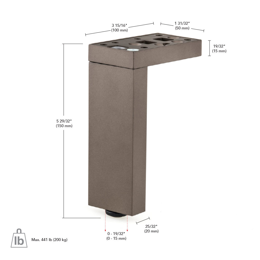 Richelieu 205150030 Contemporary Versatile T or L Shaped Furniture Leg - 205 offers a modern and stylish solution for your furniture needs. This heavy-duty leg is designed with a unique mounting plate that provides five flexible positioning options, allowing you to choose between an L or T configuration based on your application. Its robust construction ensures a remarkable load capacity of 441 lb per leg, making it suitable for a variety of furniture types. Adjustability is a key feature of this leg, with a range of up to 9/16 in (15 mm), allowing for precise leveling on uneven surfaces. Crafted from high-quality aluminum, it combines strength with a sleek aesthetic, available in five stunning finishes, including a glossy white option that adds a touch of elegance to any space. Installation is straightforward, making it an ideal choice for both professionals and DIY enthusiasts. The base dimensions of 20 mm x 50 mm provide stability, while the plate dimensions of 1 31/32 in x 3 15/16 in (50 mm x 100 mm) ensure compatibility with a wide range of furniture designs. Elevate your furniture projects with the versatility and strength of the Richelieu 205150030 leg.