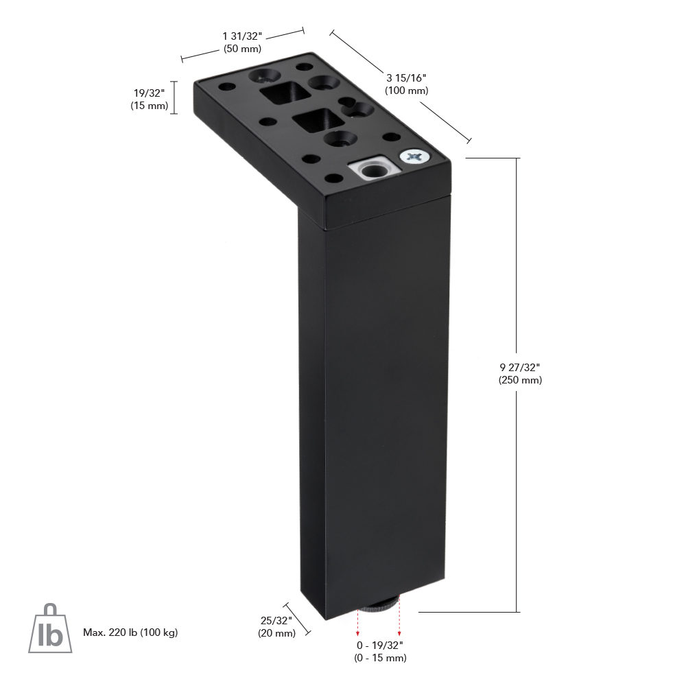 Richelieu 205250010 Contemporary Versatile T or L Shaped Furniture Leg - 205 combines modern elegance with exceptional functionality. This innovative furniture leg features a unique mounting plate that allows for five distinct positioning options, catering to both T and L configurations to suit various applications. Crafted from durable aluminum, it offers impressive strength with a load capacity of up to 220 pounds per leg. Ease of installation is a hallmark of this product, making it a perfect choice for both professional builders and DIY enthusiasts. The leg provides an adjustable height of up to 19/32 inches, ensuring optimal customization to meet specific design requirements. With a base dimension of 20 mm x 50 mm and a plate dimension of 1 31/32 in x 3 15/16 in (50 mm x 100 mm), this leg is designed for stability and support. Available in five attractive finishes and seven height options, the Richelieu Contemporary Versatile Furniture Leg allows for seamless integration into any contemporary setting. Its sleek design not only enhances the aesthetic appeal of furniture but also provides the reliable support needed for everyday use. Upgrade your furniture with this stylish and functional solution that marries form and function effortlessly.