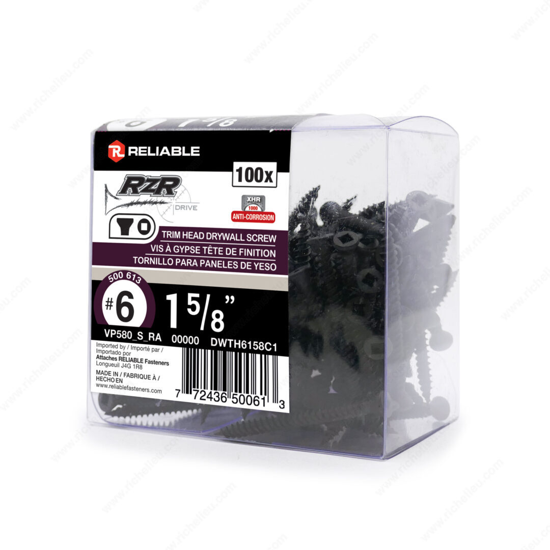 Richelieu DWTH6158C1 Drywall Screw features a flat finishing head and a square drive, designed for efficiency and precision in various applications. The steeper cutting angle of this screw ensures quicker penetration, allowing for faster installation times-a favorite among professionals. Its sharper design outperforms traditional screws, making it suitable for both wood and metal framing, including 25-20 gauge stainless steel. This versatile product boasts a fine thread and a Type S point, ensuring a secure grip and minimizing the risk of stripping during installation. With a head size of no. 6 and a length of 1 5/8 inches, the DWTH6158C1 is crafted from durable steel and finished with a sleek black phosphate coating that enhances its corrosion resistance. Packaged in boxes of 100, these screws are not only practical but also cost-effective for larger projects. The product features a full thread design, with an 18 TPI thread count, catering specifically to drywall applications. While not certified, the Richelieu DWTH6158C1 meets the demands of building professionals who seek reliable and high-performance fastening solutions. Trust in Richelieu's RzR® line for your next project and experience the difference in quality and efficiency.