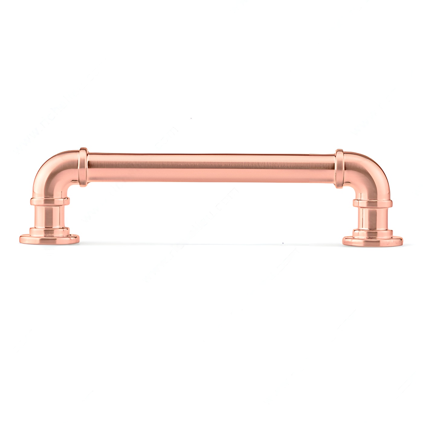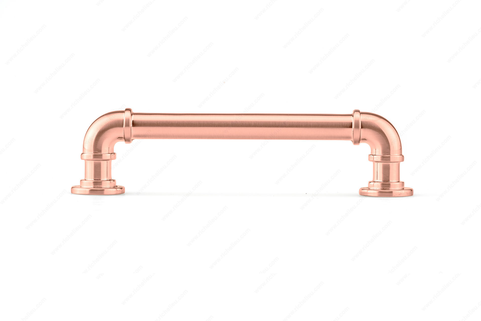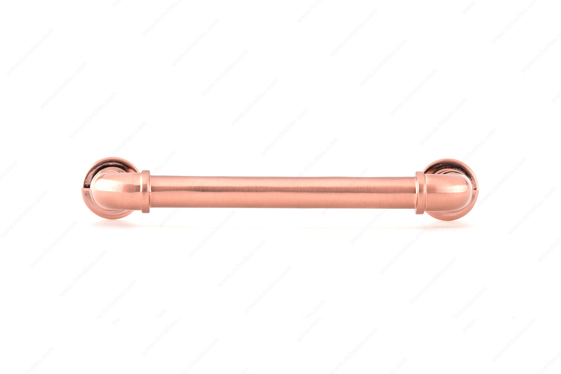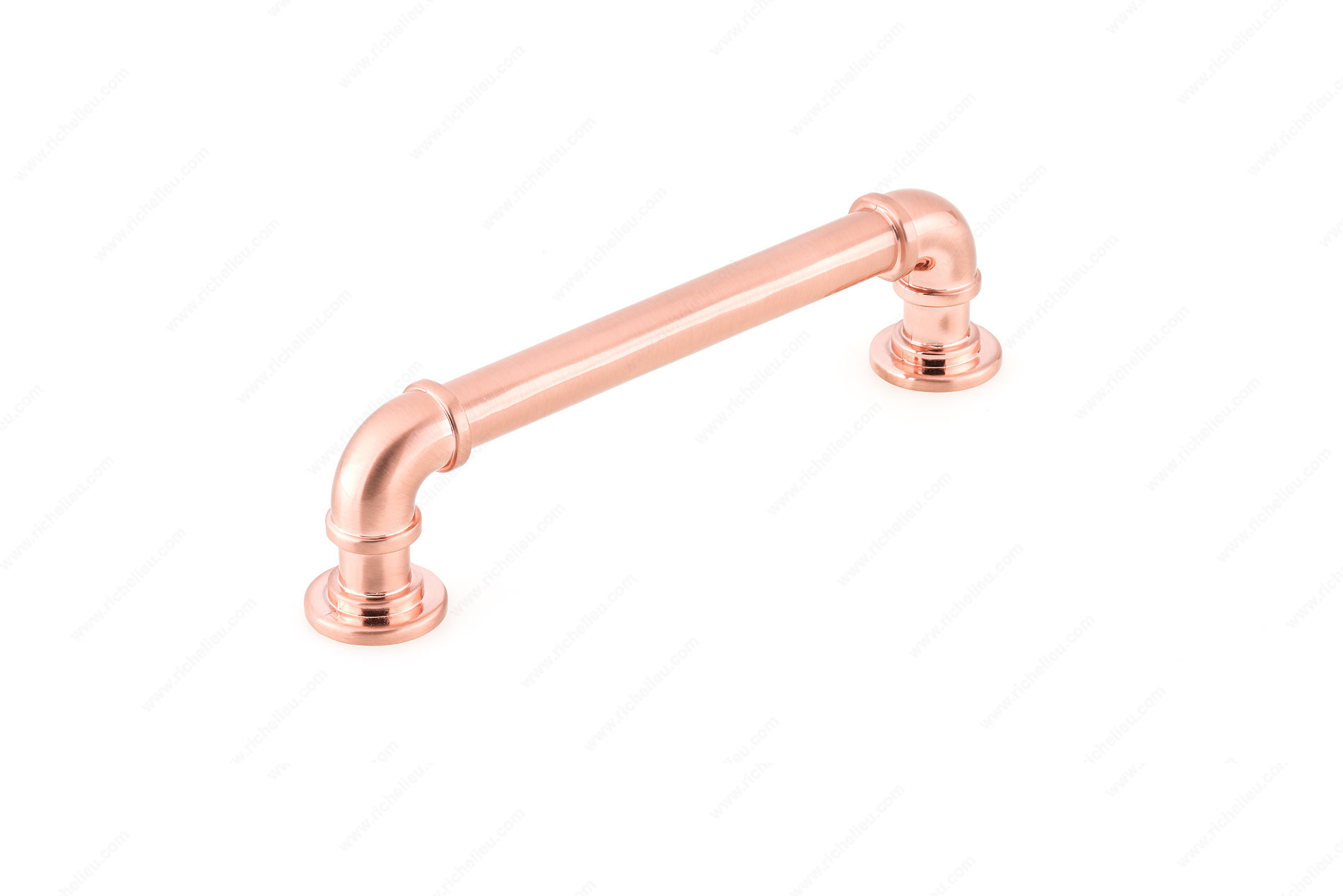 Richelieu BP2209128192 Eclectic Aluminum Pull - 2209 is a striking addition to your kitchen or bathroom decor, drawing inspiration from the unique Steampunk style. This pull, designed to resemble a pipe, adds an artistic flair while providing functionality. Crafted from durable aluminum, it promises longevity and resilience in high-use areas. With an overall length of 5 31/932 inches and a center-to-center measurement of 5 1/32 inches, this pull fits seamlessly into various cabinet styles. Its eye-catching rose gold finish, complemented by hints of red, rose, and rust, creates a warm and inviting atmosphere. The eclectic design is perfect for those looking to make a bold statement with their hardware choices. Installation is straightforward, as the product comes with 8/32 inch screws included to ensure a secure fit. The pull's dimensions feature a width of 15/16 inches and a projection of 1 1/2 inches, making it both stylish and easy to grasp. Part of the complete 2209 collection, the Richelieu BP2209128192 is ideal for building professionals and discerning homeowners seeking to elevate their interior spaces with distinctive, high-quality hardware.
