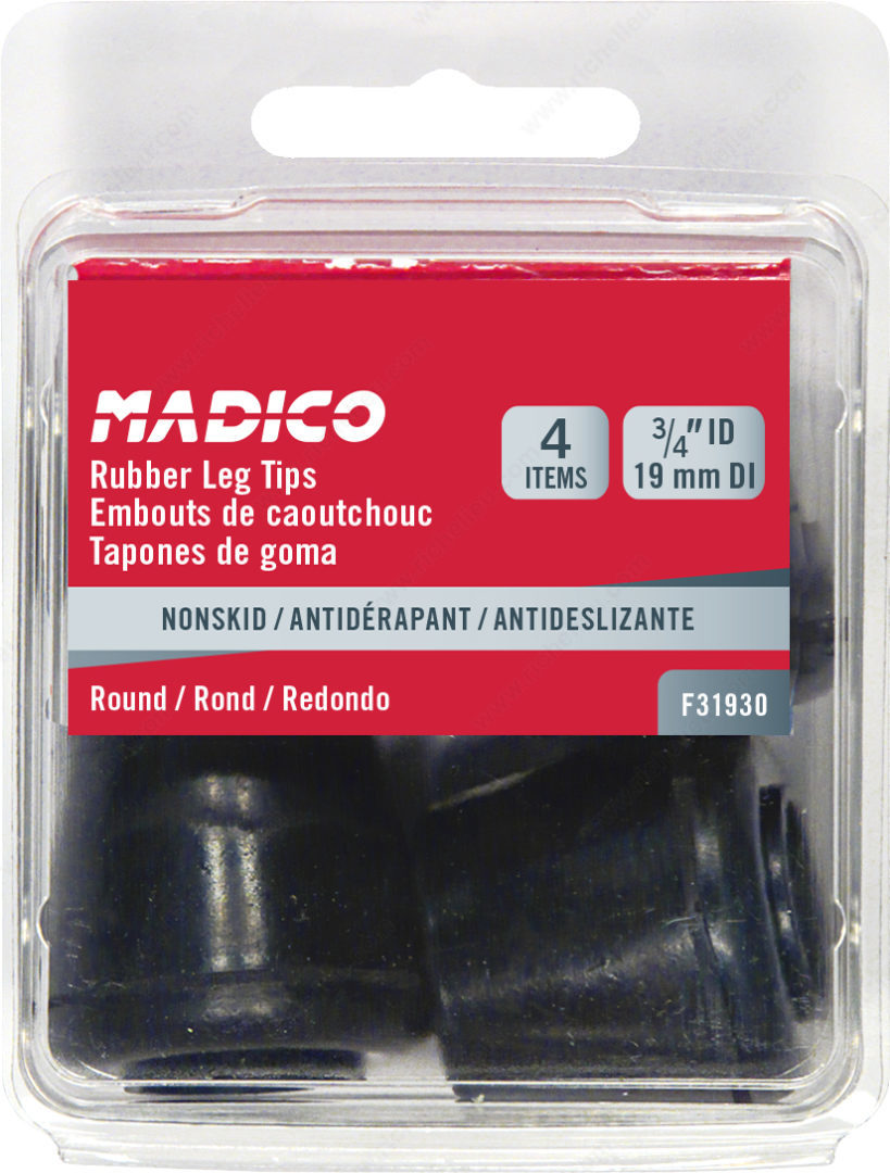 Richelieu F31930 Rubber provides an effective solution for protecting and enhancing the functionality of your furniture. Designed for use on both tubular and wood legs, this versatile rubber foot is ideal for various applications, ensuring stability and reducing wear on your flooring. Crafted from durable rubber, it features a sleek black finish that complements any decor while maintaining a professional appearance. The F31930 offers a convenient snap-on mounting type, making installation quick and hassle-free. With interior dimensions of 25/32 inches, it fits a range of leg sizes, providing a snug and secure fit. Each box contains four rubber feet, allowing you to outfit multiple pieces of furniture or replace worn-out protectors easily. Recommended for use on surfaces such as tile, ceramic, linoleum, hardwood, and laminate, these rubber feet help prevent scratches and scuffs, ensuring your floors remain in pristine condition. The round shape contributes to a polished look, making it a perfect addition to both residential and commercial settings. Richelieu's commitment to quality ensures that the F31930 Rubber foot will meet the demands of building professionals and discerning homeowners alike.