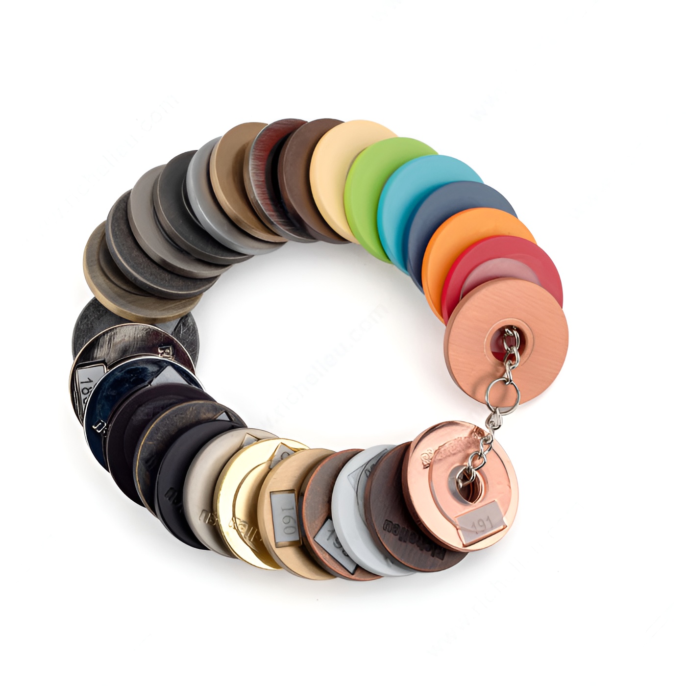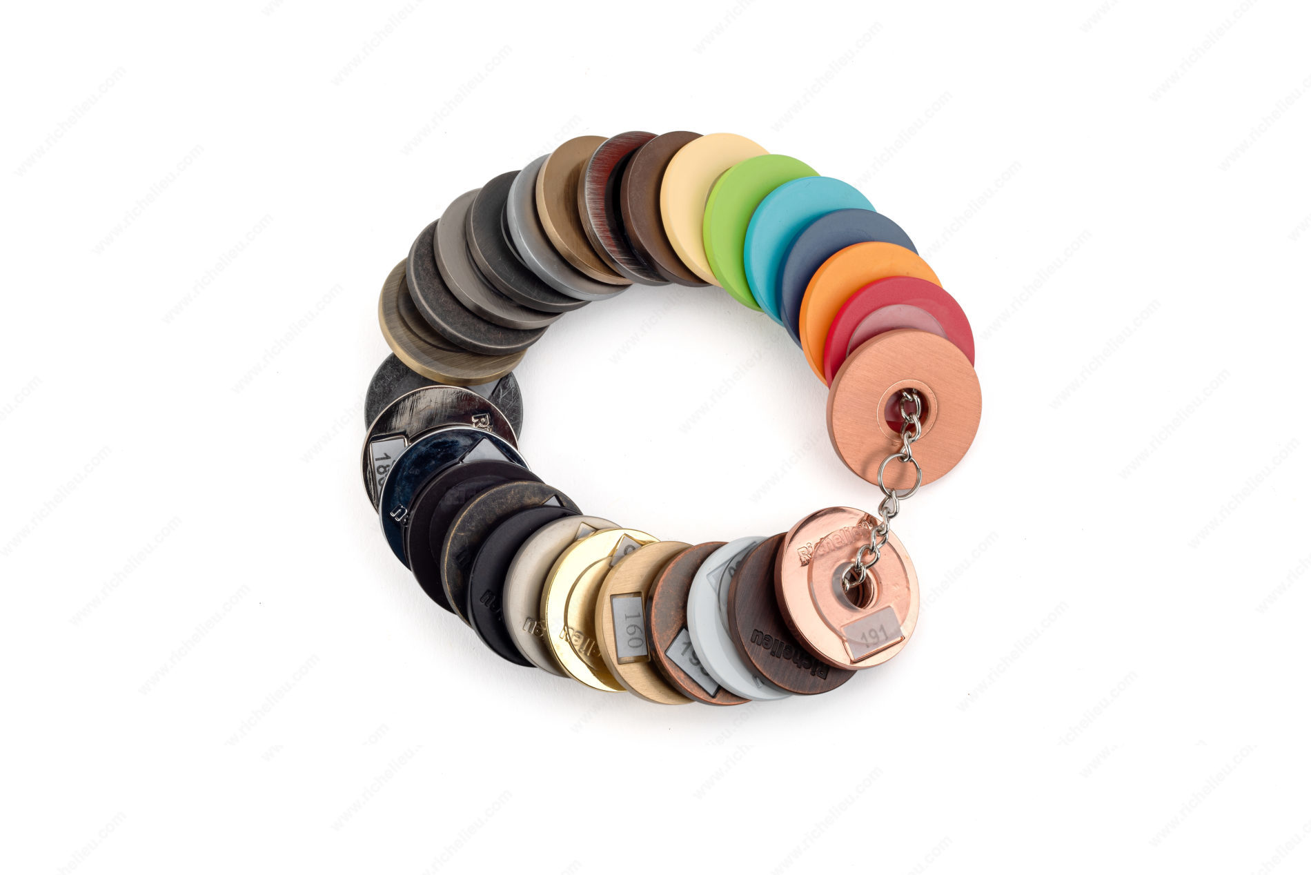 Richelieu FINISHES17 Finish Sample Chain 2017Richelieu FINISHES17 Finish Sample Chain - 2017 offers a curated selection of the latest finish trends, including the sophisticated Rose Gold and various Wilsonart melamine color finishes. This sample chain is an essential tool for architects, designers, and builders who wish to stay ahead of the curve in contemporary design aesthetics. Within the FINISHES17 chain, you'll find a diverse range of finishes: 192, D307, D501, D498, D499, HBRZ, 169, CHBRZ, 174, 143, 195, 142, AE, 908, 180, 184, 140, ORB, BB, 900, 185, 130, 158, 160, 193, 30, BORB, and 191. This extensive palette allows for versatile design applications, ensuring that you can find the perfect finish to complement any project. Crafted from durable zinc, the FINISHES17 sample chain not only showcases stunning visuals but also promises longevity and resilience in various environments. With the convenience of UPS shipping, acquiring this essential sample chain has never been easier. Elevate your design projects with Richelieu's FINISHES17, and inspire creativity and innovation in every space you work on.