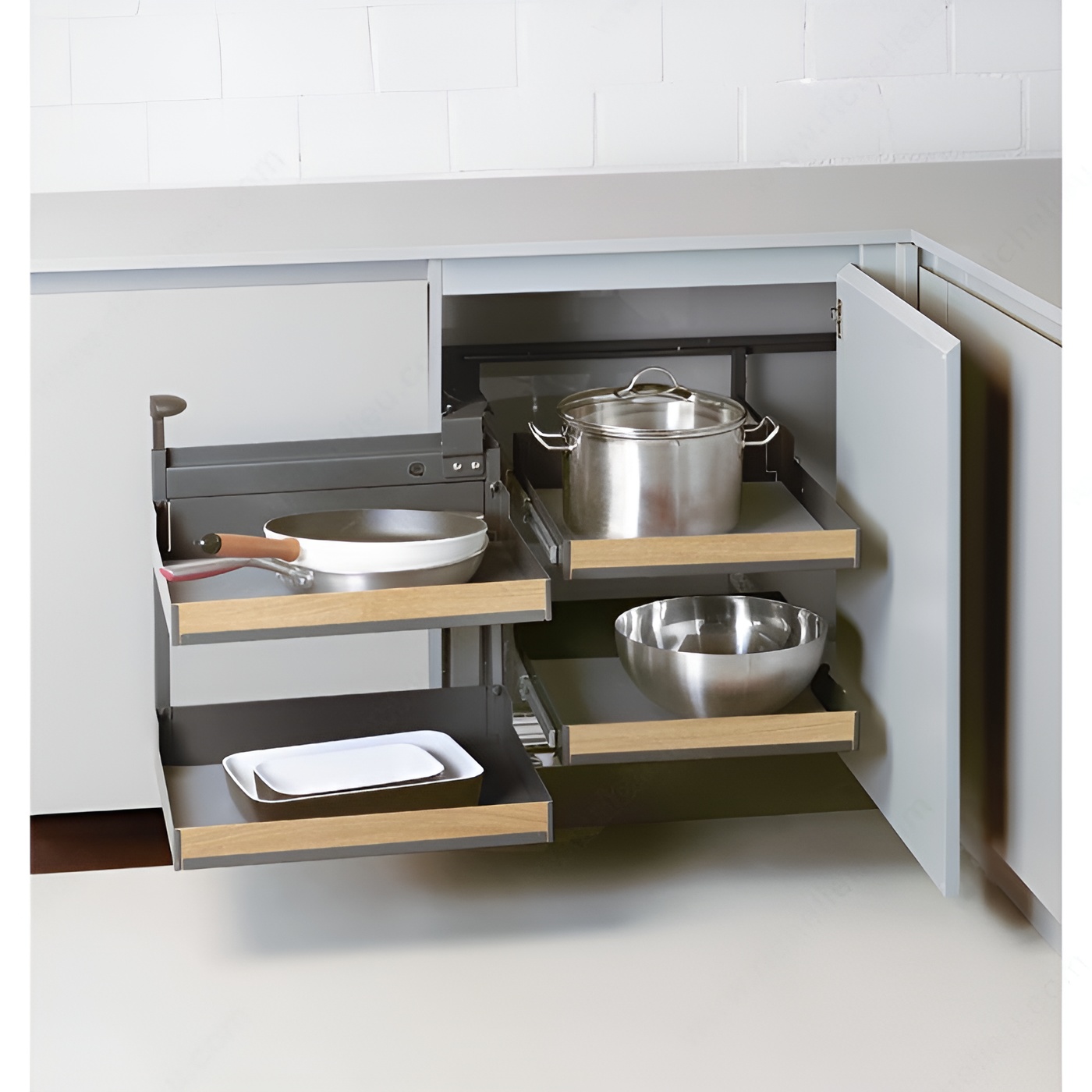 Richelieu WEBKIT1216848 Fioro Magic Corner II Sets for 494 mm (19-29/64") Opening - Anthracite offer an innovative solution for maximizing storage space in kitchen corners. Designed for openings ranging from 37 7/8 to 46 1/8 inches in width, this corner unit features a sleek dark gray finish that seamlessly integrates into contemporary kitchen designs. Constructed from durable metal, this product ensures long-lasting performance while maintaining an elegant appearance. The soft-close mechanism provides a smooth and quiet operation, enhancing user convenience and preventing slamming. With required interior dimensions of 19 5/8 inches in depth and 21 1/2 inches in height, the unit fits snugly into your cabinetry, making the most of otherwise wasted corner space. The left opening design, measuring 19 1/2 inches, provides easy access to stored items, allowing you to retrieve kitchen essentials effortlessly. Ideal for building professionals and savvy homeowners alike, the Richelieu Fioro Magic Corner II Sets not only optimize functionality but also elevate the aesthetics of your kitchen. With UPS shipping available, incorporating this stylish and practical storage solution into your project is both simple and efficient.