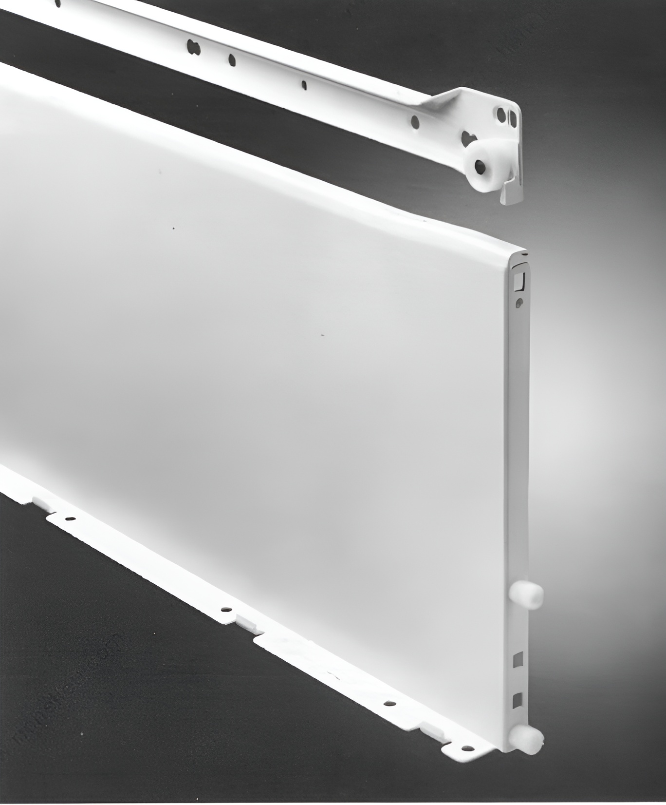 Richelieu GR6436350 Zargen Drawer Slide seamlessly integrates functionality and design, making it an ideal choice for frameless cabinetry. This traditional 3/4 extension drawer slide serves dual purposes, functioning both as a slide and the side of a drawer. To create a complete drawer, simply add a front panel, back panel, and drawer bottom. Versatility is highlighted by the option to use divider rails or side rails, allowing you to customize the drawer for file storage or standard use. With a load capacity of 100 lbs, the GR6436350 is built for durability and performance. The side clearance of just 5 mm (3/16") ensures a snug fit while maintaining ease of use. The nylon slides provide smooth motion without the soft-close feature, making it straightforward and efficient for general storage needs. Measuring 13 3/4 inches in length and 8 3/8 inches in height, this slide is compatible with high panel configurations. For added security, a central locking adapter is available to lock all drawers in place. The white finish adds a clean aesthetic, making it a fitting choice for modern interiors. Enhance your cabinetry with the quality and reliability of Richelieu’s Zargen drawer slide.