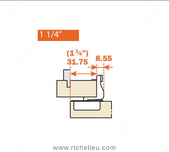 Richelieu H106CSP3A99NR Excenthree Face Frame 3 Cams Hinges are designed for versatility and precision in door closing applications. Crafted from durable stamped steel, these hinges ensure robust performance while providing side, height, and depth adjustments, making them perfect for refacing or accommodating various frame thicknesses. With an impressive opening angle of 106 degrees, they facilitate easy access and functionality. The hinge is indexed from the front of the face frame, allowing for straightforward adjustments without a back tab. Suitable for full overlay cabinet doors, these hinges support overlays ranging from 1/4" to 1-7/16", achieving a reveal value of 8.3 mm or 5.2 mm for square edge doors at a 90° opening, respectively. The hinge features a cup depth of 11 mm (7/16") and a fixed drilling distance of 2.5 mm (3/32"). Designed for zero-door protrusion, these hinges support a load capacity of up to 10 lbs, ensuring reliability in everyday use. For installation, it is recommended to use a #6 x 5/8" (15.9 mm) FHP screw. With its nickel finish and face-mount design, the Richelieu H106CSP3A99NR hinges are a professional-grade choice for any cabinetry project.