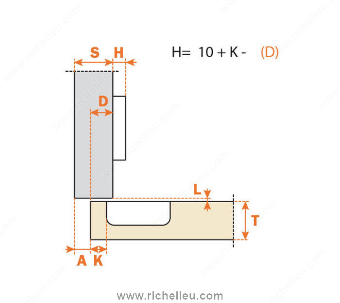 Richelieu H165C2JFD99 Serie 200 Concealed Hinges - 165 are engineered for frameless cabinet applications, offering a seamless and aesthetically pleasing look. With a die-cast cup measuring 11 mm and an impressive hinge opening angle of +165°, these hinges provide excellent accessibility without compromising style. They support a load capacity of up to 10 lbs, making them suitable for various standard door designs. The H165C2JFD99 hinges feature toolless fixing for easy installation and adjustment, streamlining the setup process for professionals and DIY enthusiasts alike. The drilling distance ranges from K = 3 to 8 mm, allowing for versatile mounting options. Additionally, the hinges use the same formulas as typical 94°, 110°, and 120° hinges for base plates, enabling compatibility and ease of integration into existing projects. Packaged conveniently at 100 units per case, these nickel-finished hinges are not only durable but also deliver a polished look. Designed for 1/2 inch (12.7 mm) overlay doors, these hinges are perfect for modern cabinetry where functionality meets design. Order base plates separately to complete your installation. The H165C2JFD99 hinges are in stock and ready to ship via UPS, ensuring quick availability for your next project.