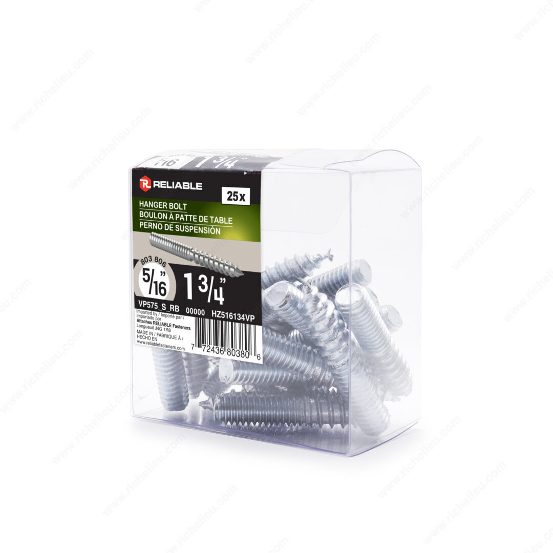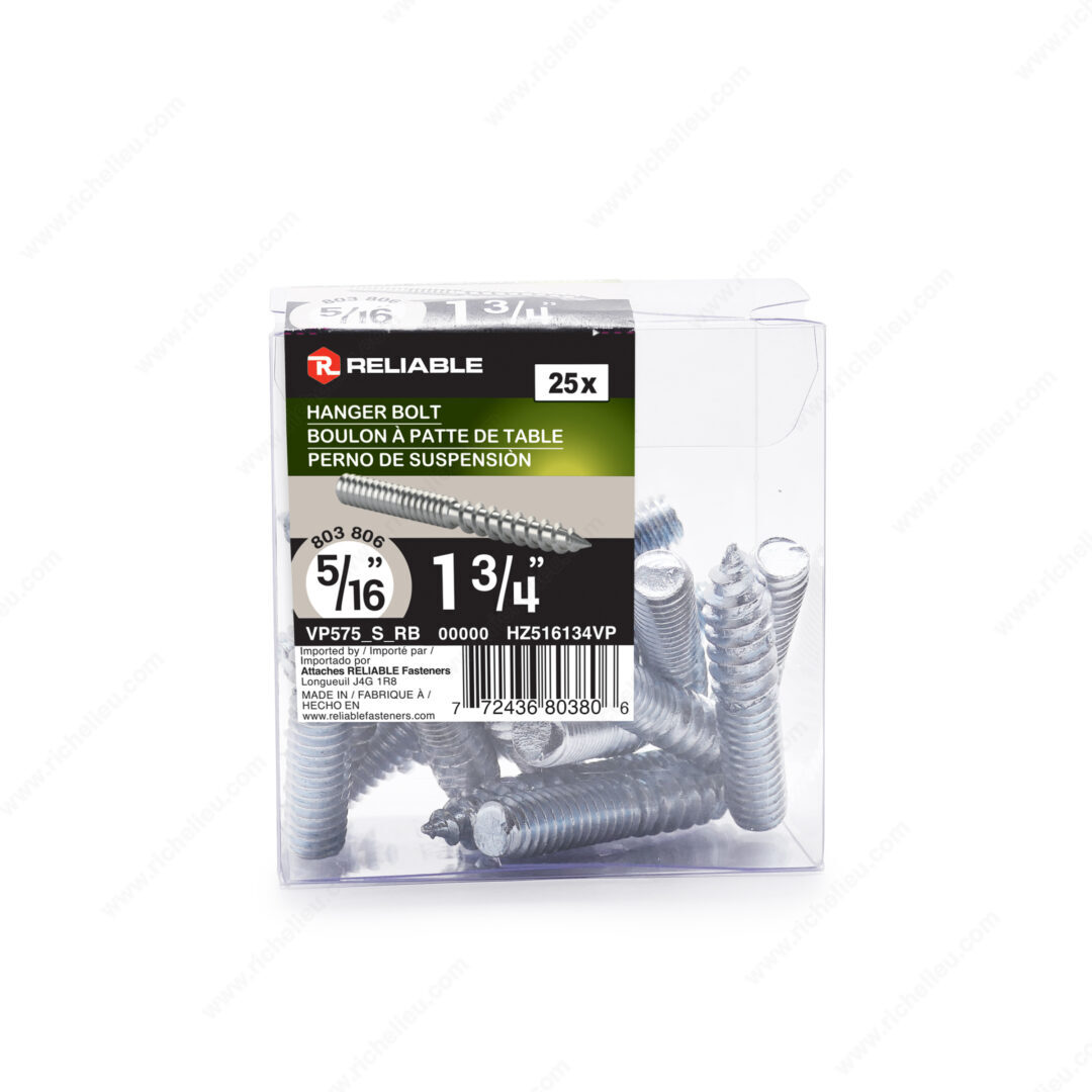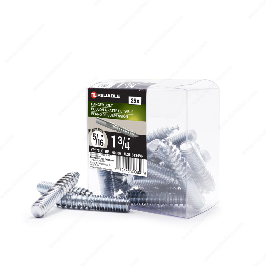 Richelieu HZ516134VP Hanger Bolt offers a reliable solution for connecting wooden structures with ease and precision. Designed with dual-threading functionality, this hanger bolt features a regular wood point type at one end for seamless insertion into wood, while the exposed portion provides a robust connection for securing with a nut. Crafted from durable steel and finished with a zinc coating, this product ensures longevity and resistance to wear in interior applications. Measuring 1 3/4 inches in length and compatible with a 5/16 screw size, the HZ516134VP is ideal for various projects, including wood railings, stairs, and table or chair legs. The coarse wood/machine thread type, with a pitch of 18, allows for a secure grip in your woodworking endeavors. Each box contains 25 hanger bolts, making it a practical choice for both professionals and DIY enthusiasts looking to stock up on essential hardware. This versatile product can be shipped via UPS, adding convenience to your ordering process. Trust Richelieu to provide reliable components that enhance the quality and durability of your woodworking projects, ensuring that every connection you make is built to last.