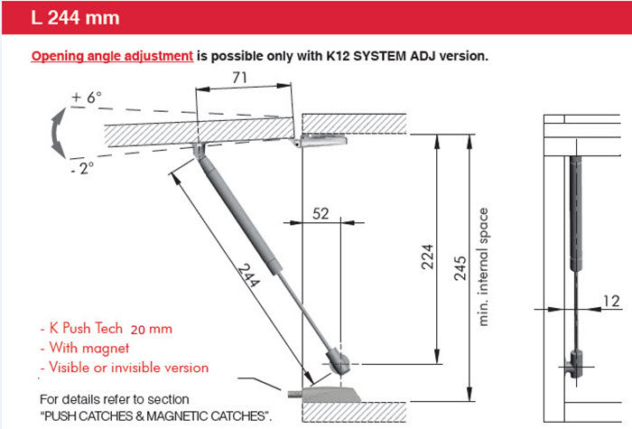 Richelieu 244140185 K12 Arms for Lift-Up Opening revolutionizes the way flap doors are accessed, providing a seamless and efficient solution for modern cabinetry. This pneumatic suspension arm is expertly engineered for standard automatic drilling processes, ensuring an easy installation on solid doors or wider aluminum door frames. With a robust force capacity of 31.5 lbs (140 Newtons), it offers reliable support for your lift-up openings, making it ideal for kitchens, offices, or any space requiring practical storage solutions. Measuring 9 19/32 inches in length, the K12 arm is designed to provide smooth and controlled movement, allowing users to open and close doors effortlessly. Its innovative design not only enhances functionality but also contributes to a polished aesthetic in your interior spaces. The K12 arms are suitable for a variety of applications, making them a versatile addition to your hardware toolkit. Plus, they ship conveniently via UPS, ensuring timely delivery to your projects. Elevate your cabinetry with Richelieu's K12 Arms, where sophistication meets practicality in everyday use.