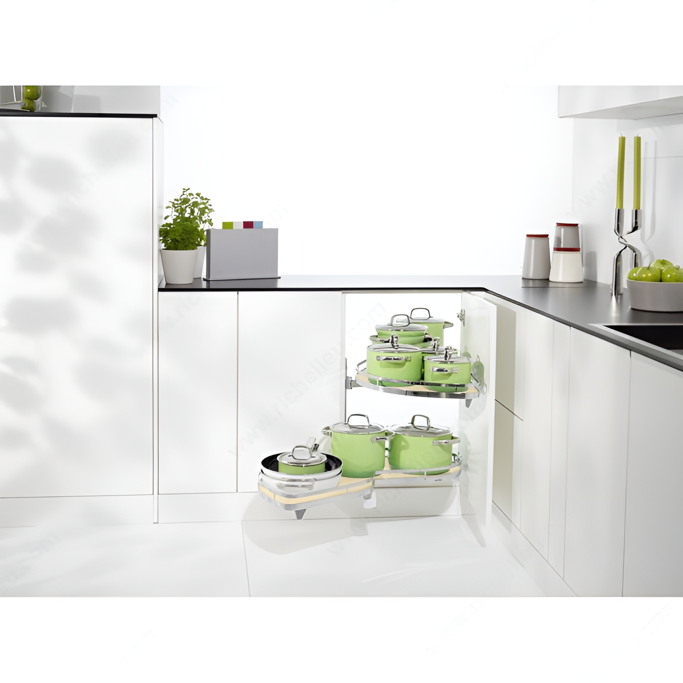 Richelieu 6937155150 LeMans II System without Soft-Close Mechanism offers a smart solution for maximizing storage in corner cabinets. This pivoting tray system is designed to enhance accessibility and organization, making it ideal for food storage, preparation, and general storage needs. With a sleek maple and champagne finish, this system not only performs exceptionally but also adds a touch of elegance to your cabinetry. It requires a minimum cabinet opening of 14 inches for frame cabinets and 14 1/4 inches for frameless cabinets, ensuring a versatile fit in various kitchen designs. The system is designed for a door width of 15 3/4 inches and requires interior dimensions of at least 19 5/8 inches in depth and 21 1/2 inches in height. Each shelf boasts an impressive weight capacity of 55.1 pounds, providing ample support for your kitchen essentials. This unit is specifically created for left-opening cabinets, making it a tailor-made choice for your layout. Packaged conveniently in a box, the Richelieu LeMans II System is easy to ship via UPS, making it a practical choice for both professionals and homeowners looking to optimize their kitchen space.