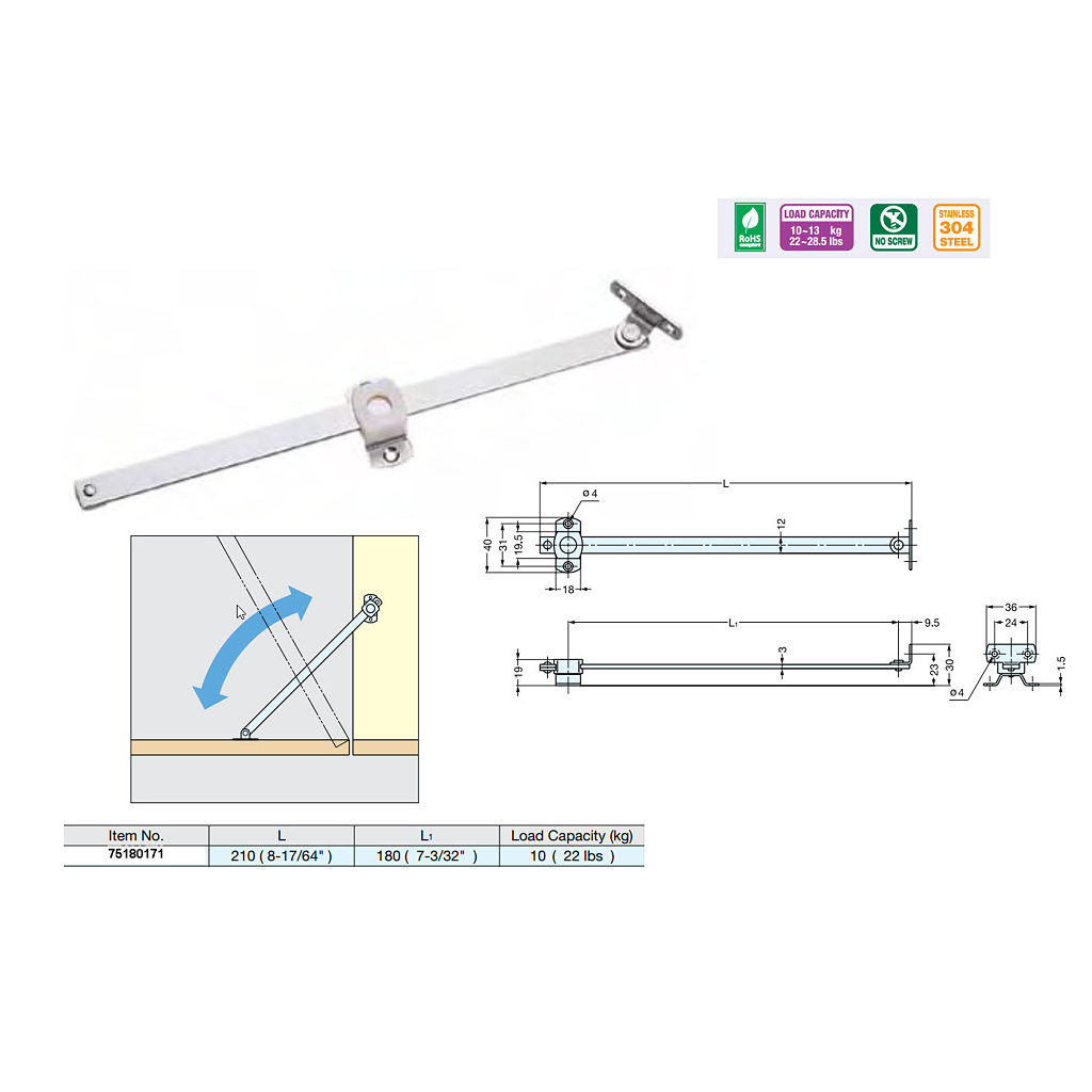 Richelieu 75180171 Lid Stay - Stainless Steel is a robust and versatile solution designed for drop-down openings. Crafted from high-quality 304 stainless steel, this lid stay promises durability and a sleek finish that complements various applications. With a length of 8 9/32 inches, it effortlessly supports lids or flaps, ensuring a smooth and reliable operation. This lid stay boasts an impressive load capacity of 10 kg, making it suitable for a range of projects, from cabinetry to larger furniture pieces. Its reversible design allows for easy installation in different orientations, providing flexibility to suit your specific needs. The product meets RoHS standards, ensuring that it adheres to strict environmental regulations. Whether you are a building professional or a dedicated homeowner, the Richelieu 75180171 Lid Stay combines functionality with aesthetics. The stainless steel finish not only enhances the overall look but also adds resistance against wear and tear, ensuring long-lasting performance. This product is shipped via UPS, making it convenient to receive and implement in your projects. Choose the Richelieu lid stay for an effective and stylish solution to your drop-down opening requirements.