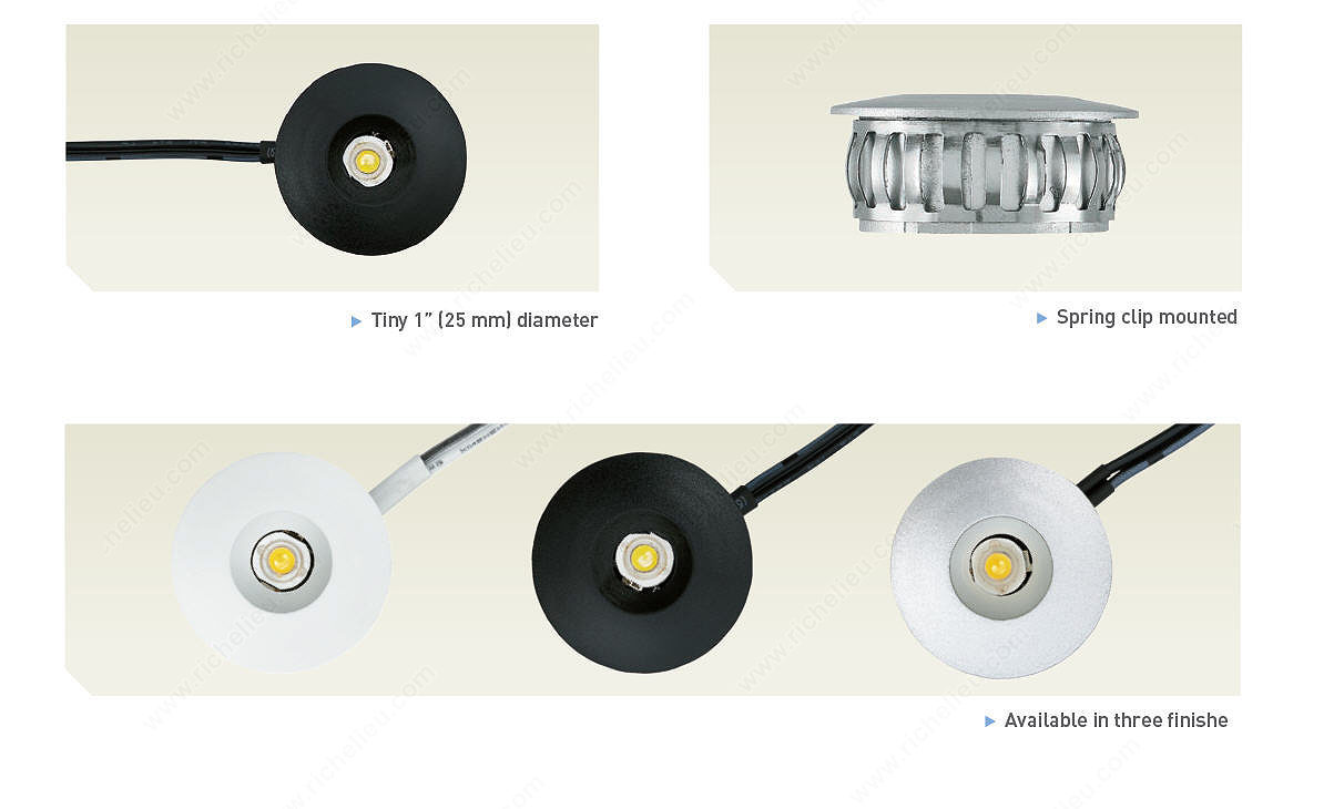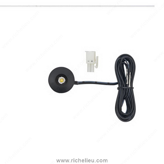 Richelieu LLED1EBWBL LED 1W Pockit Point is a versatile miniature spotlight designed to deliver a focused beam of light while fitting seamlessly into tight spaces. With a remarkably shallow recess depth of just 13 mm (1/2 inch) and a diameter of 25 mm (1 inch), this fixture is perfect for kitchens, living rooms, and bedrooms, providing stylish accent and task lighting where needed. Crafted with a sleek black finish, the Pockit Point emits warm white light at a Kelvin color temperature of 3000 K, creating an inviting atmosphere. Ideal for installation inside cabinets, under cabinets, or within furniture, this recessed luminaire enhances any environment with its fixed spot design. The Pockit Point operates on a low voltage of 12 V and consumes only 1 W of power, making it an energy-efficient choice without compromising on brightness. It requires a bore hole of 1 inch for installation, ensuring a straightforward setup process. Whether you're looking to highlight features in your home or create functional lighting solutions, the Richelieu LLED1EBWBL LED 1W Pockit Point is an excellent choice that combines practicality and modern aesthetics.