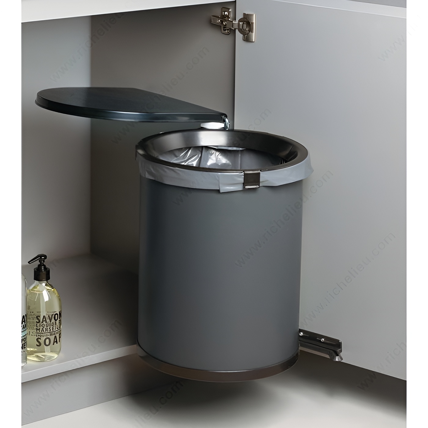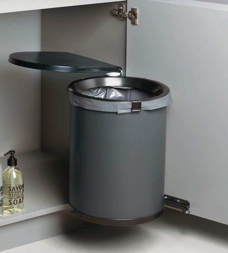 Richelieu 24335110 Maxi Waste Bin (30 L) is the perfect solution for managing waste in under-sink cabinets, optimizing space while keeping your area tidy. With a generous capacity of 30 liters (31.7 quarts), this waste bin is designed to handle your cleaning and preparation needs effectively. The innovative rim design clips securely onto the bin, ensuring that your plastic bag stays firmly in place and prevents messy spills. This waste bin is versatile, featuring a reversible design that allows for easy installation on either the right or left side, accommodating an interior width of 415 mm (16-3/8"). Its sleek dark gray finish blends seamlessly with various cabinet styles, adding a touch of sophistication to your kitchen or utility space. To install this waste bin, ensure you have the required interior dimensions: a depth of 13 3/8 inches, a height of 19 5/8 inches, and a width of 16 3/8 inches. This product is ideal for base cabinets and under-sink cabinets, making it an essential component for any waste management system in your home. Trust Richelieu for high-quality, functional solutions that enhance your space and streamline your daily tasks.