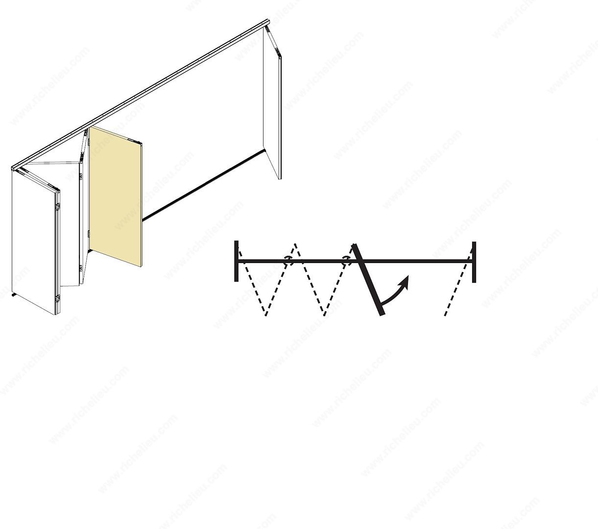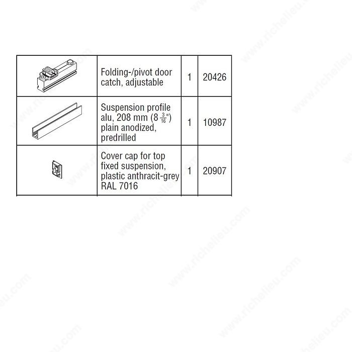 Richelieu 65919620D10 Pivot Door Set for Folded Stack - Hawa Variofold/Centerfold 80H offers a reliable solution for enhancing your interior spaces with its smooth operation and stylish design. Designed specifically for the Hawa Variofold 80H system, this pivot door hardware set is perfect for folded stack installations, ensuring seamless functionality. Crafted to accommodate wooden doors with a thickness ranging from 1 3/8 to 1 25/32 inches, this hardware set supports door widths between 19 5/8 and 35 3/8 inches. With a robust load capacity of 176 lbs, it is engineered to handle the demands of everyday use while delivering durability and reliability. The set is suitable for a single door application, making it an excellent choice for residential or commercial projects where space efficiency is essential. Its thoughtful design allows for easy installation and maintenance, ensuring that your pivot door operates smoothly over time. Available for convenient shipping via UPS, the Richelieu 65919620D10 Pivot Door Set combines functionality with quality, making it a smart choice for architects, builders, and discerning homeowners alike. Elevate your interiors with this versatile and dependable hardware solution.