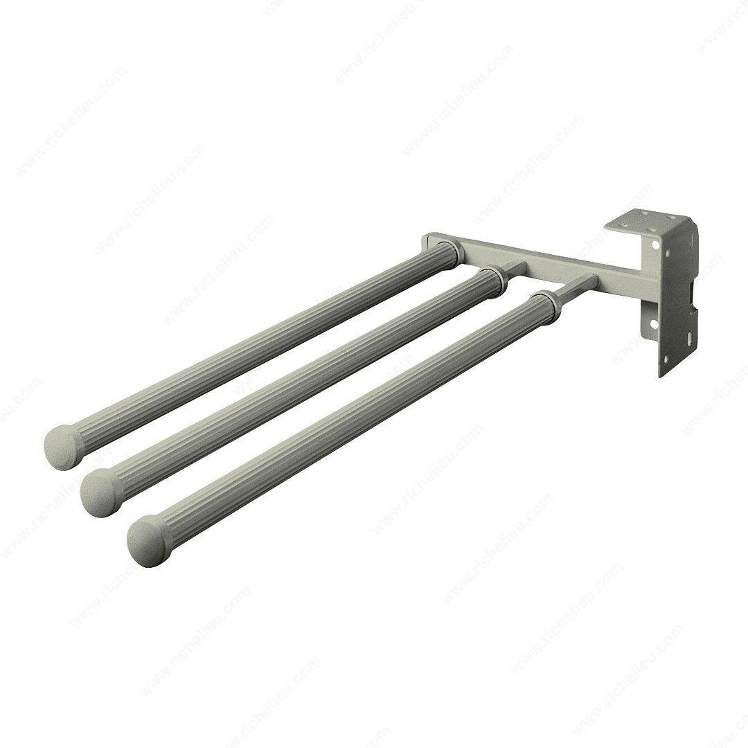 Richelieu 3143100 Pull-Out Towel Rack is an innovative solution designed to optimize your space while keeping towels organized and easily accessible. This sliding, swiveling towel rack features three sturdy prongs supported by a robust steel rod and base, ensuring durability and reliability in daily use. Crafted from epoxy-coated steel, the towel rack is built to withstand the rigors of a busy kitchen or workspace, while the outer tube is made of grooved PVC, offering a sleek and modern appearance. Its versatile design allows for installation under a worktop, on a rear panel, or on either side panel, making it adaptable to various cabinetry configurations. With dimensions of 16 7/8 to 29 3/4 inches in depth, 3 3/8 inches in height, and 6 5/8 inches in width, it fits comfortably in spaces requiring a depth of at least 17 1/8 inches, a height of 3 5/8 inches, and a width of 7 15/32 inches. The elegant gray finish adds a contemporary touch that complements any décor. Ideal for cleaning and preparation areas, the Richelieu 3143100 Pull-Out Towel Rack combines functionality with style, making it an essential addition for those looking to enhance their kitchen or workspace organization.