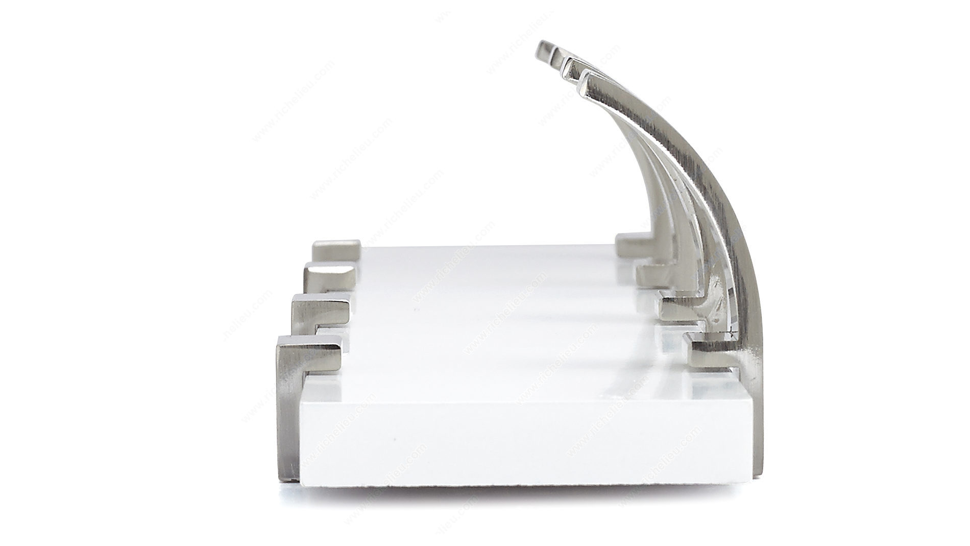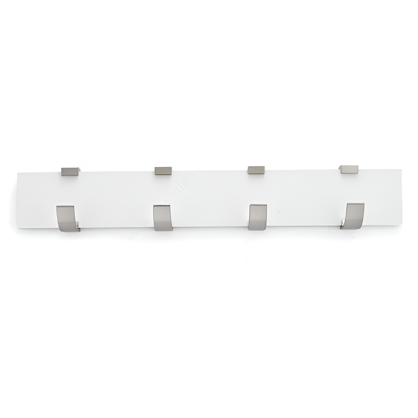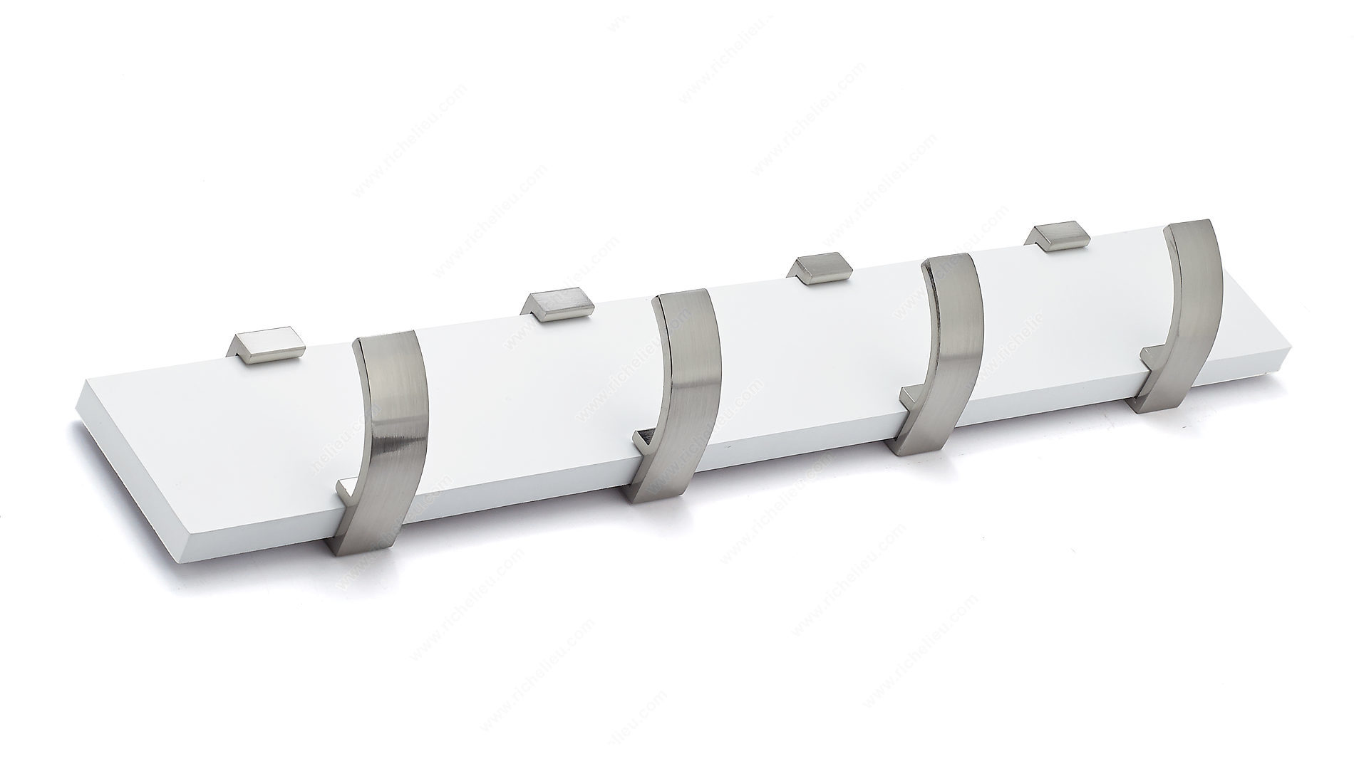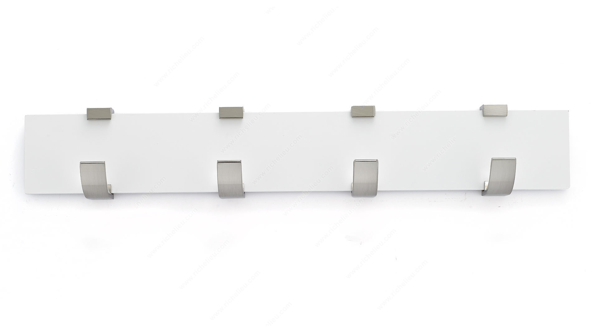 Richelieu RH118211430195 Modern Hook Rack - 1182 offers a stylish and functional solution for organizing your space with flair. This contemporary hook rack features four single hooks mounted on a sleek white board, providing a modern aesthetic that enhances any room's design. Ideal for bedrooms, bathrooms, entryways, mudrooms, and closets, it effortlessly combines utility with elegance. Constructed from durable metal and wood, this hook rack boasts a load capacity of 22 pounds, making it robust enough to hold various items, from coats and bags to towels and accessories. The brushed nickel finish complements the white board, creating a harmonious look that fits seamlessly into any décor. With overall dimensions of 2 21/32 inches in height, 17 3/4 inches in width, and a projection of 2 15/32 inches, it is compact yet spacious enough to meet your storage needs. Installation is straightforward, as the necessary screws and nails are included, allowing you to mount it on walls or doors with ease. Enhance your space with the Richelieu Modern Hook Rack, where style meets practicality in a perfect union.