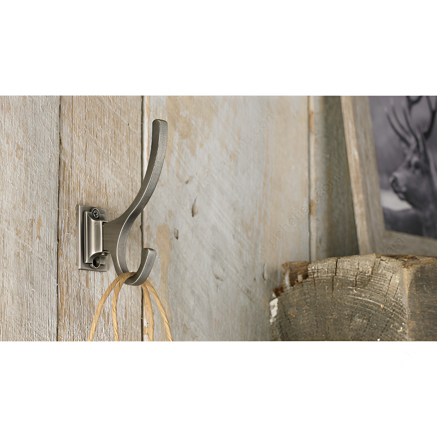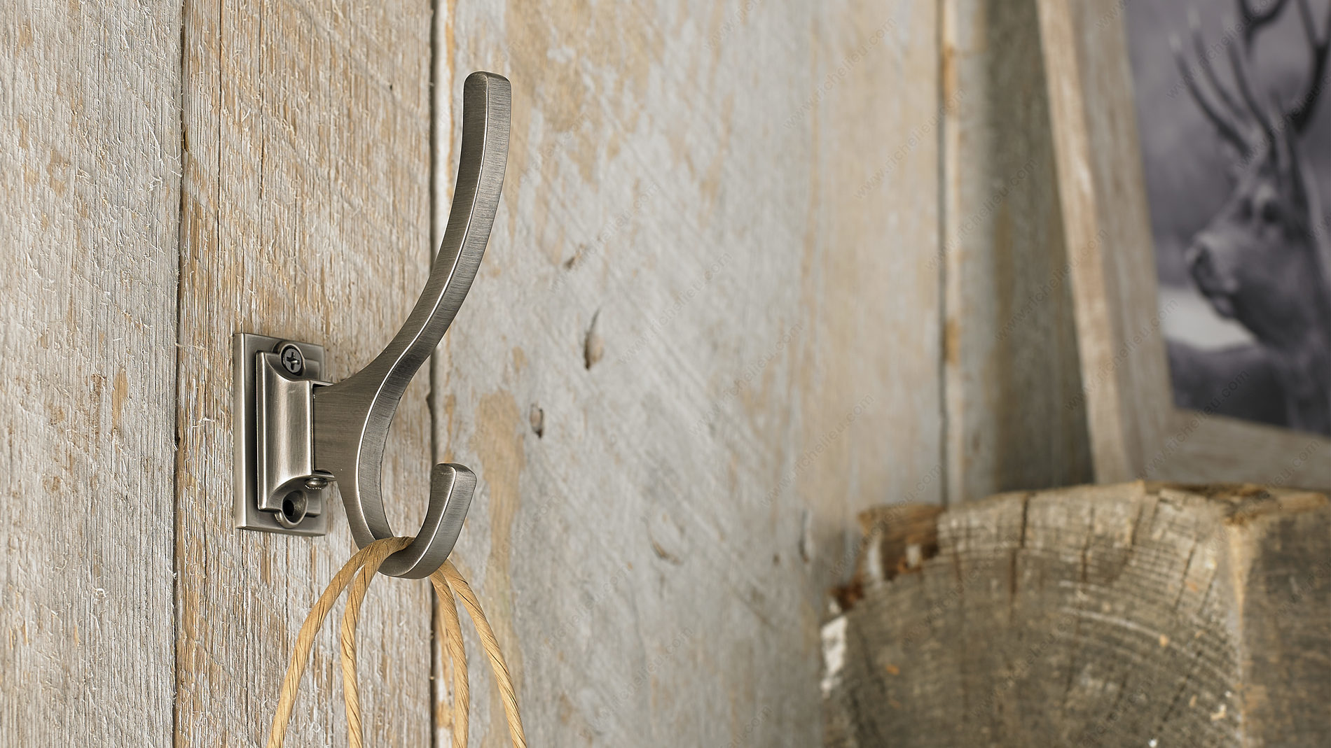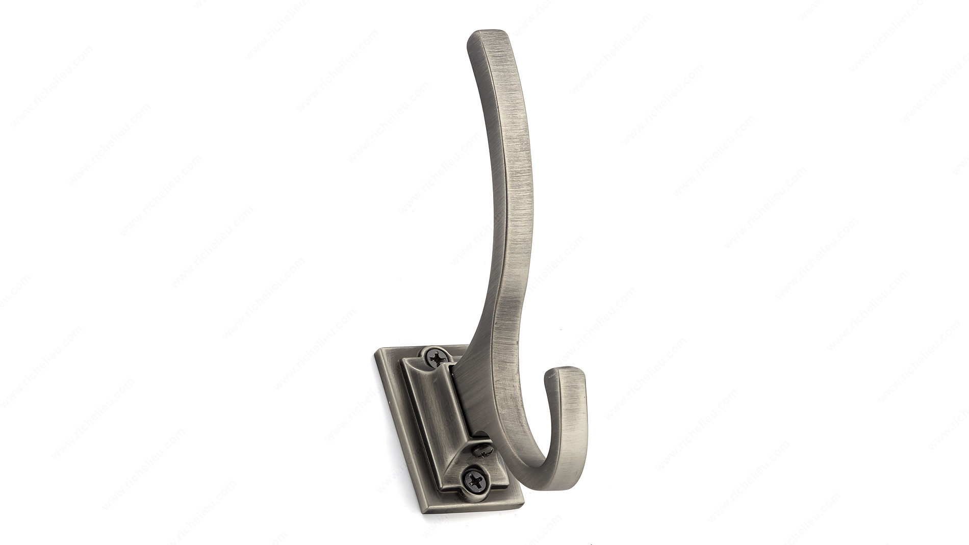 Richelieu RH1233021143 Transitional Metal Hook - 1233 offers an elegant storage solution that seamlessly integrates into any environment. With its stylish antique nickel finish, this dual-arm coat hook not only enhances your décor but also maximizes your hanging capability. The sophisticated lines of the Edward design create a refined aesthetic, making it an ideal choice for various spaces such as bedrooms, bathrooms, entryways, mudrooms, and closets. Measuring 5 inches in height and 1 9/32 inches in width, this double hook can comfortably support a load capacity of up to 22 pounds, ensuring it stands up to daily use. Installation is straightforward, as it can be mounted on both walls and doors, providing flexibility in placement according to your needs. The 3-inch projection allows for efficient use of space without being obtrusive. Each hook comes with the necessary screws and nails for easy setup, making it a convenient addition to your organization solutions. Whether you are looking to declutter or simply add a touch of class to your home, the Richelieu RH1233021143 Transitional Metal Hook is a practical and stylish choice that meets all your storage needs.