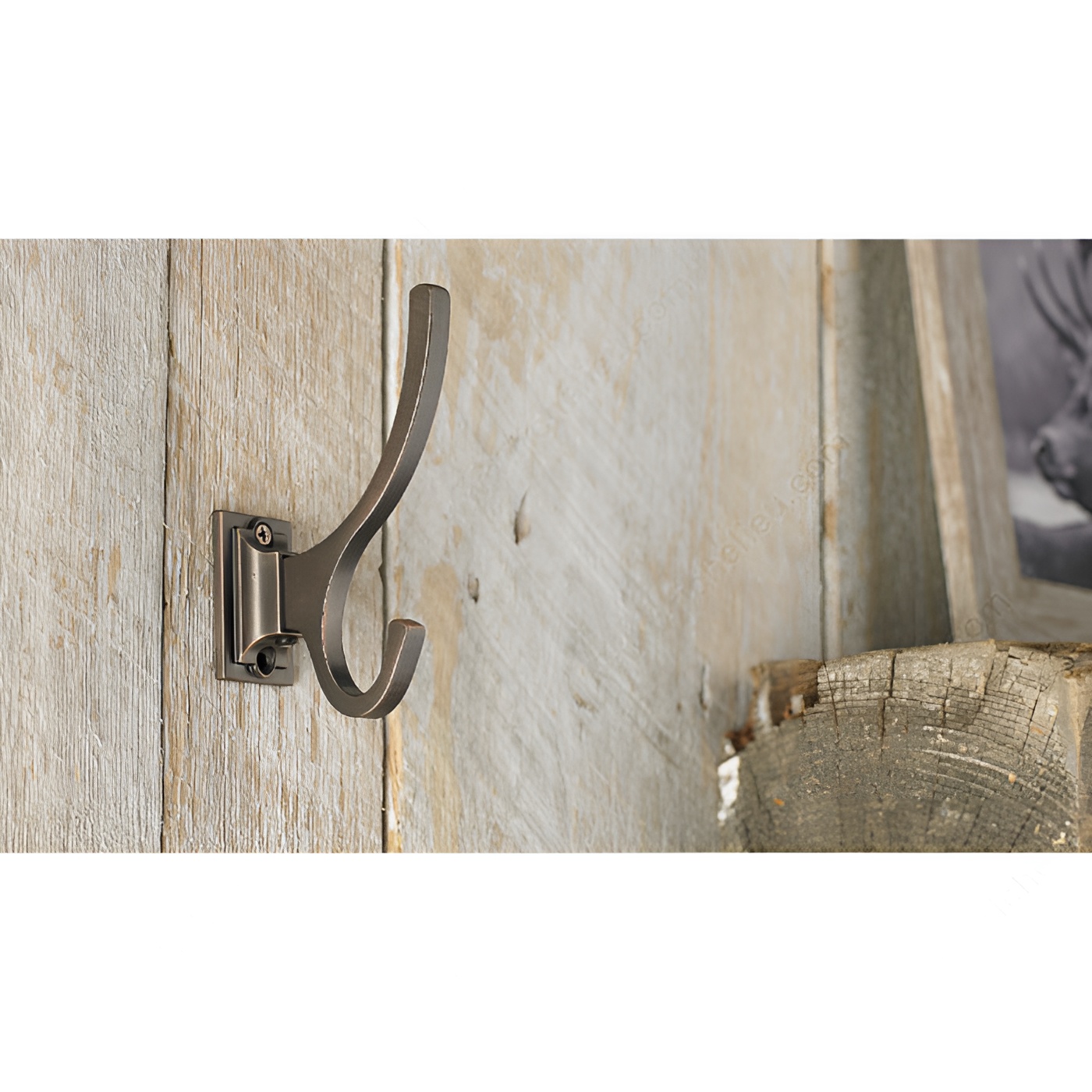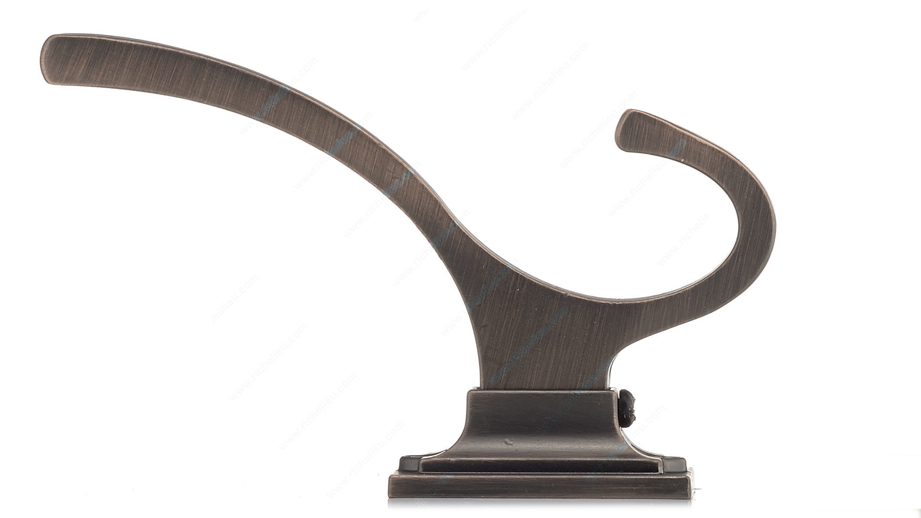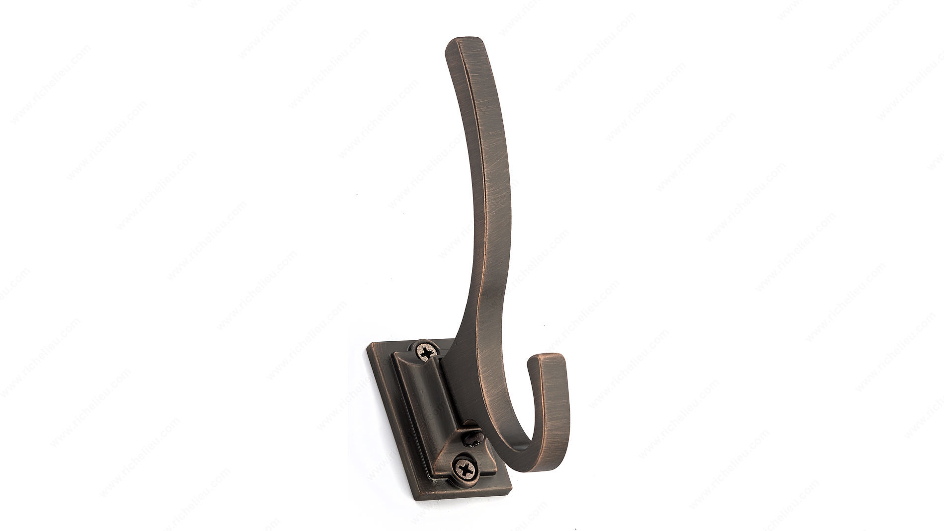 Richelieu RH1233021BORB Transitional Metal Hook - 1233 is the perfect blend of functionality and style, designed to enhance any space. Featuring a brushed oil-rubbed bronze finish, this double hook showcases a sophisticated look that complements a variety of décors. Its dual arm design not only doubles your storage potential but also adds a touch of elegance, making it an ideal choice for bedrooms, bathrooms, entryways, mudrooms, and closets. With overall dimensions of 5 inches in height, 1 9/32 inches in width, and a projection of 3 inches, this hook is compact yet versatile, easily fitting into tight spaces without compromising on utility. The hook's load capacity of 22 pounds ensures it can handle your essentials, from coats to bags, while the included screws provide a hassle-free installation on walls or doors. The transitional style and fluid lines of the Richelieu RH1233021BORB create a refined statement in any room, helping you stay organized while elevating your interior design. Whether you’re looking to declutter or add a decorative touch, this metal hook is a stylish storage solution that meets both aesthetic and practical needs.