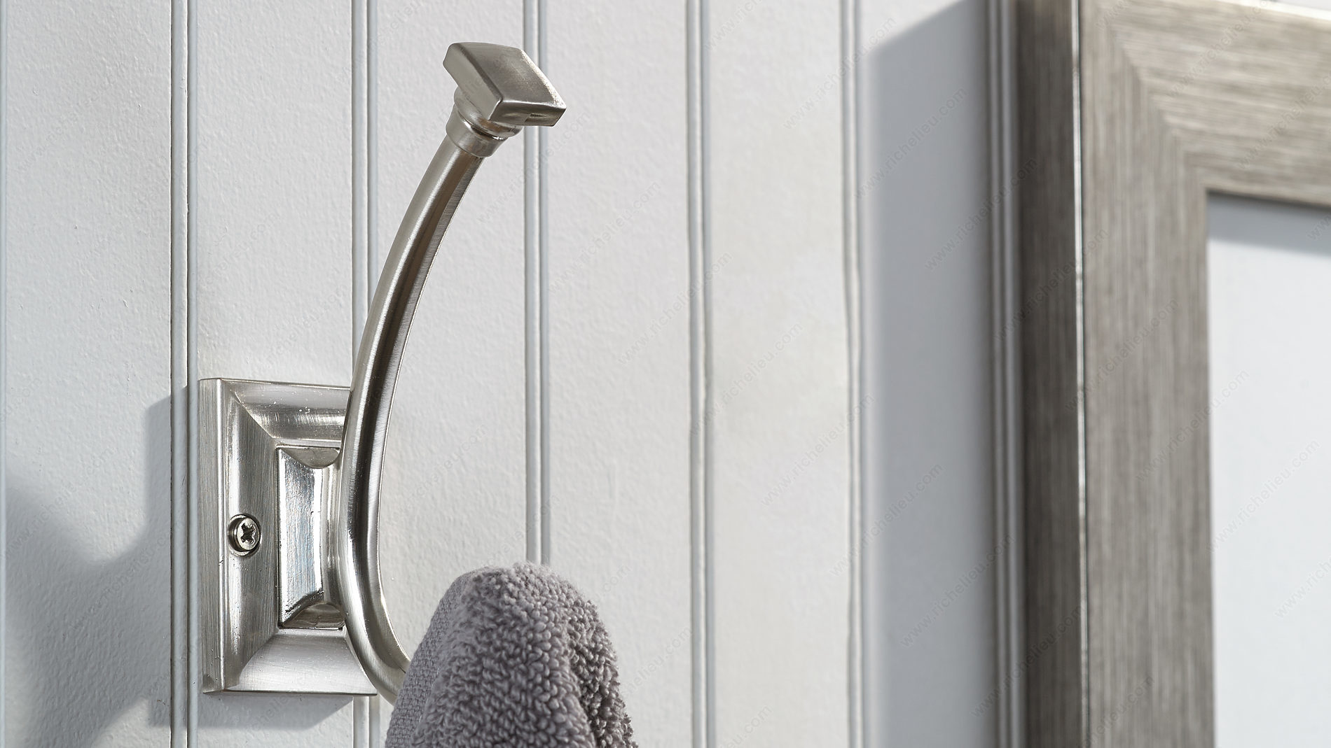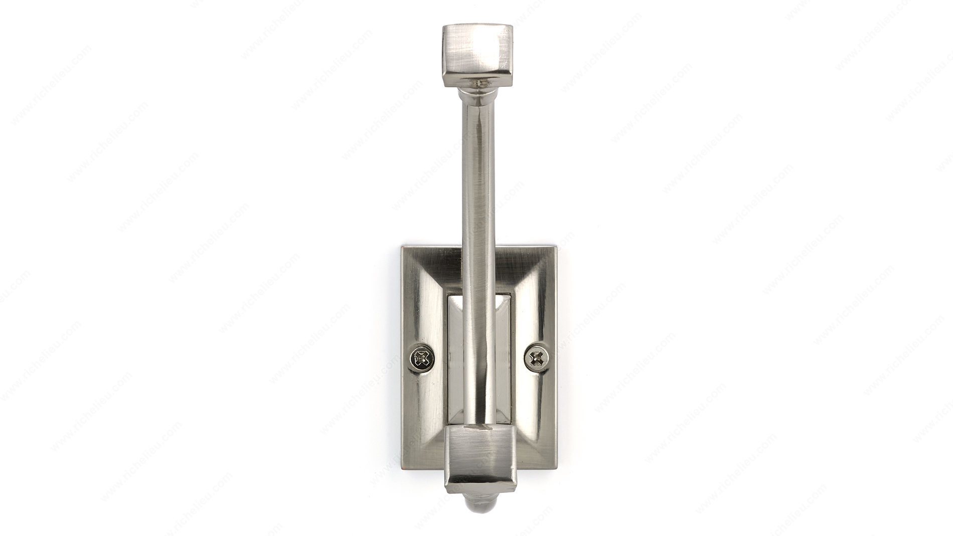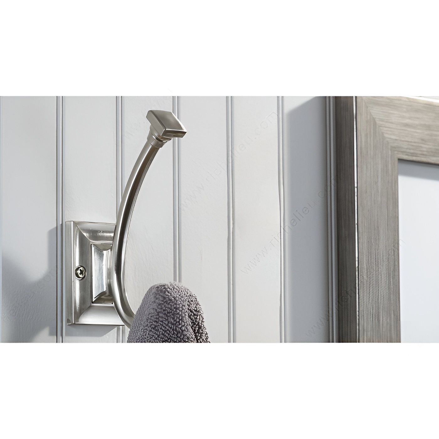 Richelieu RH1243021195 Transitional Metal Hook - 1243 seamlessly blends classic and contemporary design, making it a versatile addition to any space. With its brushed nickel finish, this double hook exudes subtle elegance that enhances both functionality and aesthetics. Measuring 5 9/32 inches in height and 1 3/4 inches in width, it boasts a thoughtful design that accommodates various decor styles. The hook's gray and chrome color palette ensures it complements a wide range of interiors, while the sturdy metal construction provides a robust load capacity of up to 22 pounds, making it perfect for holding coats, bags, or other everyday items. With a center-to-center measurement of 1 1/4 inches and an overall projection of 3 1/8 inches, it is designed for optimal space utilization. Installation is straightforward, as screws are included, allowing for quick and easy setup. Whether you are upgrading your home or outfitting a professional space, the Richelieu RH1243021195 hook is an excellent choice for those seeking functionality without compromising style. Its transitional design and practical features make it an essential accessory for enhancing both organization and decor.