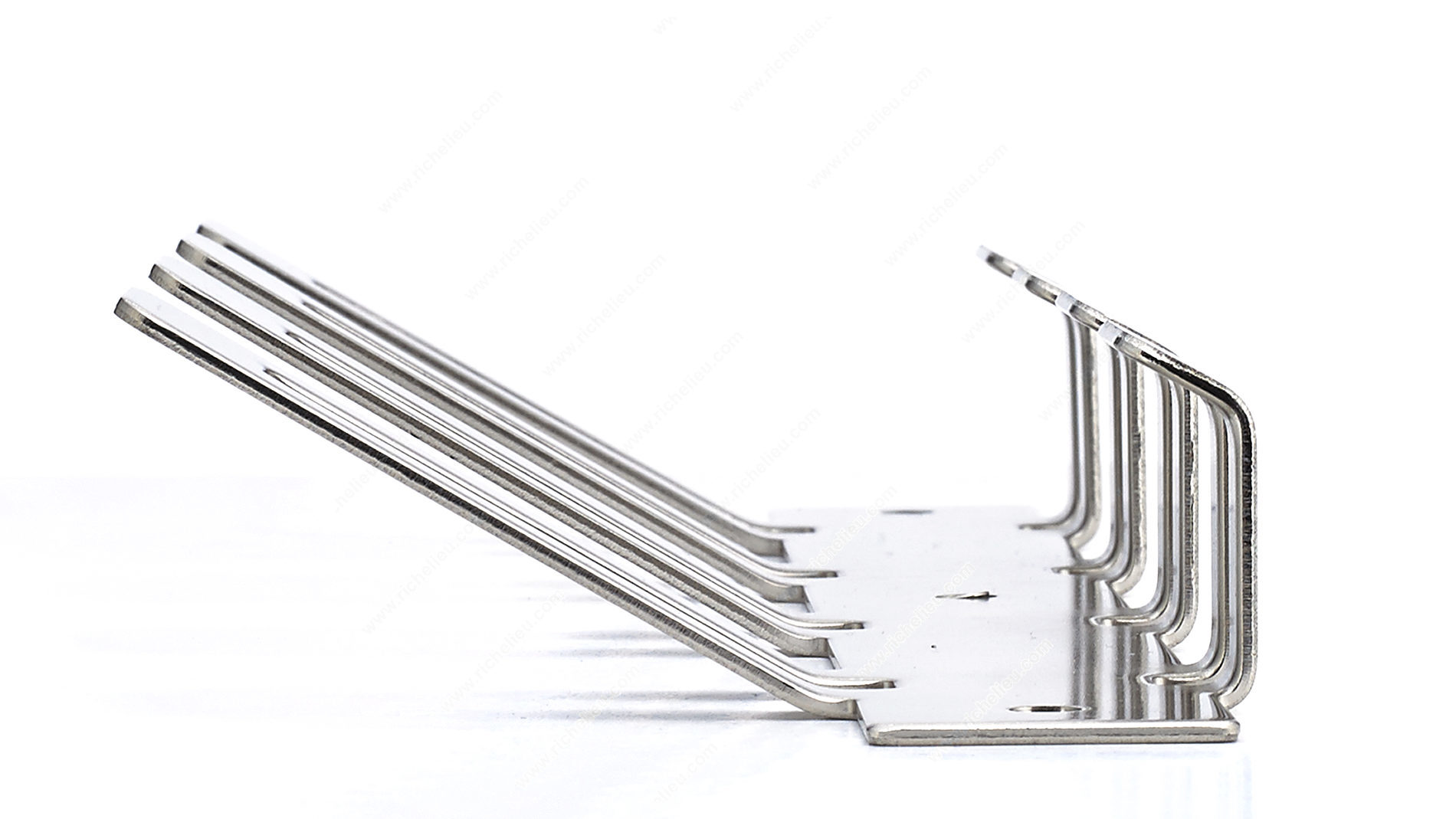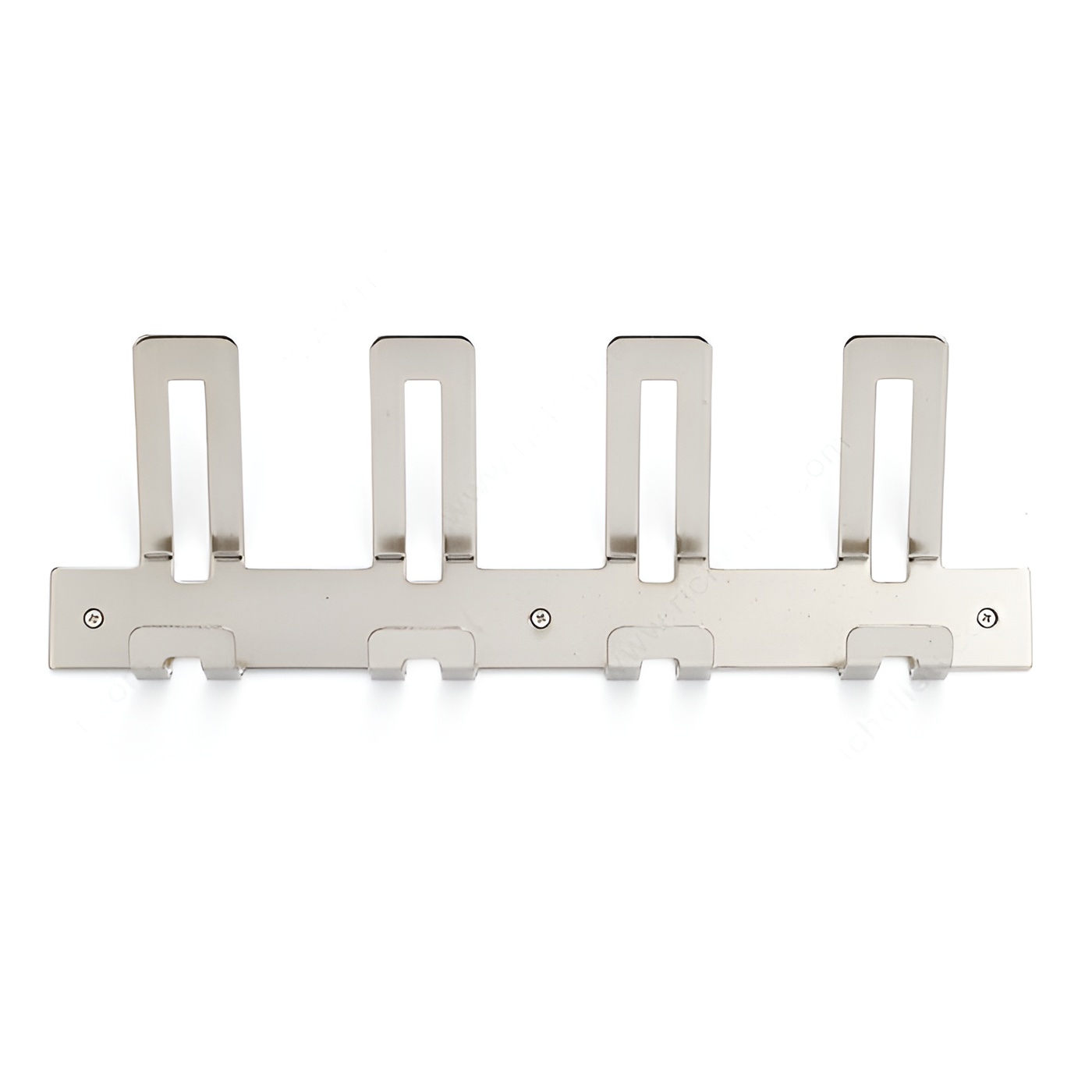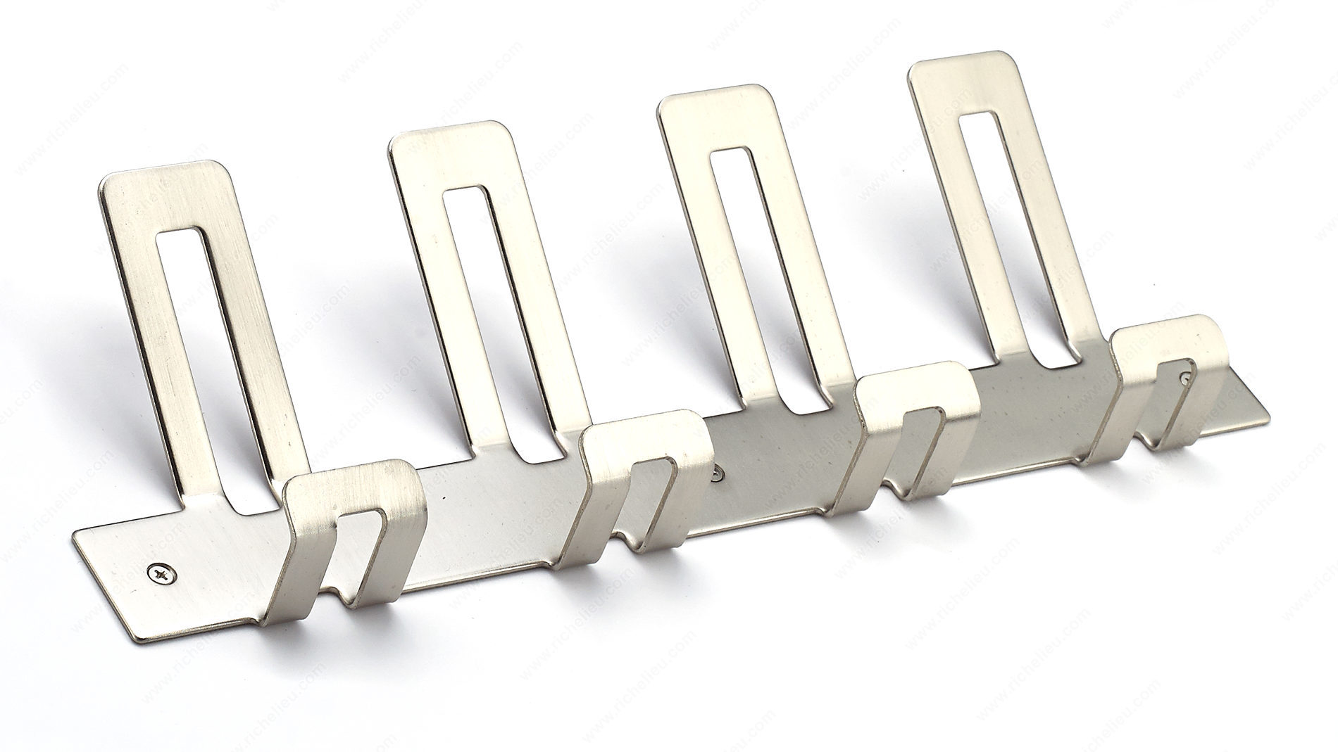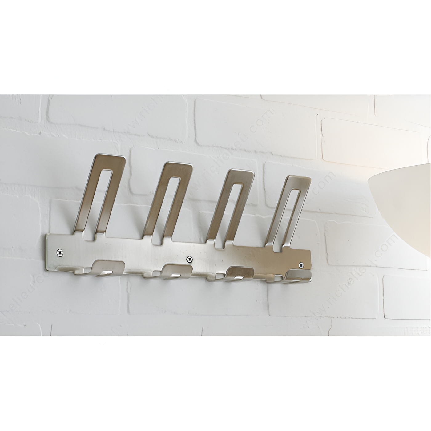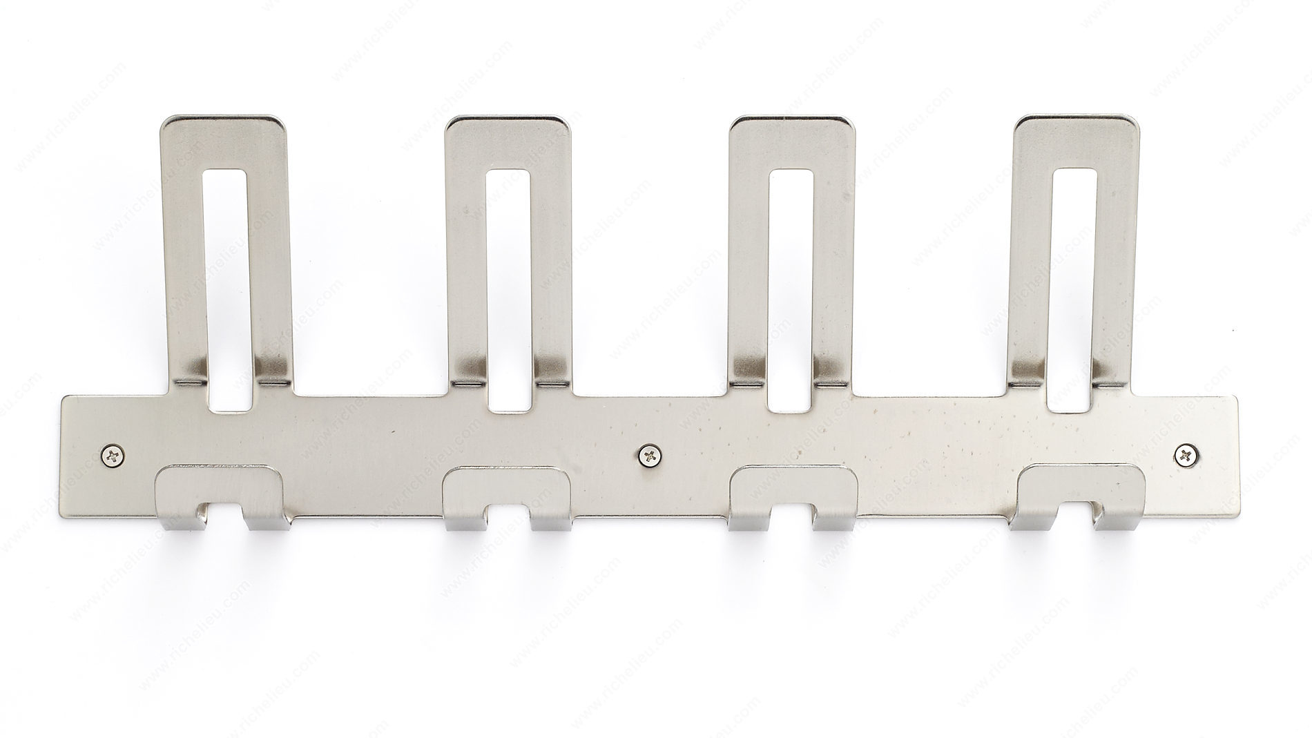 Richelieu RH1432154195 Modern Hook Rack - 1432 is a stylish and functional addition to any contemporary space. Designed with a focus on modern aesthetics, this metal hook rack showcases clean geometric lines and a sleek brushed nickel finish that complements various interior styles. Measuring 15 1/8 inches in width and 5 1/32 inches in height, it features multiple hooks that provide ample space for hanging items, accommodating a load capacity of up to 22 pounds. The hook style is both modern and versatile, making it an ideal choice for entryways, bathrooms, or kitchens. With a projection of just 1 15/16 inches, it’s designed to save space while remaining practical. Installation is straightforward, as screws are included for easy mounting. The brushed nickel finish not only adds a touch of elegance but also ensures durability, resisting tarnish over time. The color palette of gray and chrome enhances its contemporary appeal, ensuring it blends seamlessly with existing decor. This hook rack is shipped via UPS, allowing for convenient delivery. Elevate your storage solutions with the Richelieu RH1432154195 Modern Hook Rack, where functionality meets refined design.
