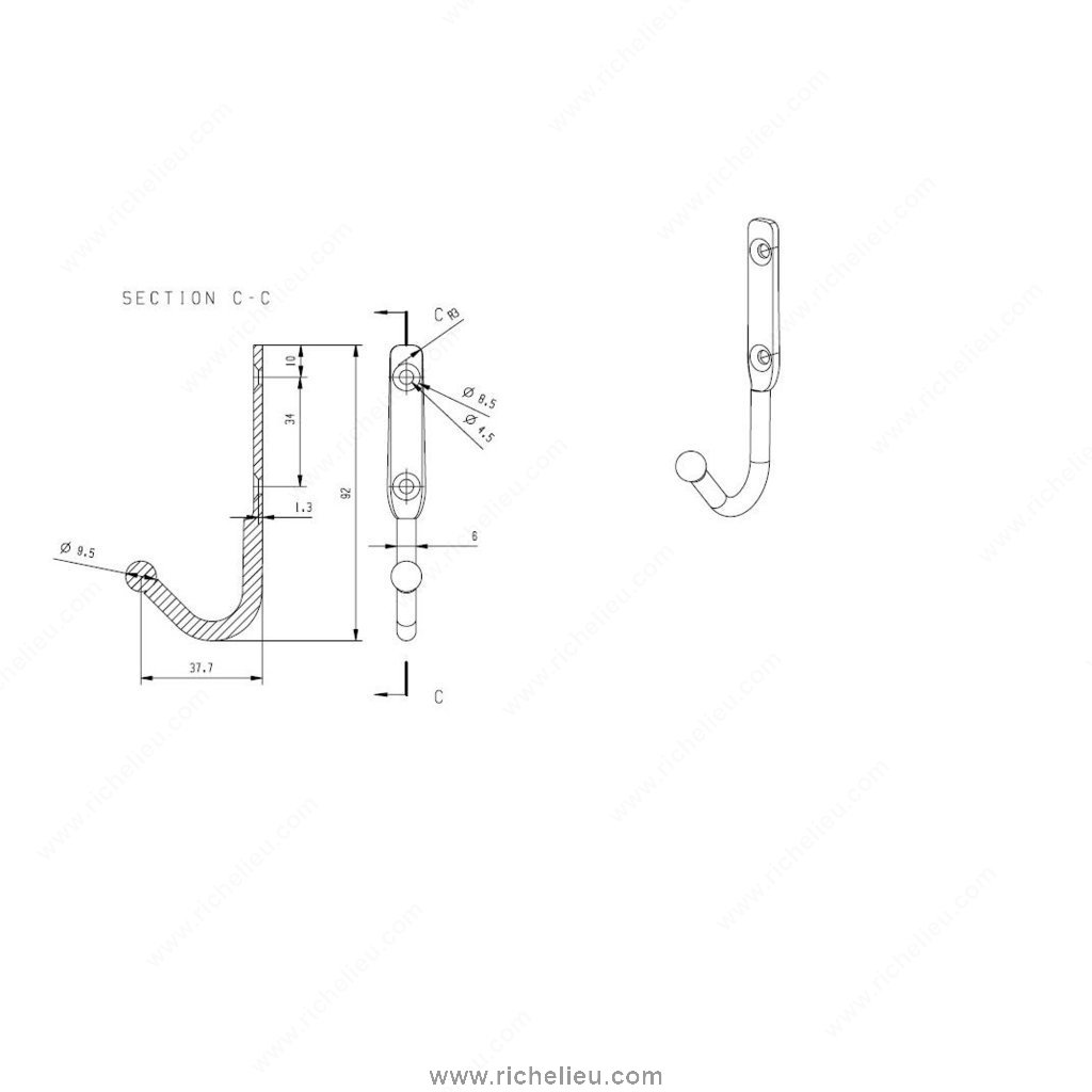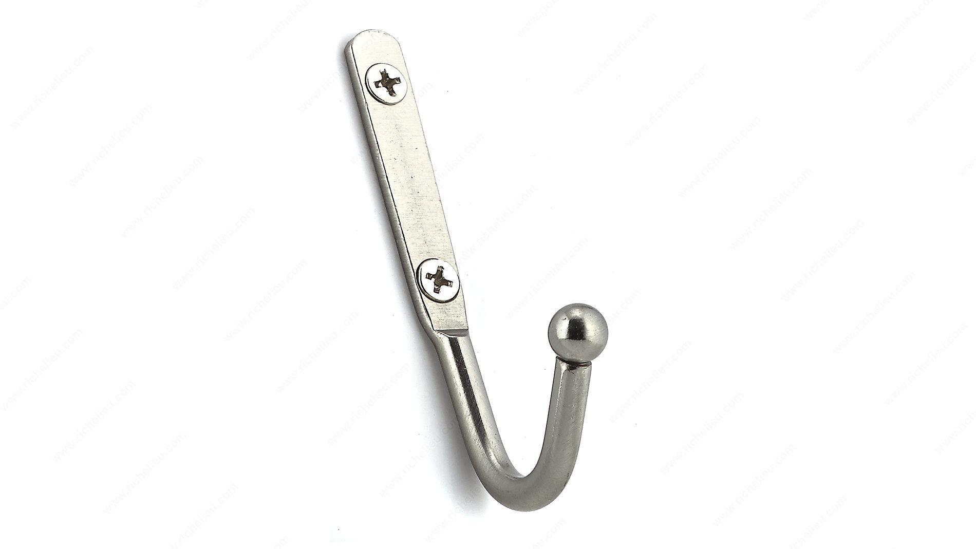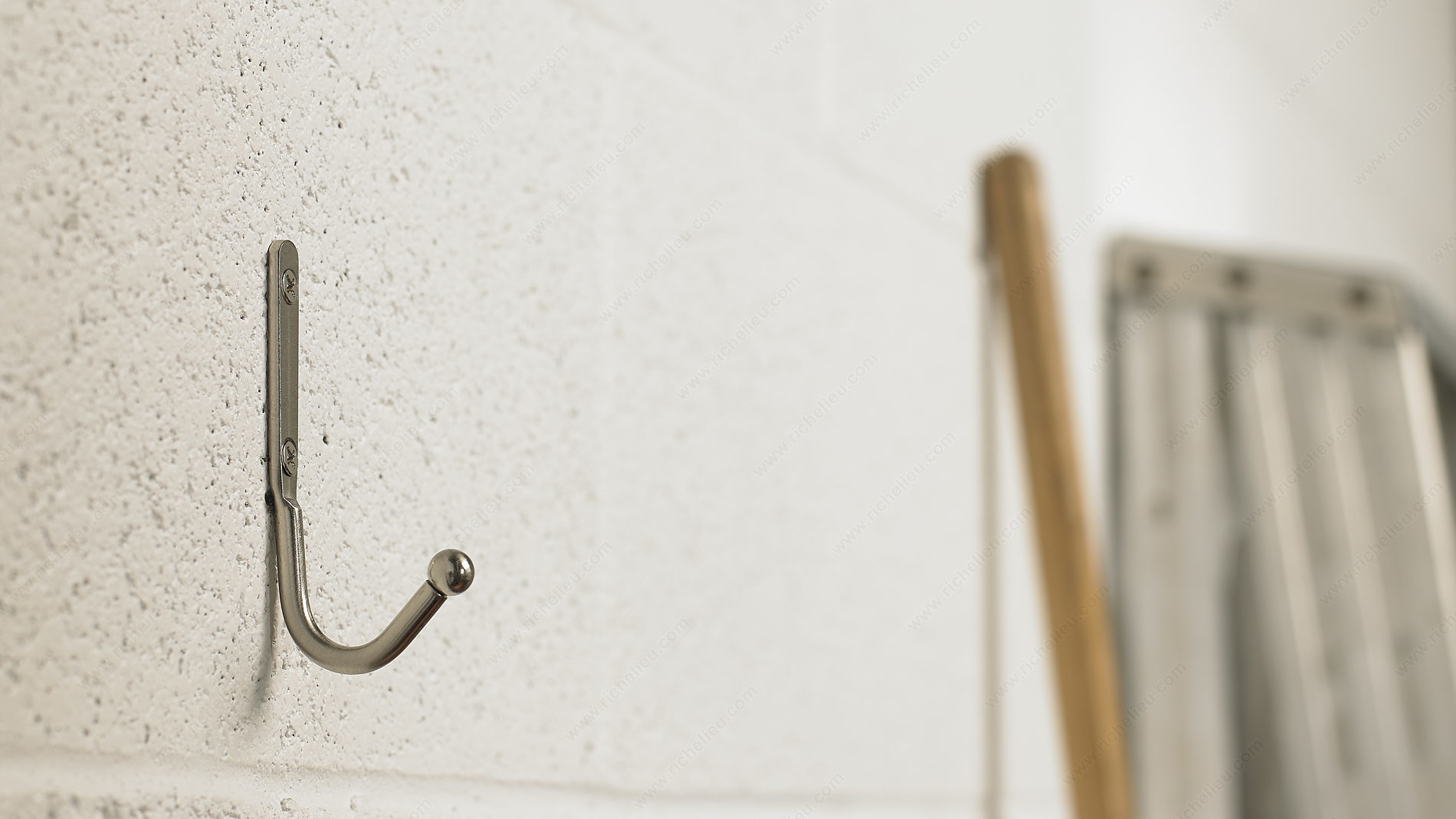 Richelieu RH3313301195 Utility Metal Hook - 33 is the perfect solution for organizing your space, particularly in sheds or tool rooms where efficiency is key. Designed with simplicity in mind, this utility hook offers robust functionality without sacrificing style. The hook, crafted from durable metal, features a brushed nickel finish that adds a modern touch while ensuring longevity. With an overall height of 3 5/8 inches and a projection of 1 15/32 inches, the hook is compact yet capable of handling a load capacity of up to 11 pounds. It is essential to mount the hooks directly to wall studs, typically located 16 inches apart, for maximum strength. Alternatively, appropriate drywall anchors (not included) can be used if mounting to studs is not feasible. The package includes screws for straightforward installation. The hook boasts a center-to-center measurement of 1 11/32 inches, making it versatile for various applications. Available in a gray and chrome color combination, it blends seamlessly into any environment. Whether you need it for tools, gear, or other hanging items, the Richelieu Utility Metal Hook is a reliable choice for maintaining an organized space.