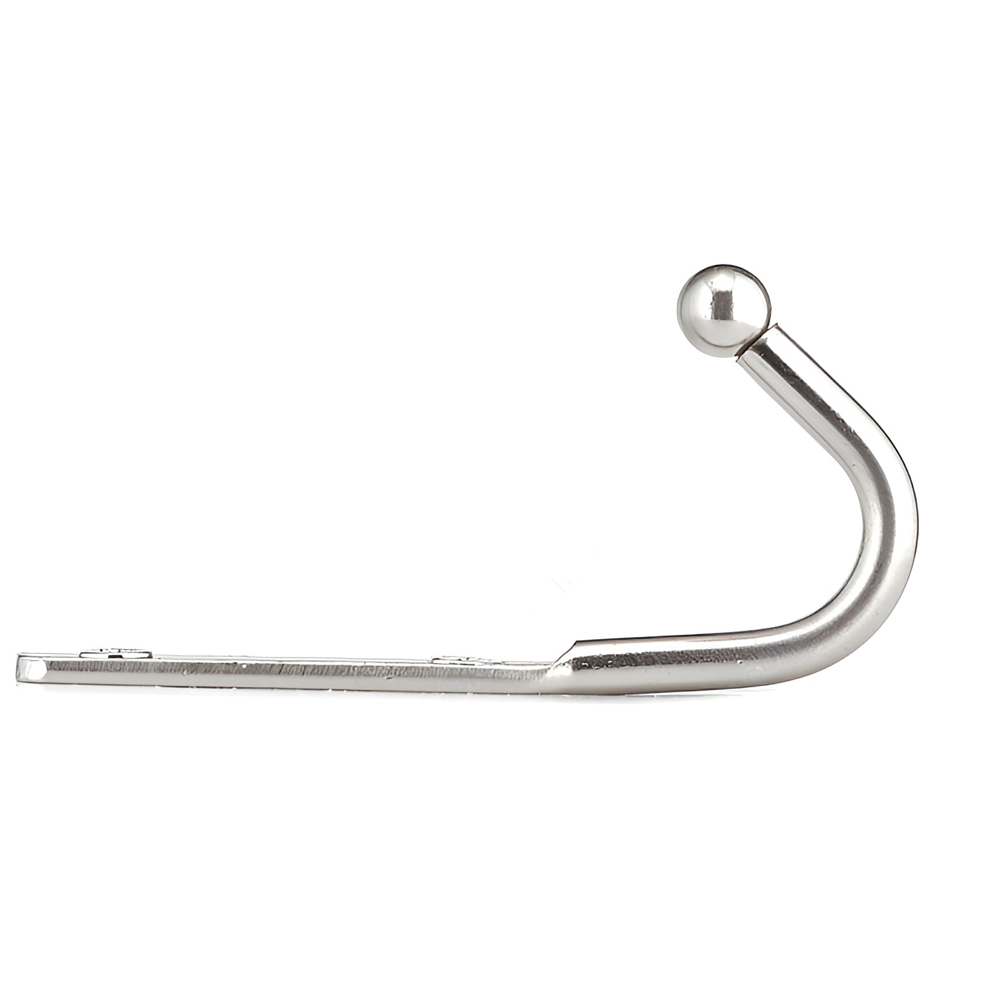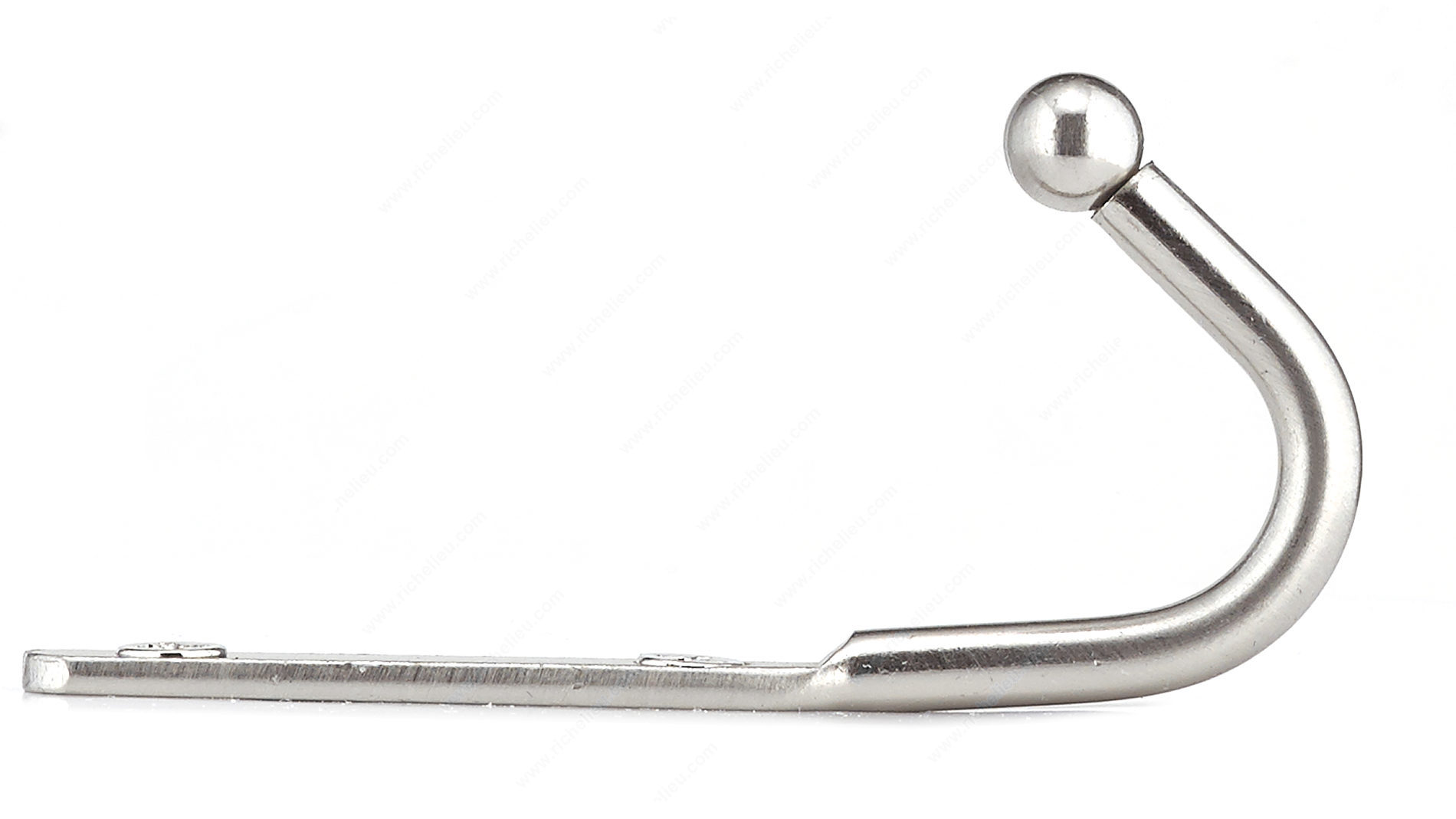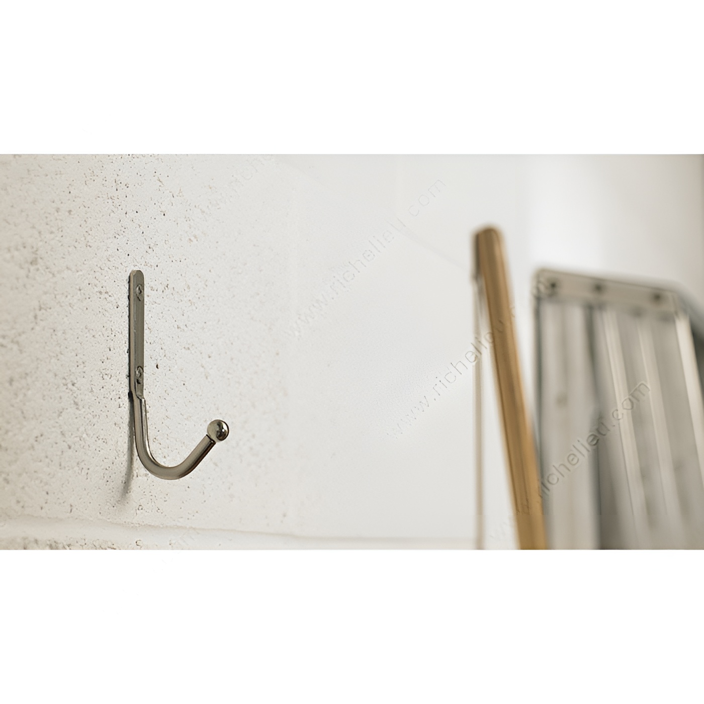 Richelieu RH3313301195 Utility Metal Hook - 33 is the perfect solution for organizing your space, particularly in sheds or tool rooms where efficiency is key. Designed with simplicity in mind, this utility hook offers robust functionality without sacrificing style. The hook, crafted from durable metal, features a brushed nickel finish that adds a modern touch while ensuring longevity. With an overall height of 3 5/8 inches and a projection of 1 15/32 inches, the hook is compact yet capable of handling a load capacity of up to 11 pounds. It is essential to mount the hooks directly to wall studs, typically located 16 inches apart, for maximum strength. Alternatively, appropriate drywall anchors (not included) can be used if mounting to studs is not feasible. The package includes screws for straightforward installation. The hook boasts a center-to-center measurement of 1 11/32 inches, making it versatile for various applications. Available in a gray and chrome color combination, it blends seamlessly into any environment. Whether you need it for tools, gear, or other hanging items, the Richelieu Utility Metal Hook is a reliable choice for maintaining an organized space.