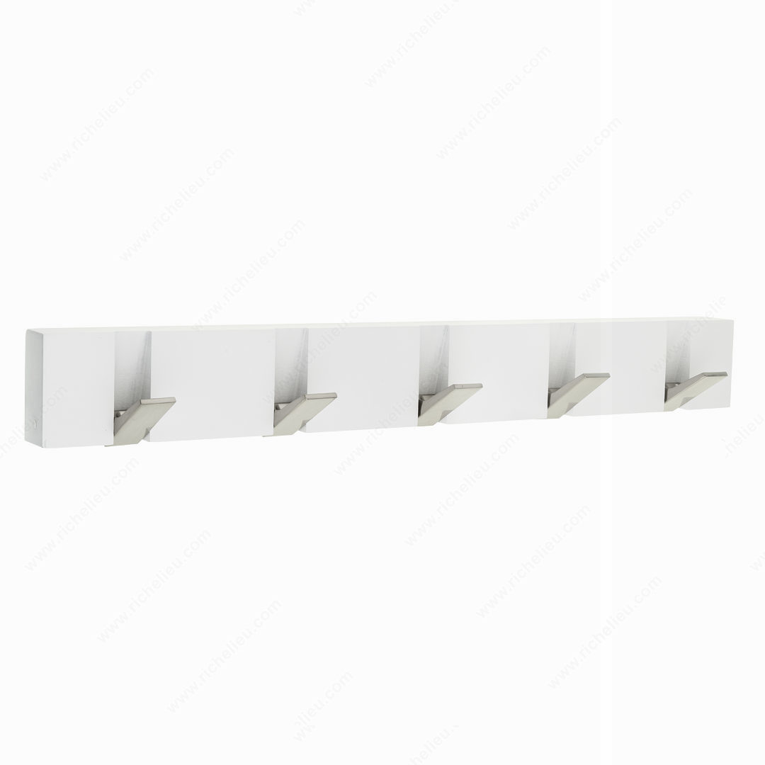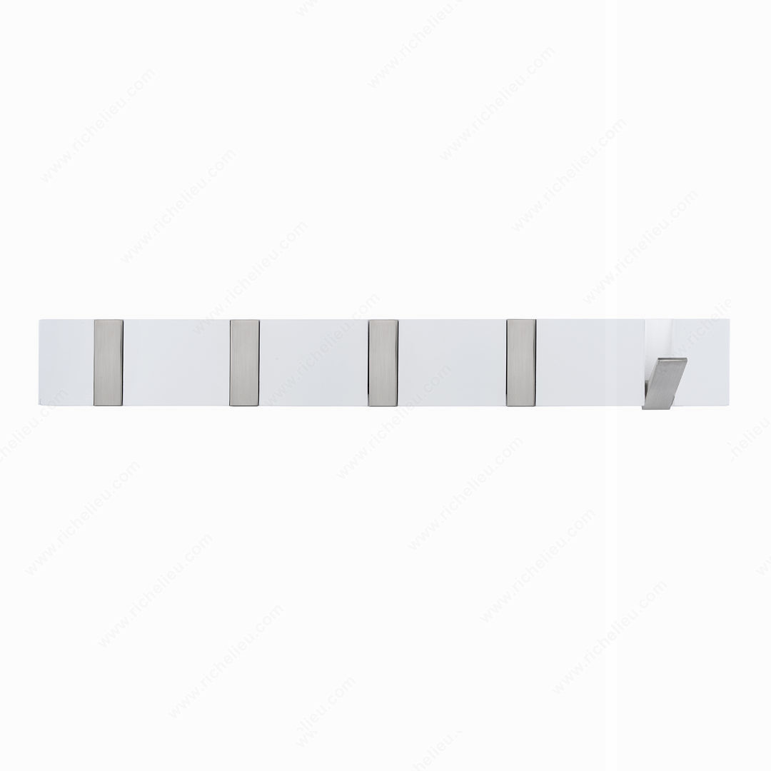 Richelieu RH80081104195 Modern Hook Rack - 8008 offers a sleek and practical solution for organizing your space. Designed with a transitional style in mind, this versatile hook rack features multiple swivel hooks that provide flexibility for hanging various items, from coats to accessories. Crafted from durable wood and steel, it combines aesthetic appeal with substantial functionality. This model showcases a crisp white finish paired with brushed nickel accents, making it an ideal addition to contemporary or classic interiors. With overall dimensions of 20 inches in width, 2 11/16 inches in height, and a projection of 2 25/32 inches, it fits snugly in entryways, hallways, or mudrooms without taking up excessive space. The hook rack supports a load capacity of up to 22 pounds, ensuring it can handle everyday items effortlessly. Installation is straightforward, as screws are included, facilitating a hassle-free setup. Part of Richelieu's new collection, RH80081104195 not only enhances organization but also contributes to the overall aesthetic of your home. Whether you're a building professional or a knowledgeable homeowner, this hook rack embodies quality and style, making it a valuable addition to any space.