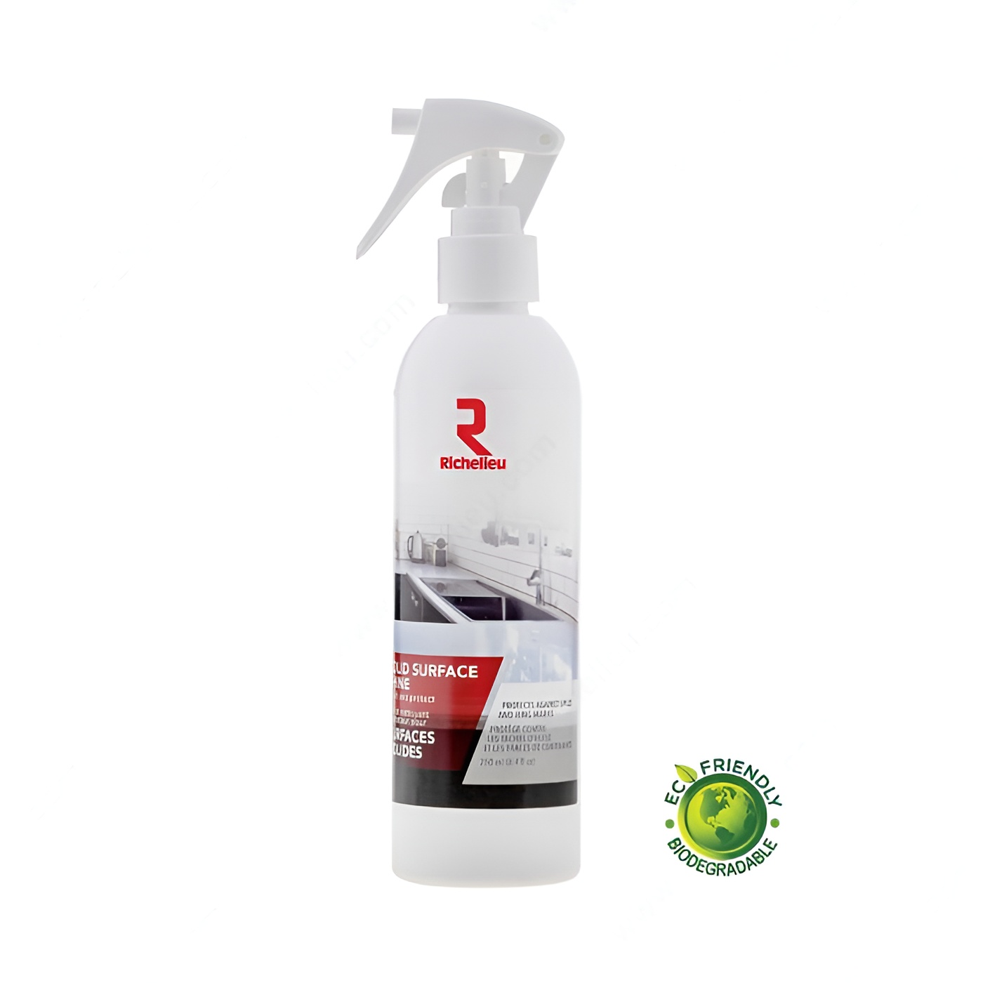 Richelieu 921434 Solid Surface Countertop Shine is a specialized protective cleaner and polish designed specifically for solid surface countertops. Formulated to condition and enhance the appearance of your countertops, this product ensures a streak-free, long-lasting shine with regular application. By using the Solid Surface Shine weekly, you not only maintain the aesthetic appeal of your surfaces but also create a protective barrier that guards against spills, ring marks, and everyday wear. This ready-to-use polish is ideal for anyone looking to keep their solid surface countertops in pristine condition. It is recommended to use it in conjunction with Richelieu's Solid Surface Countertop Cleaner to achieve optimal results. Together, these products work harmoniously to provide comprehensive care and maintenance for your countertops, ensuring they remain beautiful and functional over time. With the convenience of shipping via UPS, Richelieu 921434 Solid Surface Countertop Shine is easy to incorporate into your regular cleaning routine. Elevate the durability and beauty of your solid surface countertops with this essential product that combines protection and shine in one simple application. Make caring for your countertops a breeze while maintaining their elegant appearance.