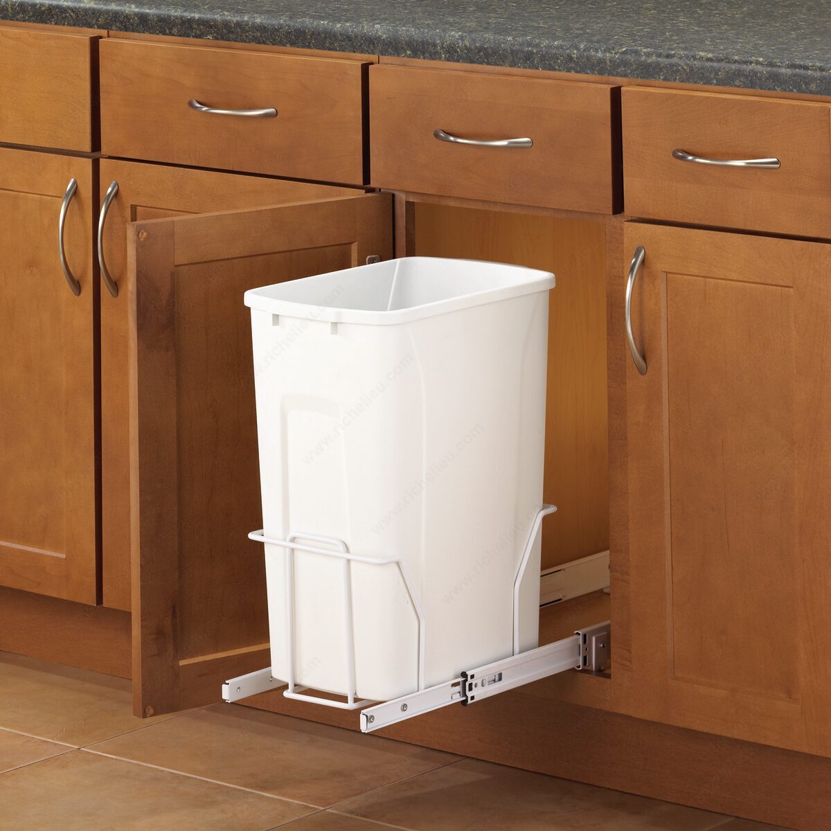 Richelieu SBM12150WH Bottom-Mount Waste Recycling Center offers an effective and efficient solution for managing waste and recycling in your kitchen or workspace. This pull-out recycling center is designed with epoxy-coated slides, ensuring smooth and easy access to your recycling bin whenever you need it. The high-capacity slides provide stable and solid movement, accommodating up to 50 quarts of waste. Pre-assembled for your convenience, the system includes a robust wire frame and all necessary mounting screws, simplifying the installation process. With dimensions of 20 1/8 inches in depth, 22 7/8 inches in height, and 11 3/8 inches in width, it fits seamlessly into spaces that require a tidy waste management solution. The unit is constructed from durable plastic, which not only ensures longevity but also supports a substantial load rating of 80 pounds. This recycling center is finished in a clean white, blending well with various kitchen decors. While a lid is not included, the design allows for easy access and maintenance. Ideal for storage and cleaning tasks, the Richelieu SBM12150WH is a practical addition that promotes an organized and environmentally friendly approach to waste disposal.