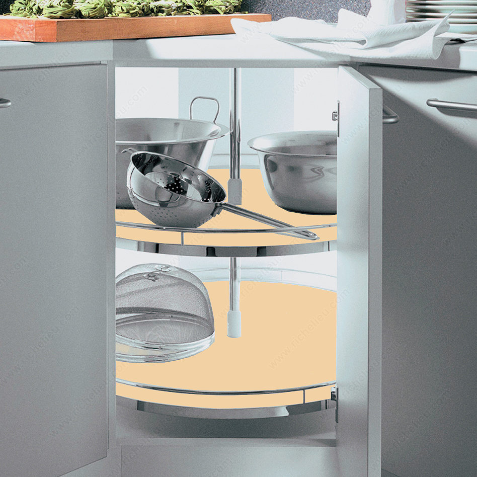 Richelieu 671424140150 Set of 2 Round Pivoting Trays offers a seamless blend of functionality and modern design, making it an ideal choice for food storage, preparation, and organization. Featuring elevated chrome railings and non-slip surfaces, these trays ensure that your items stay securely in place, while also adding a touch of elegance to your kitchen or storage area. Each tray boasts a generous capacity of 44.1 lbs, allowing you to store a variety of items with ease. Designed to fit within interior dimensions of 28 1/2 to 30 1/8 inches in height, these trays are perfect for corner cabinets, maximizing your space efficiently. The melamine and chrome materials not only enhance durability but also facilitate easy cleaning, ensuring that your trays maintain their sleek appearance over time. With a diameter of 29 1/2 inches, the trays provide ample surface area for all your storage needs. This set of two is a smart investment for anyone looking to upgrade their kitchen organization while keeping style in mind. Elevate your home with Richelieu's pivoting trays-where innovation meets practicality.