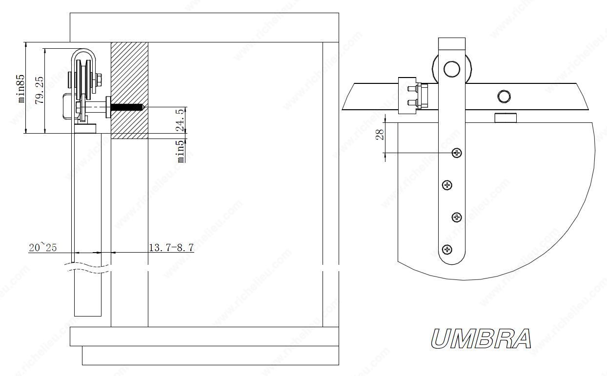 Richelieu WEBKIT1216629 UMBRA Mini Barn Door Sliding SystemRichelieu WEBKIT1216629 UMBRA Mini Barn Door Style Sliding System is a versatile solution for enhancing both functionality and aesthetics in your home. This top-running decorative sliding system is designed for mini barn-style doors, accommodating weights of up to 55 lb (25 kg). Crafted with quiet ball bearing wheels, it ensures smooth operation while adding a touch of rustic charm. The UMBRA system is suitable for various applications, including kitchen islands, bathroom vanities, TV cabinets, bookshelves, and credenzas. It supports door thicknesses ranging from 3/4 in (20 mm) to 1 in (25 mm), allowing for a customized fit. Available in a sleek matte black finish, the hardware and flat rail are not only stylish but also durable, making them perfect for everyday use. For biparting applications, keep in mind that two tracks are required, as there is no connector included. The system allows for a maximum door height of 66 in and a width of up to 36 in, providing ample coverage for your spaces. With its full overlay door position, the UMBRA system combines practicality with a contemporary design, making it an ideal choice for any modern home.
