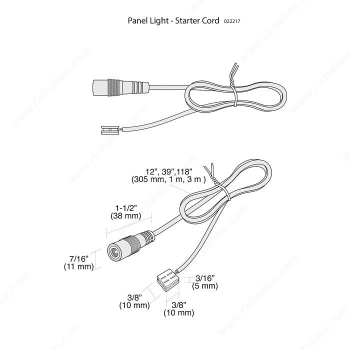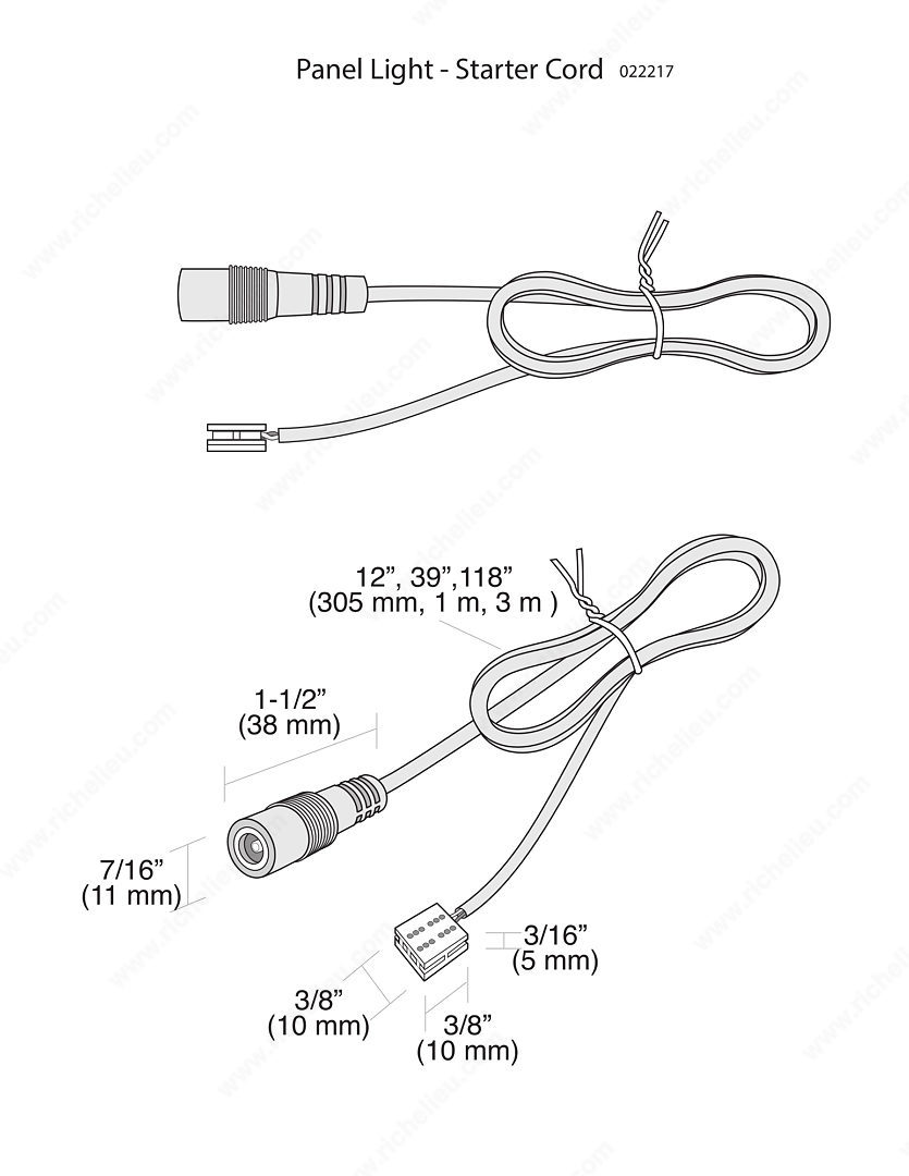 Richelieu LSPPKT3M SNAP Light Panel Starter Cord serves as an essential component for your lighting solutions. Designed specifically to connect snap panels to a 24V power supply, this starter lead ensures a seamless and efficient setup for your lighting projects. With a generous length of 118 inches, it provides ample reach, allowing for versatile installation options in various settings. This starter cord is ideal for those looking to create a professional-grade lighting system, whether in residential or commercial spaces. The straightforward design simplifies the process of integrating snap panels, making it a reliable choice for building professionals and knowledgeable homeowners alike. An important note for shipping: the LSPPKT3M is shipped via common carrier only, as it is not eligible for UPS delivery. This ensures that your product arrives safely and in a timely manner, ready for installation. With its robust construction and practical design, the Richelieu LSPPKT3M SNAP Light Panel Starter Cord is a must-have for anyone looking to enhance their lighting experience. Invest in quality and functionality with this essential accessory that delivers both performance and ease of use.